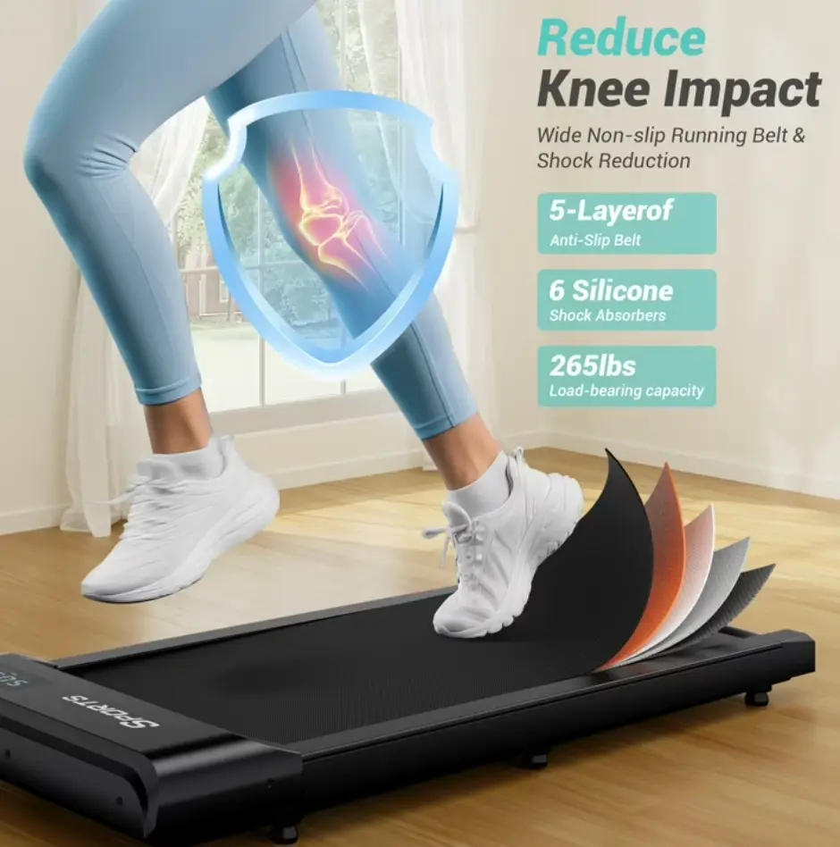 ·【Anti-Slip Running Belt & Shock Absorption System】: This under-desk treadmill features a 5-layer anti-slip, wear-resistant running belt with a wide anti-slip surface and shock-absorbing design. Six built-in silicone shock absorbers effectively absorb impact and reduce noise, making your run quieter and smoother while minimizing body impact. This protects your knees, muscles, and joints during running, delivering a more comfortable and safe running experience.