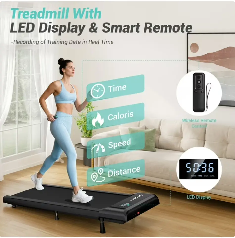 ·【Real-Time LED Display & Remote Control】The treadmill features a bright LED display that tracks your workout data in real time, clearly showing time, speed, distance, and calories burned for a clear understanding of your progress. It also comes with a convenient remote control, allowing you to adjust speed and start/stop the treadmill without interrupting your workout.