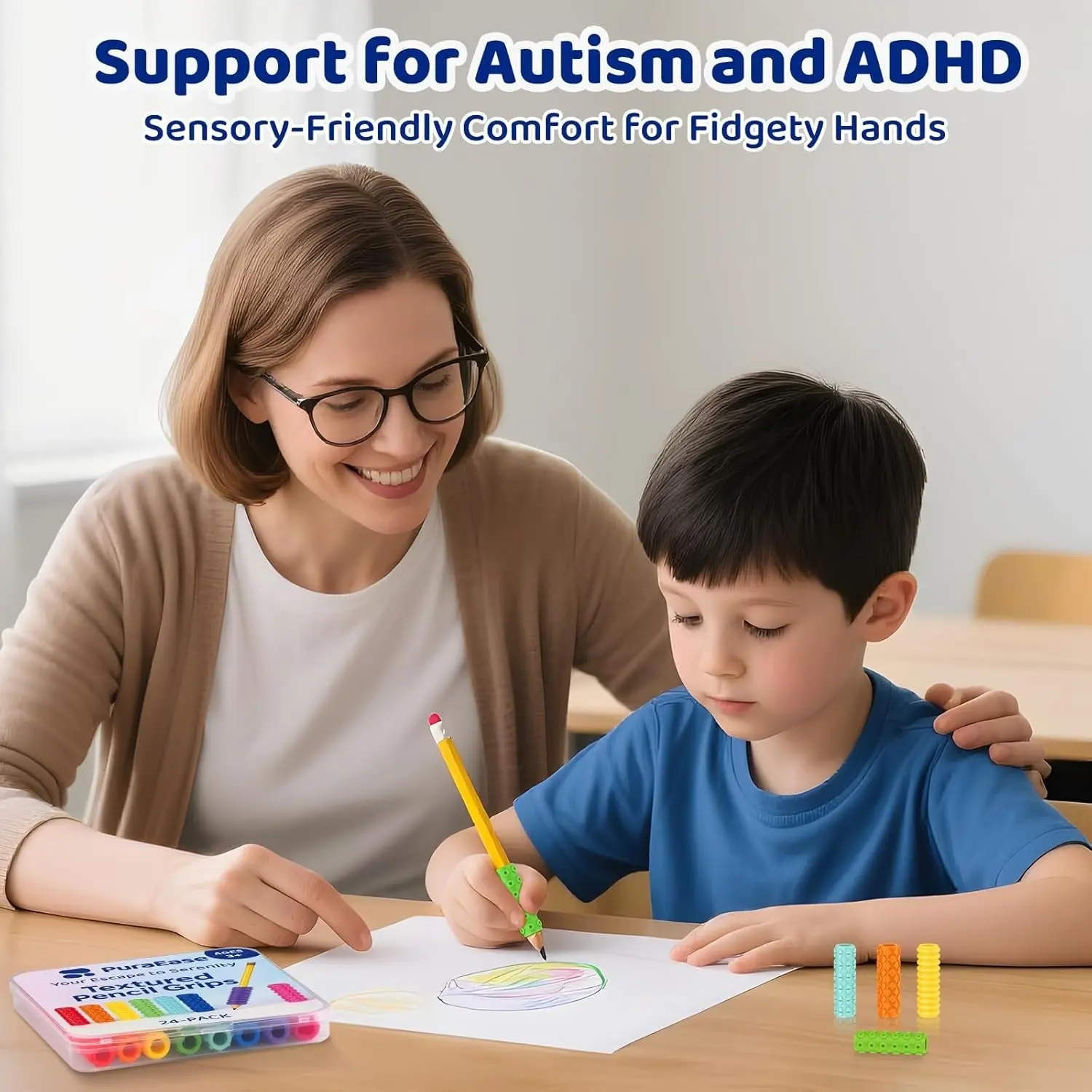 【Calming Support for Sensory Needs】Designed for kids, teens & adults with autism, ADHD, or anxiety, these textured grips provide gentle tactile input to reduce stress and improve focus. A great tool for teachers, therapists, or parents seeking to reduce nervous habits like nail biting, skin picking, or pencil chewing.