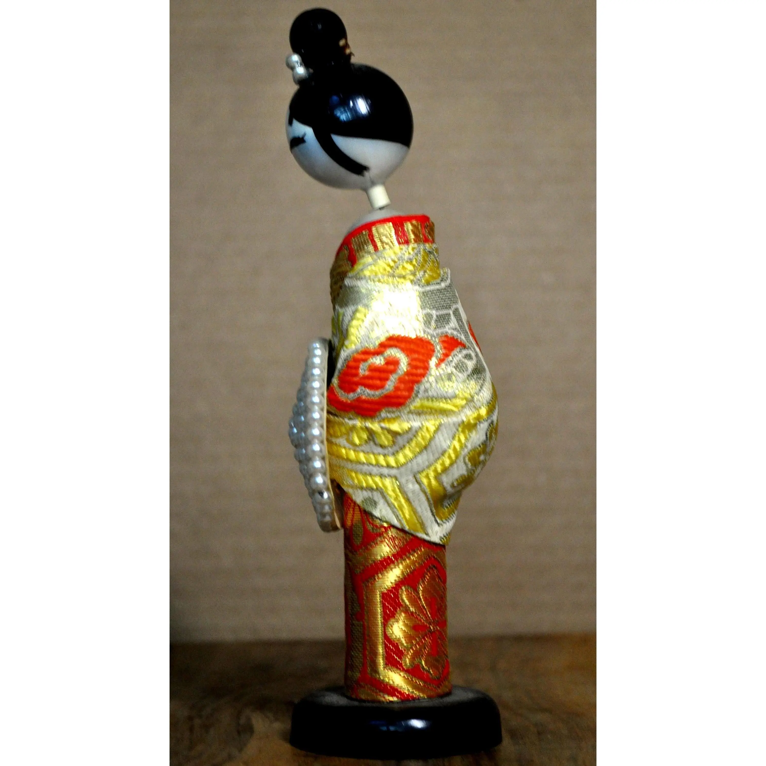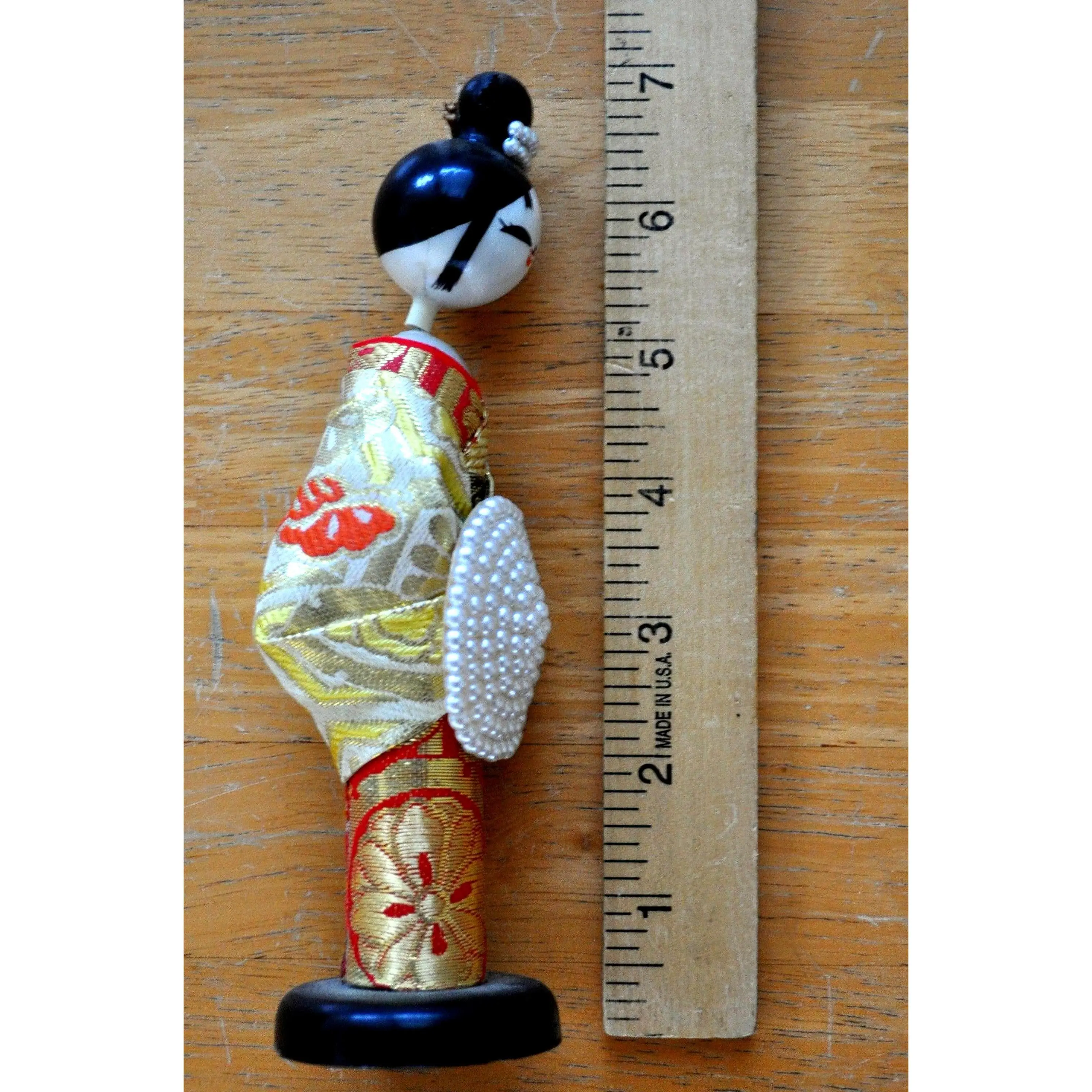 This listing is for the Antique Japanese Kokeshi Doll Hand Painted Faux Pearls. This is a lightweight doll. Her clothing is wrapped over a Styrofoam body, and she sits on a plastic base. She is approximately 10” tall with a 2.5” diameter at the base. She is adorned with faux pearls and hand-painted details. Great Find!
