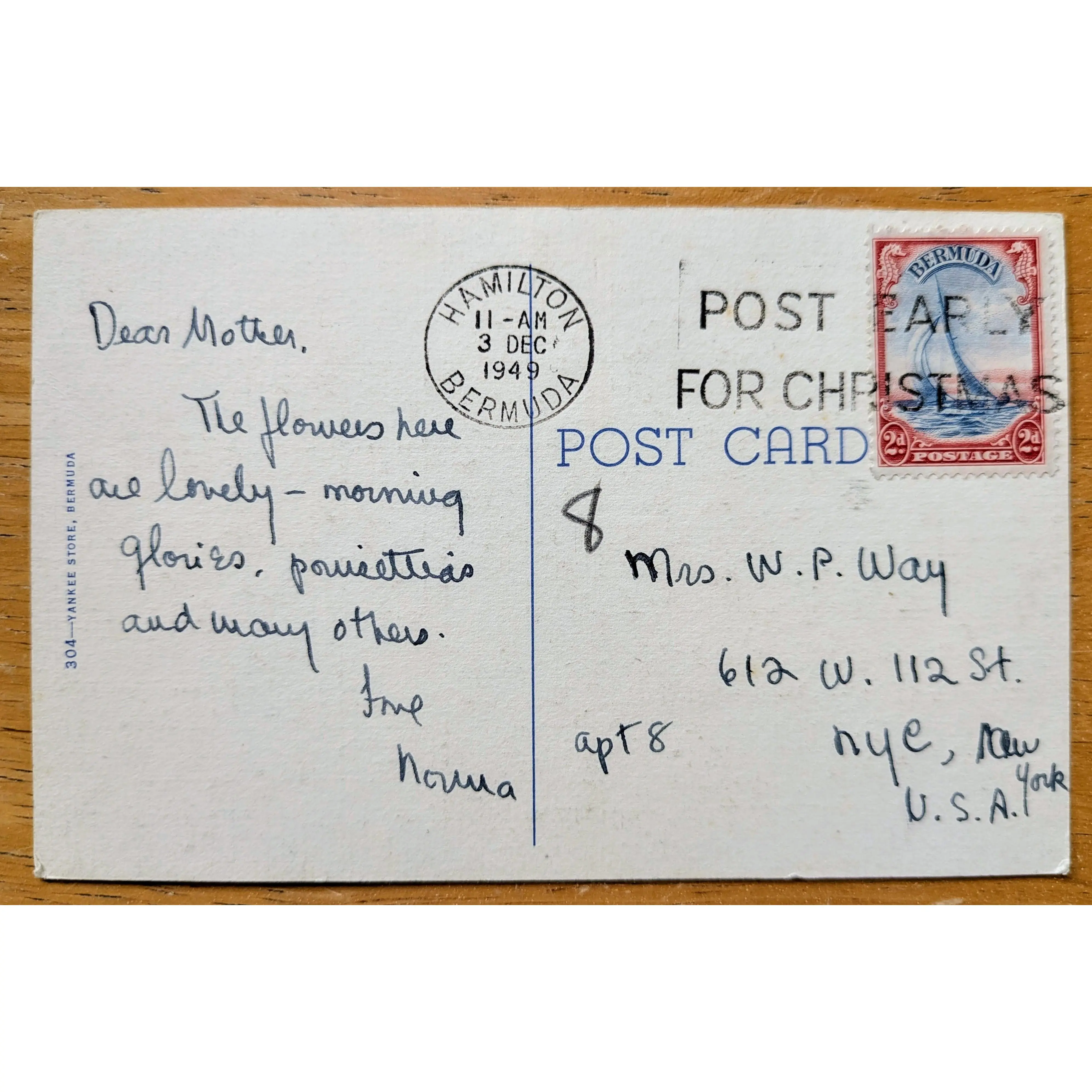 This listing features an Antique 1949 Colorful A Corner in Paget, Bermuda Linen Postcard. Interesting textured front, known as a 'linen' postcard. This postcard was sent and postmarked with the date 1949. A chromo/colored lithograph view of a colorfully floral corner in Paget, Bermuda. Perfect addition to any collection! Antique souvenir with a beautiful scene!