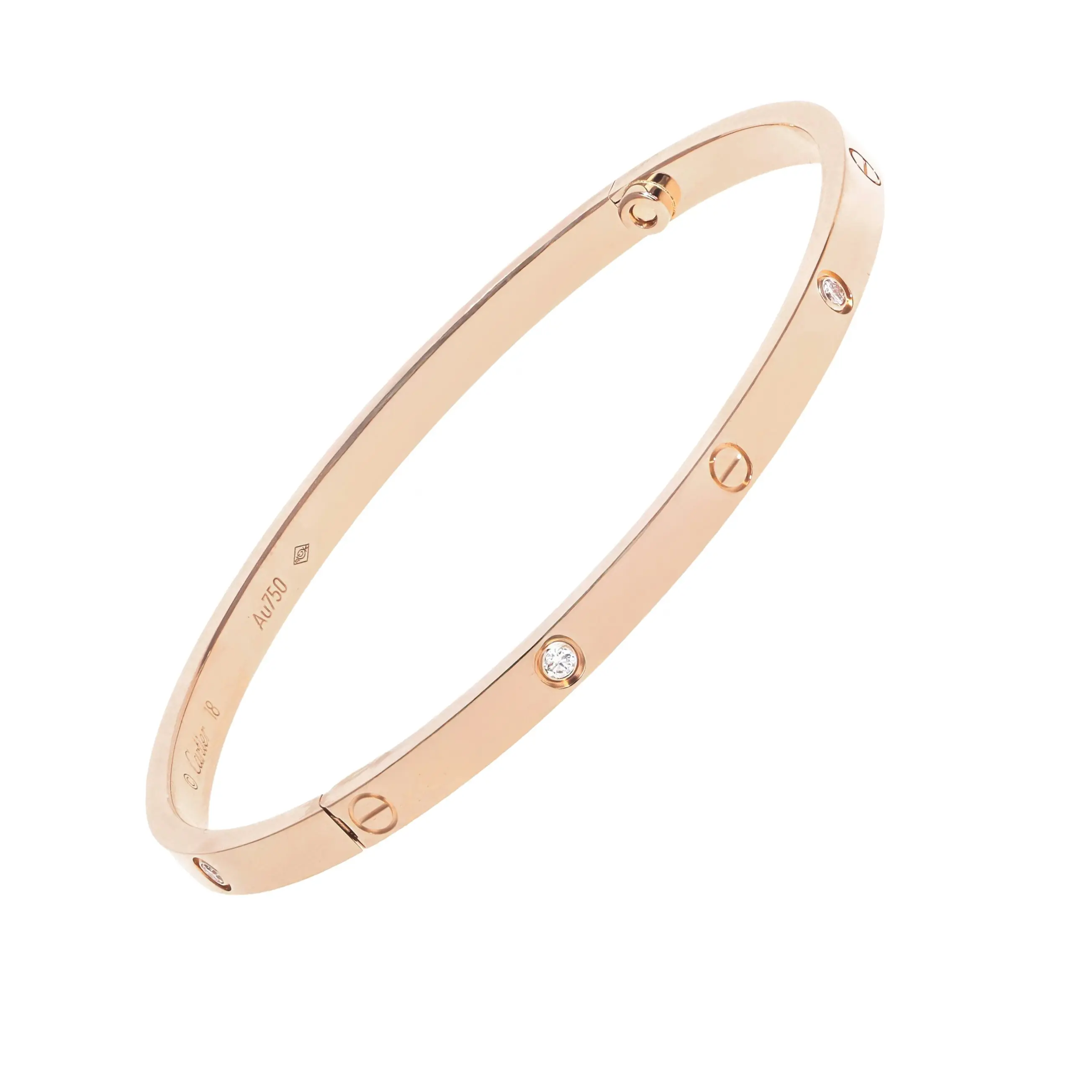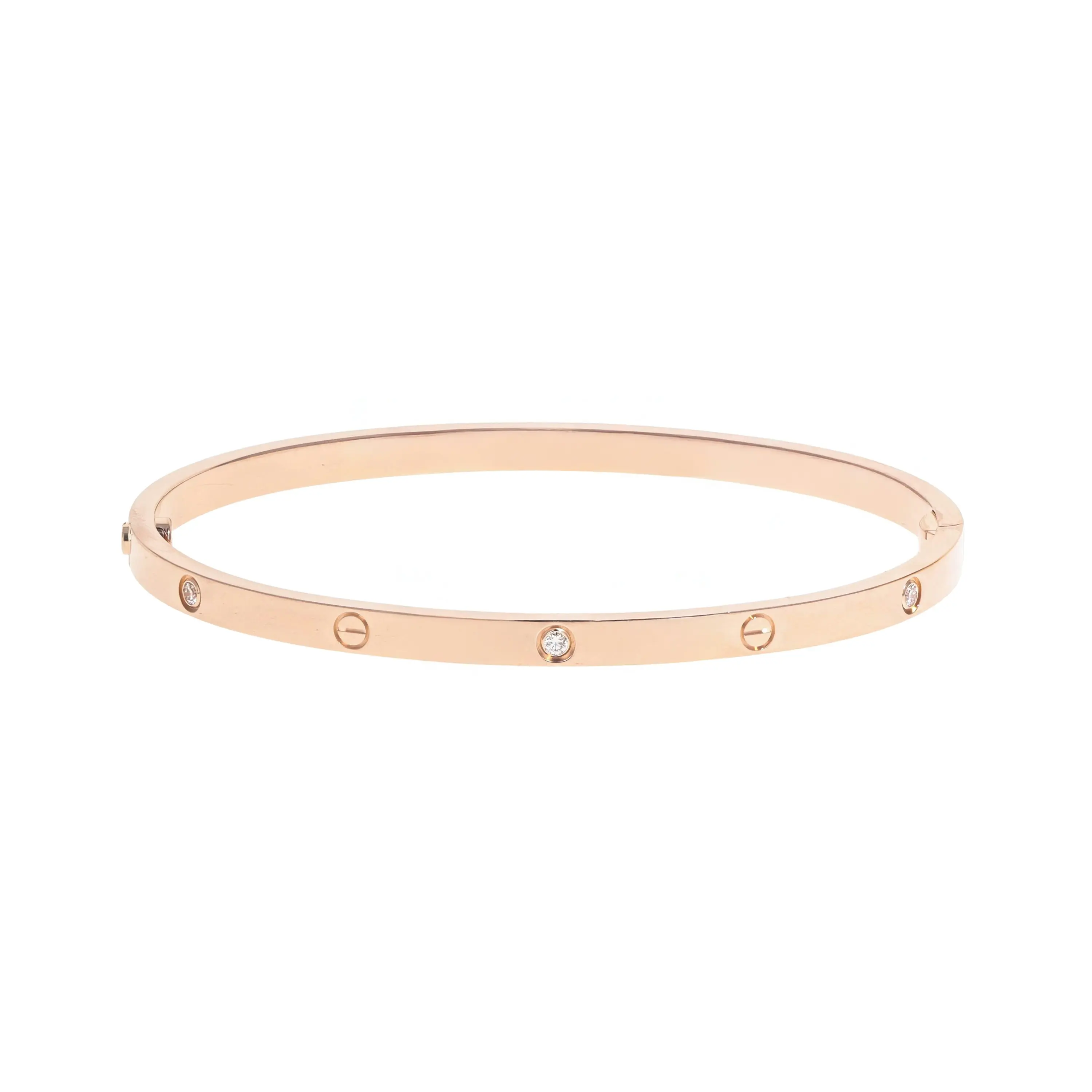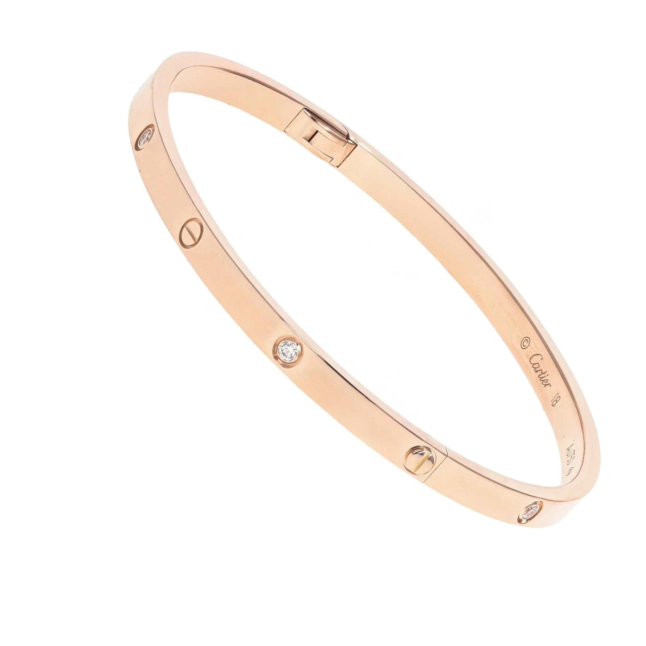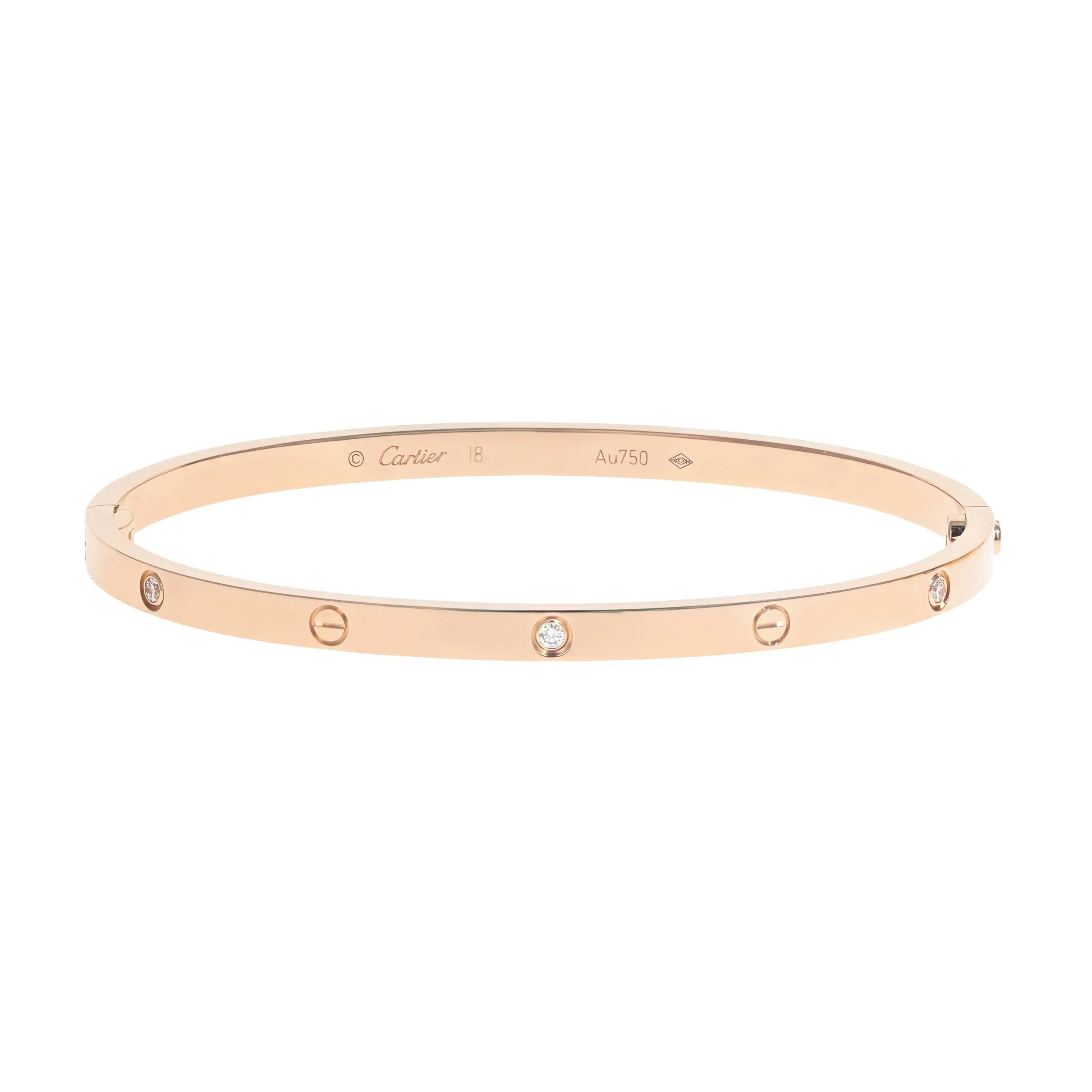 Pre-owned Cartier 18k rose gold and diamond bangle bracelet from the Love collection. This small model bangle features the signature screw design alternating with six bezel-set round brilliant diamonds. The bracelet is secured with a hidden screw clasp and is a size 18.