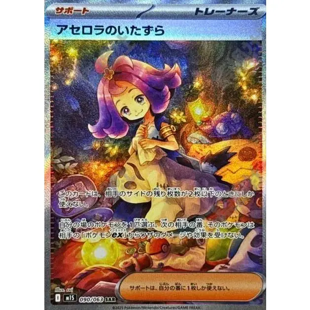 Pokémon Japanese version, one single Acerola's Mischief card One piece Genuine guarantee For loose cards, we will use a **PP plastic case + express bag** for packaging.This packaging provides a certain level of protection to prevent the cards from being bent.Please contact us promptly if there is any damage to the packaging.Thank you!Before You Buy:If you have high appearance requirements, proceed with caution.Minor appearance defects may occur during transportation.After-sales claims may not meet expectations.🚚After-Sales Standards:No returns are accepted once the product packaging is opened.For returns and refunds, an unboxing video is required.📹Notice Before Purchase: Cards stored for extended periods may warp due to temperature fluctuations.This is a common occurrence in collectible card products.🌡️Packing Standard: All boxes are brand-new and shipped directly from their original factory packaging.Minor warping may occur due to the card's printing process.📦Solution: Place cards in top-loaded card sleeves and apply even pressure using a heavy, flat object.This minor warping will not impact professional grading assessments.