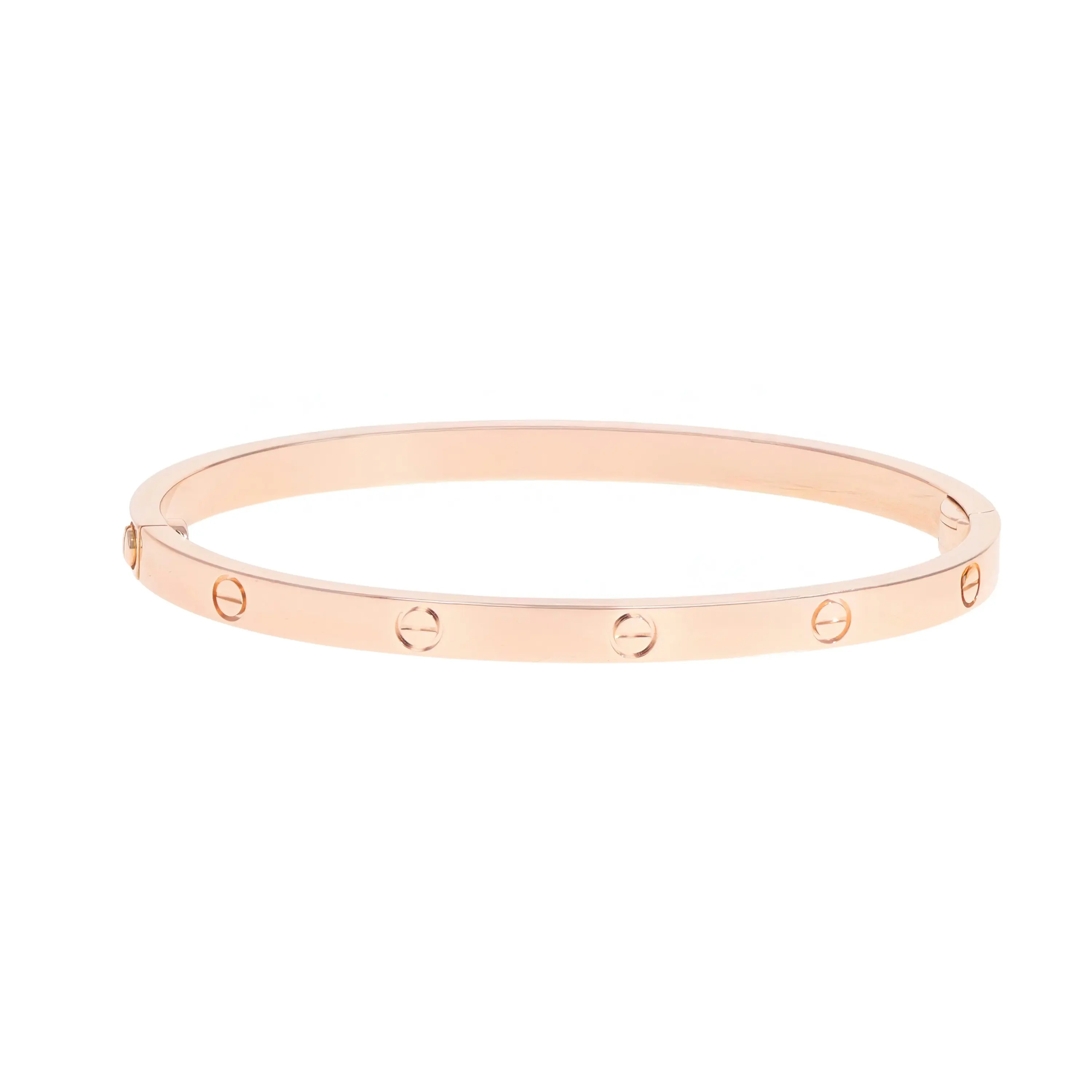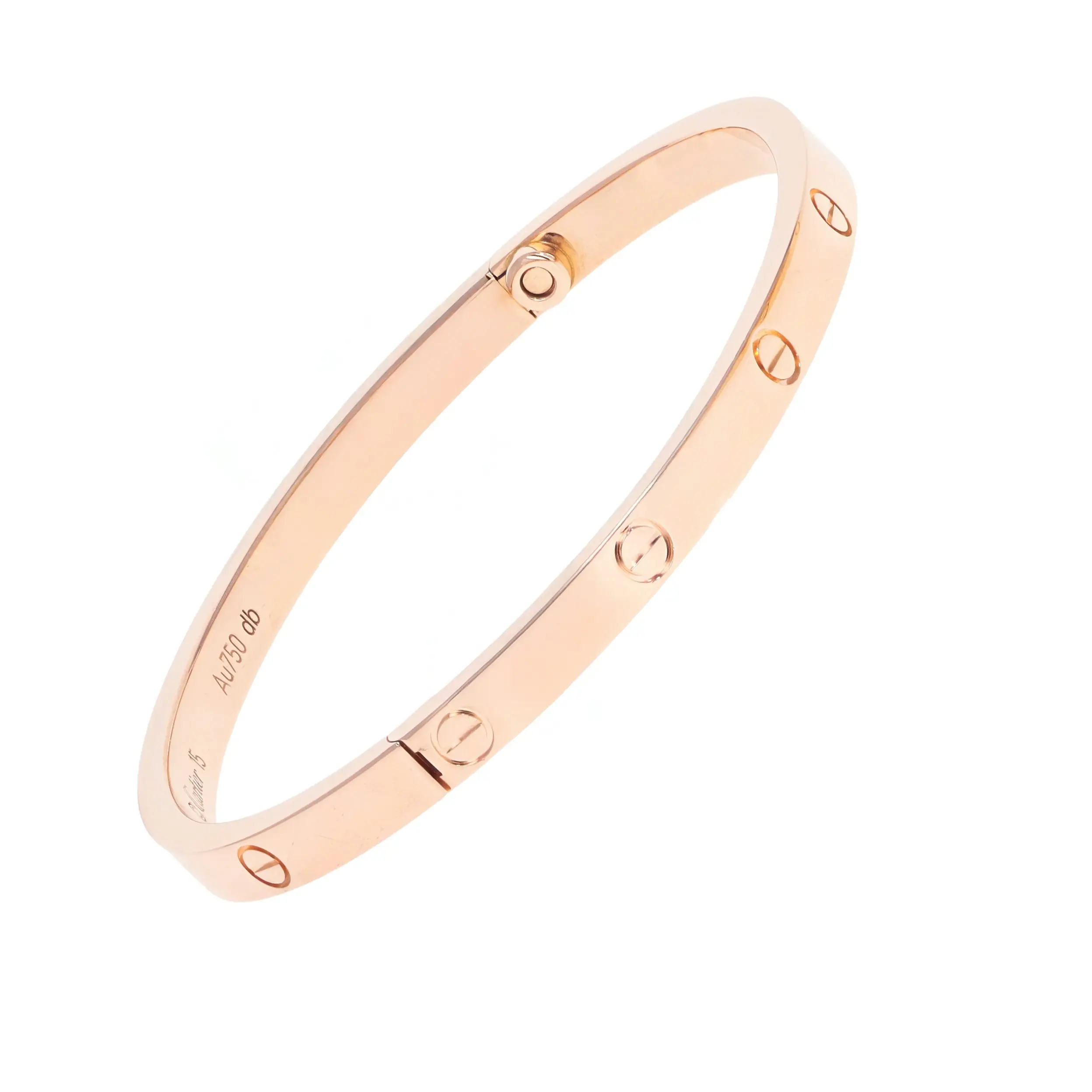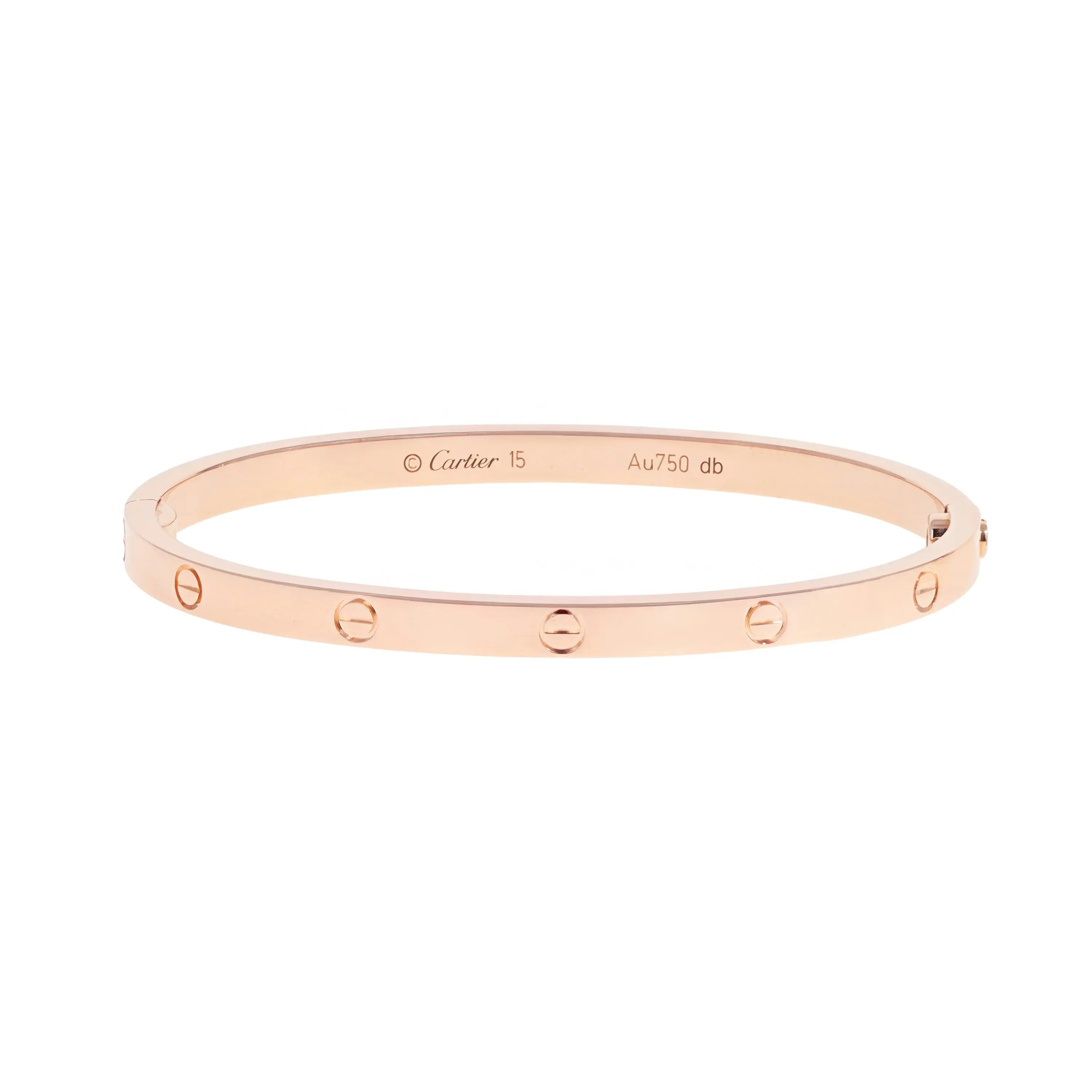 Pre-owned Cartier 18k rose gold bracelet from the Love collection. The small model bangle features the signature screw design evenly spaced around the bracelet. The bangle is in a size 15 and comes with the original Cartier papers.