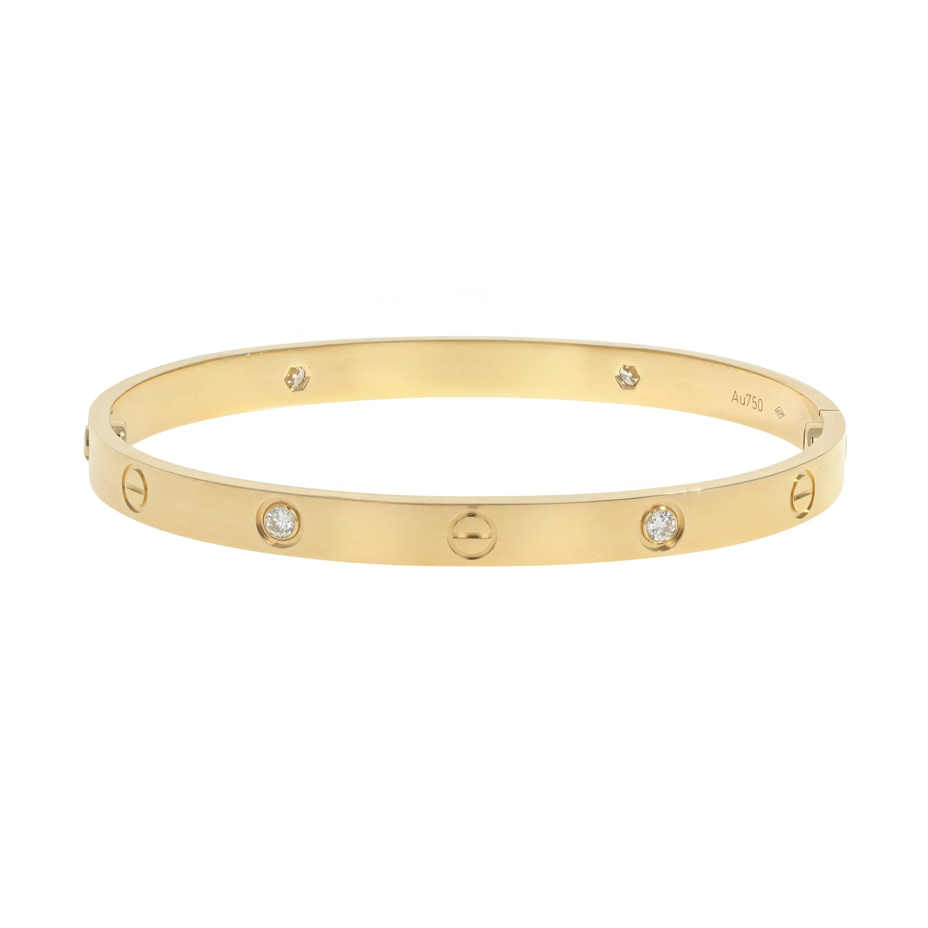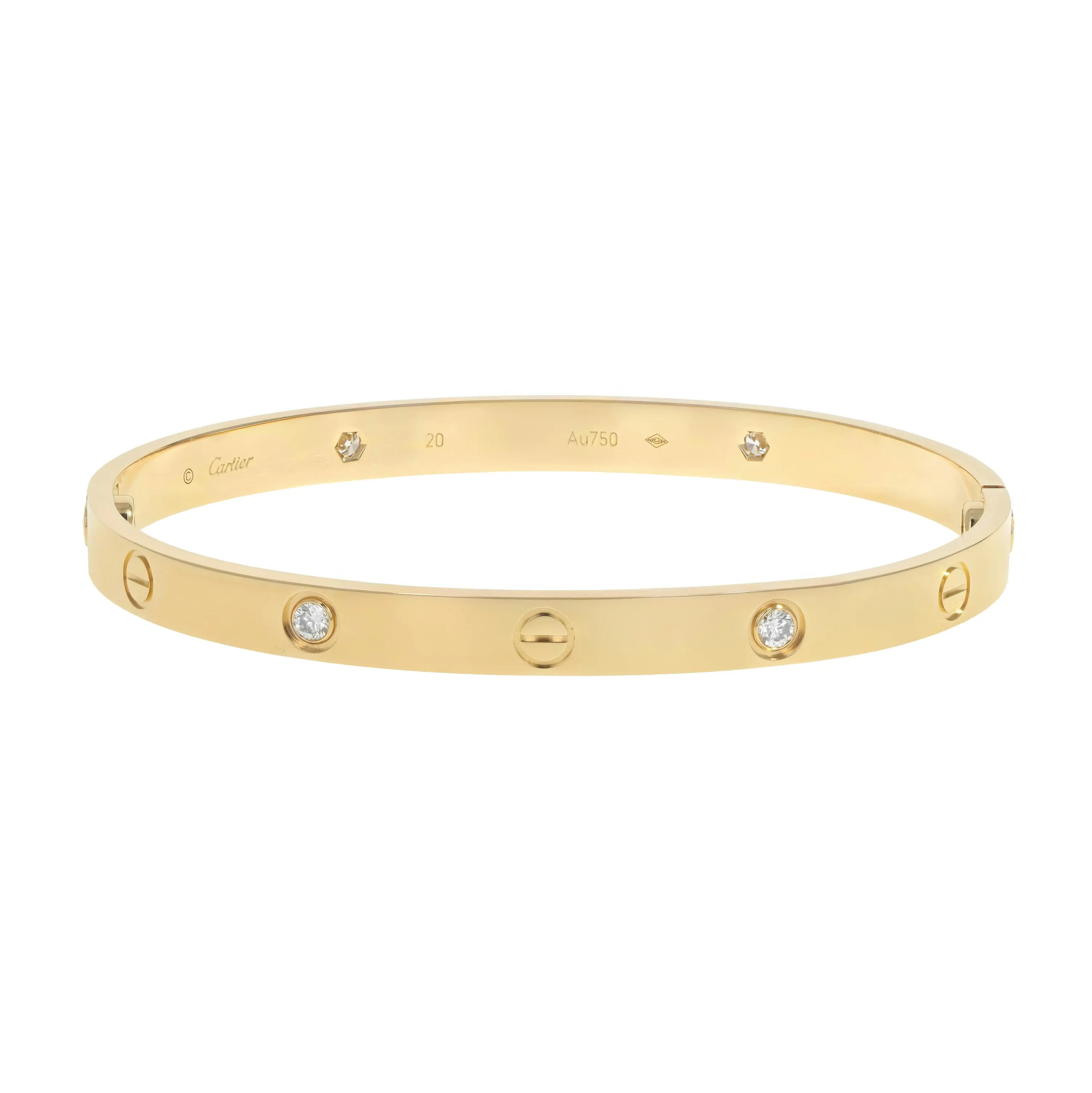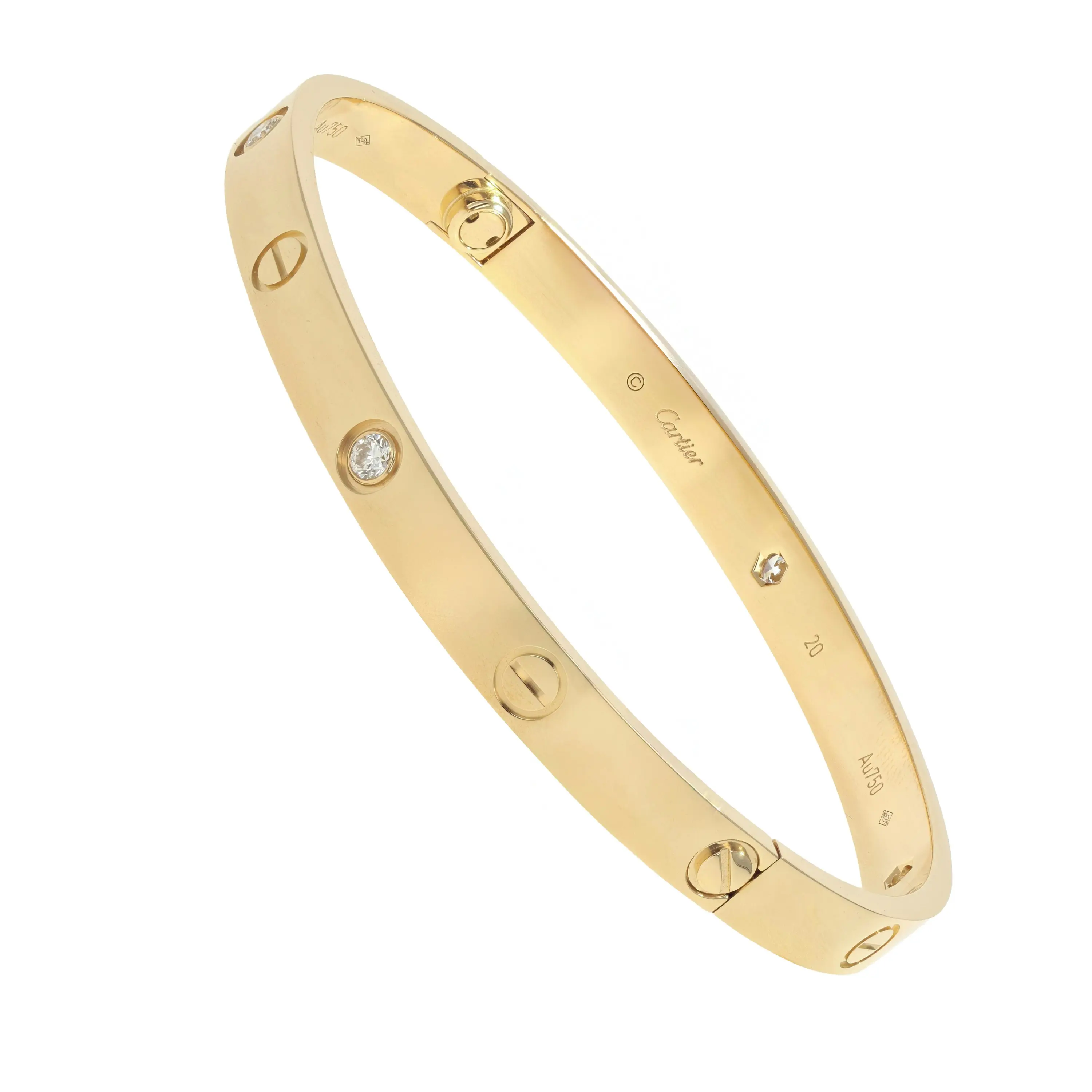 Pre-owned Cartier 18k yellow gold and diamond bangle bracelet from the Love collection. The bangle features four round brilliant diamonds alternating with the signature screw design. The bracelet is in a size 20 and comes with the original Cartier papers.