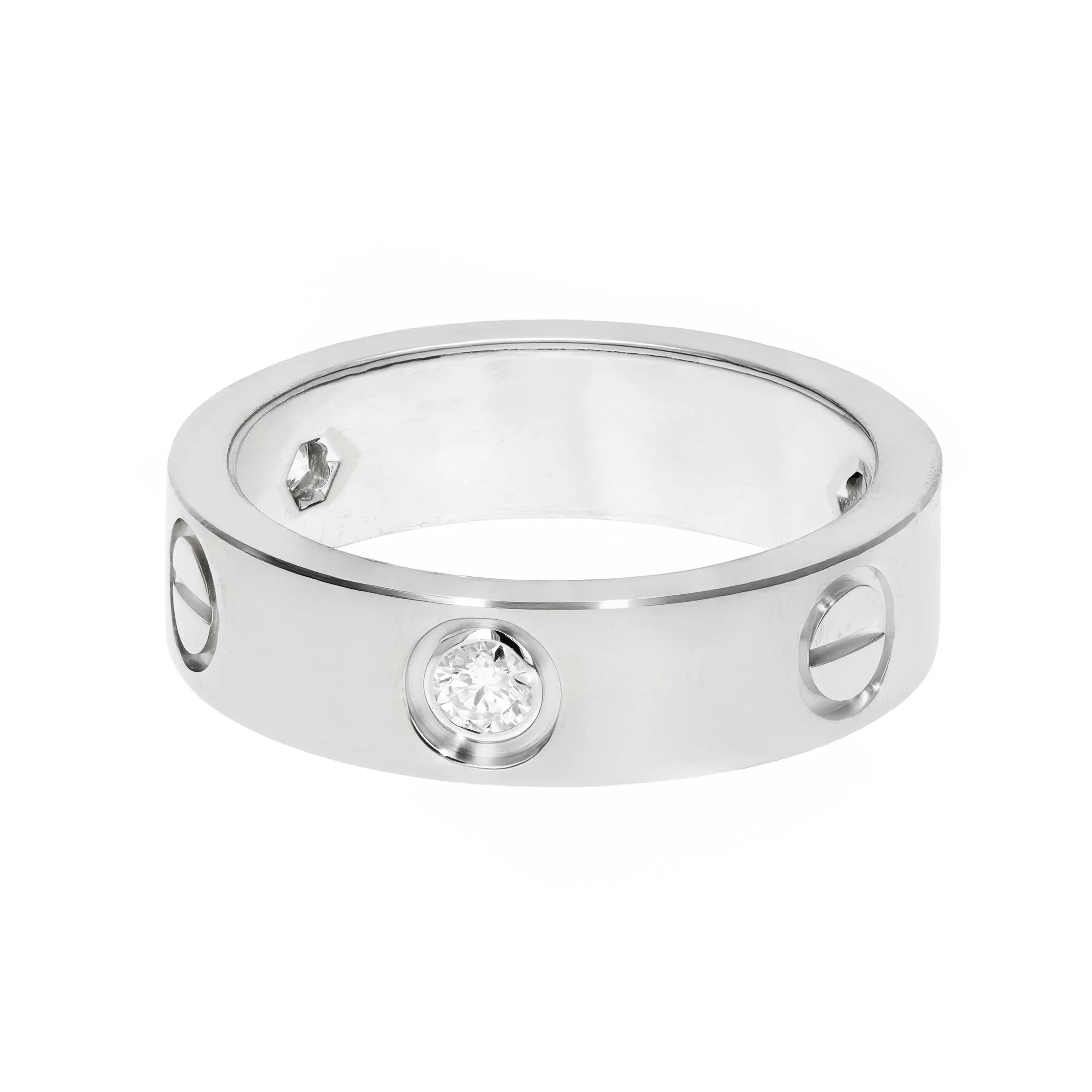 Pre-owned Cartier 18k white gold and diamond ring from the Love collection. The ring is a polished band and features the signature screw design alternating with three bezel-set round brilliant diamonds. This piece is in a size 54.