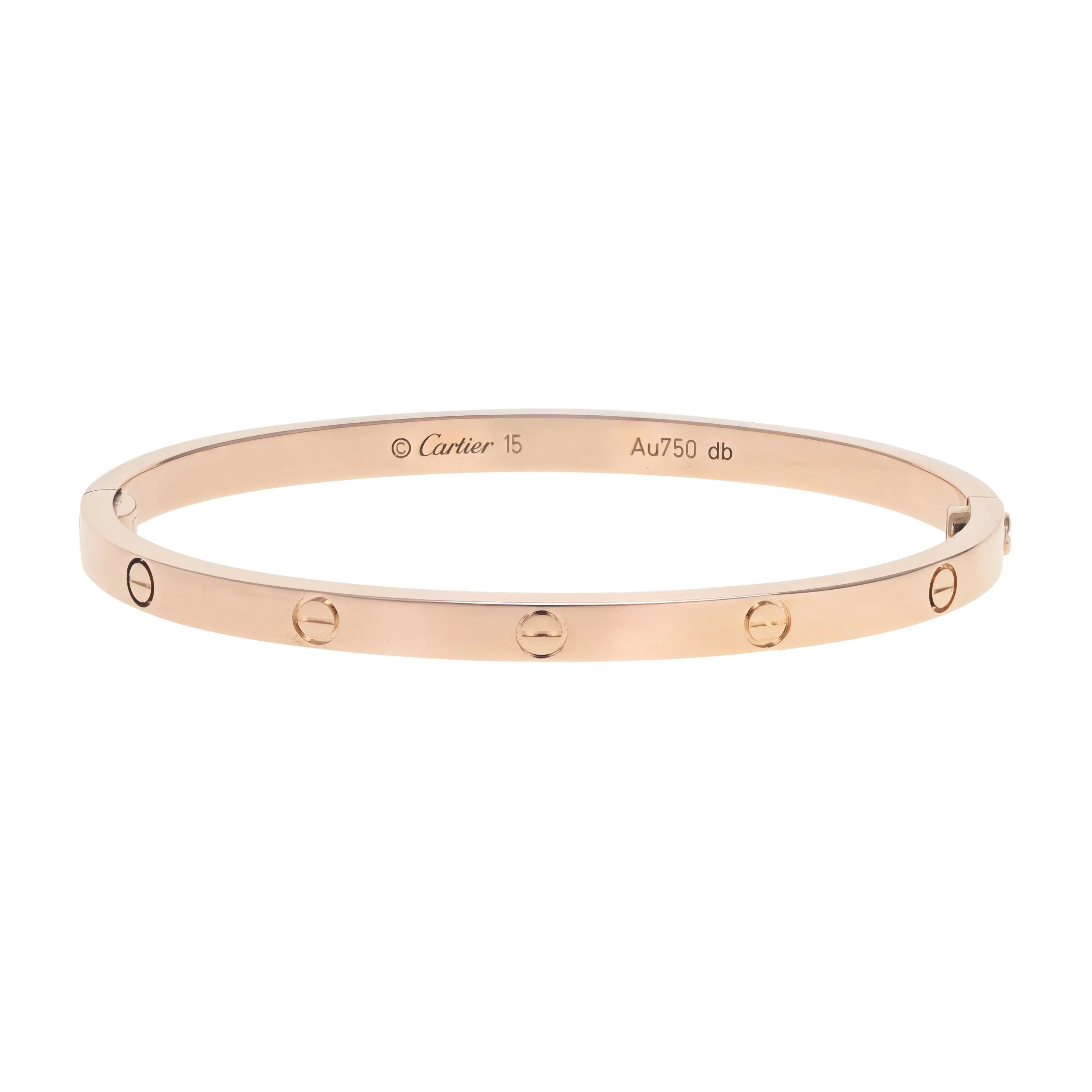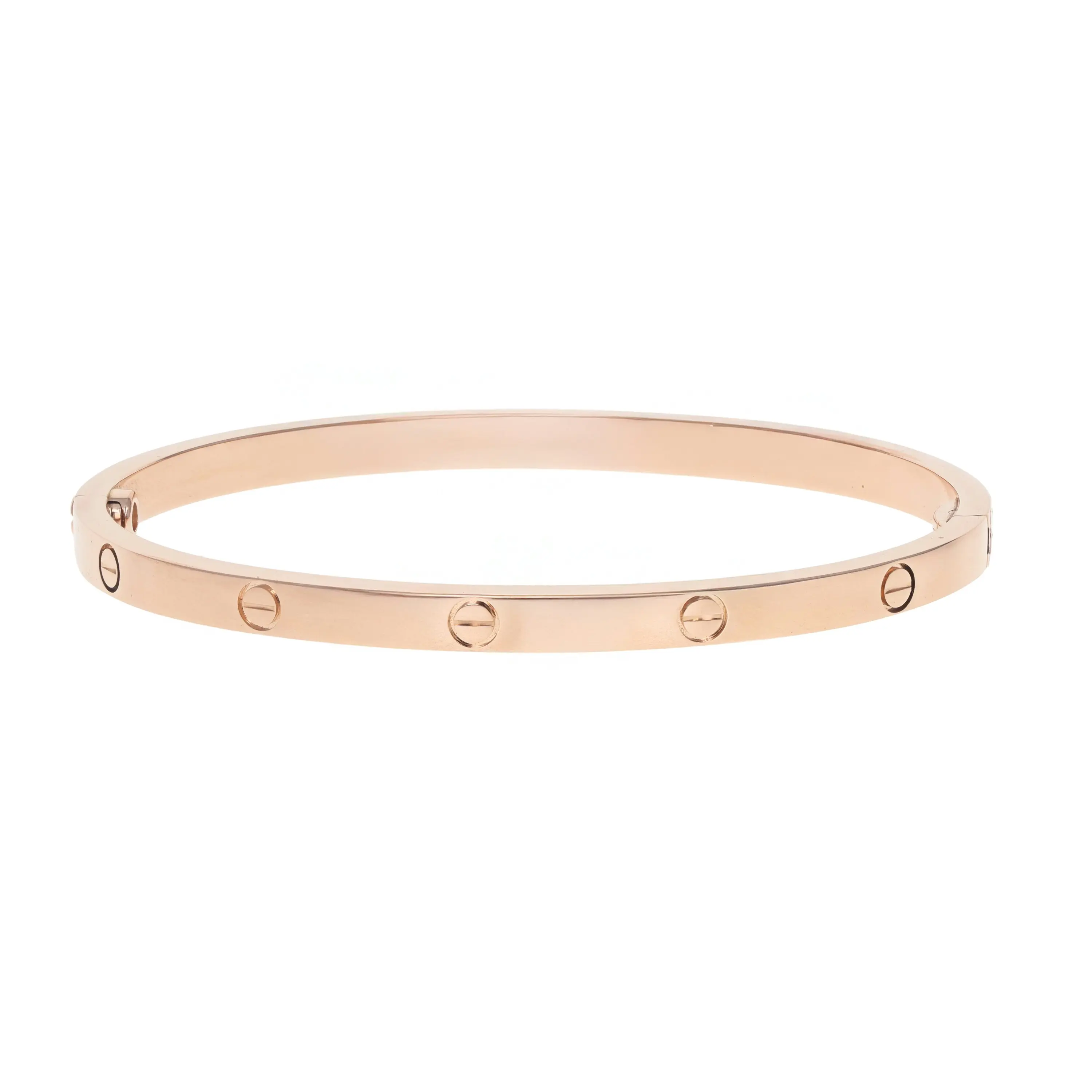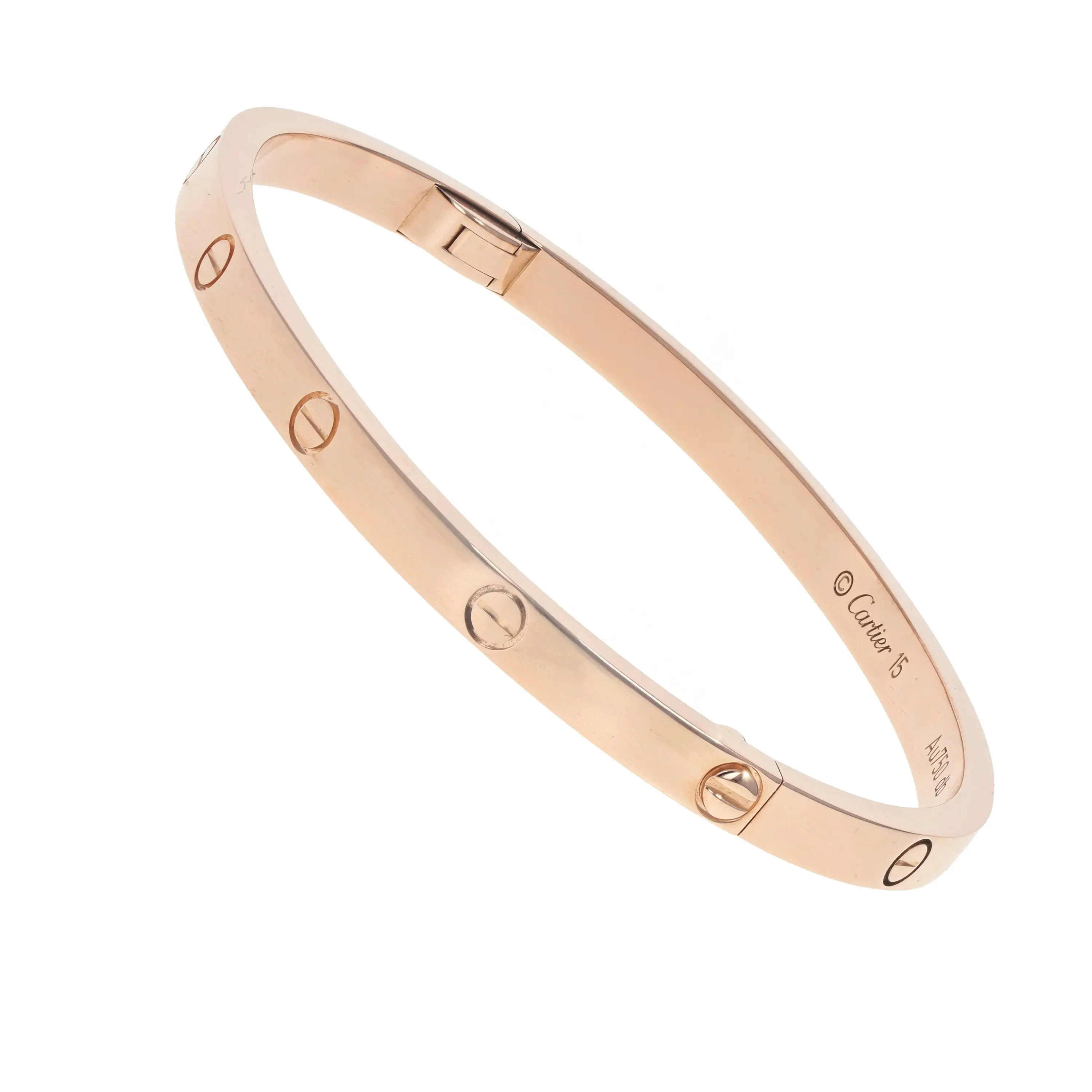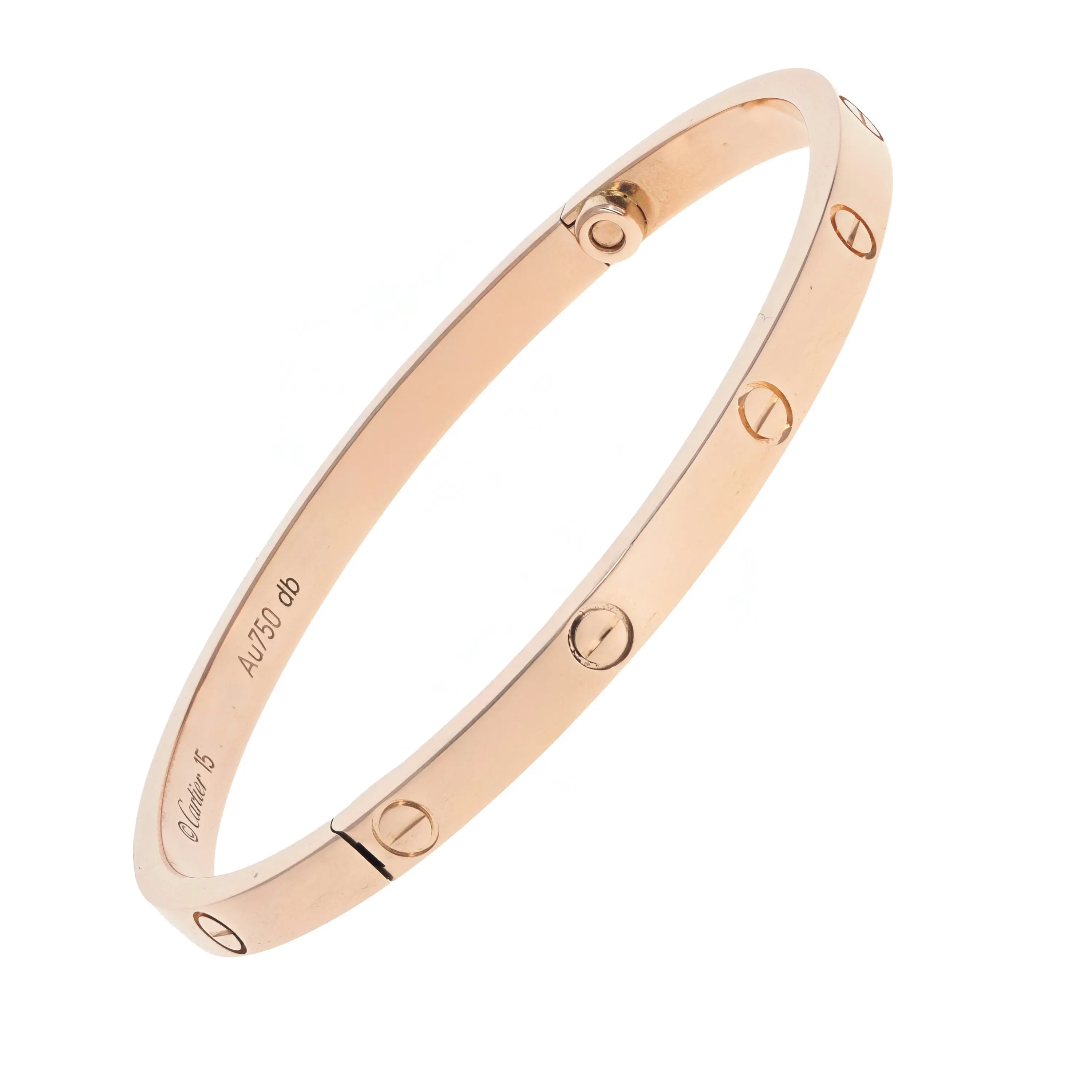 Pre-owned Cartier 18k rose gold bracelet from the Love collection. The small model bangle features the signature screw design evenly spaced around the bracelet. The bangle is in a size 15 and comes with the original Cartier papers.