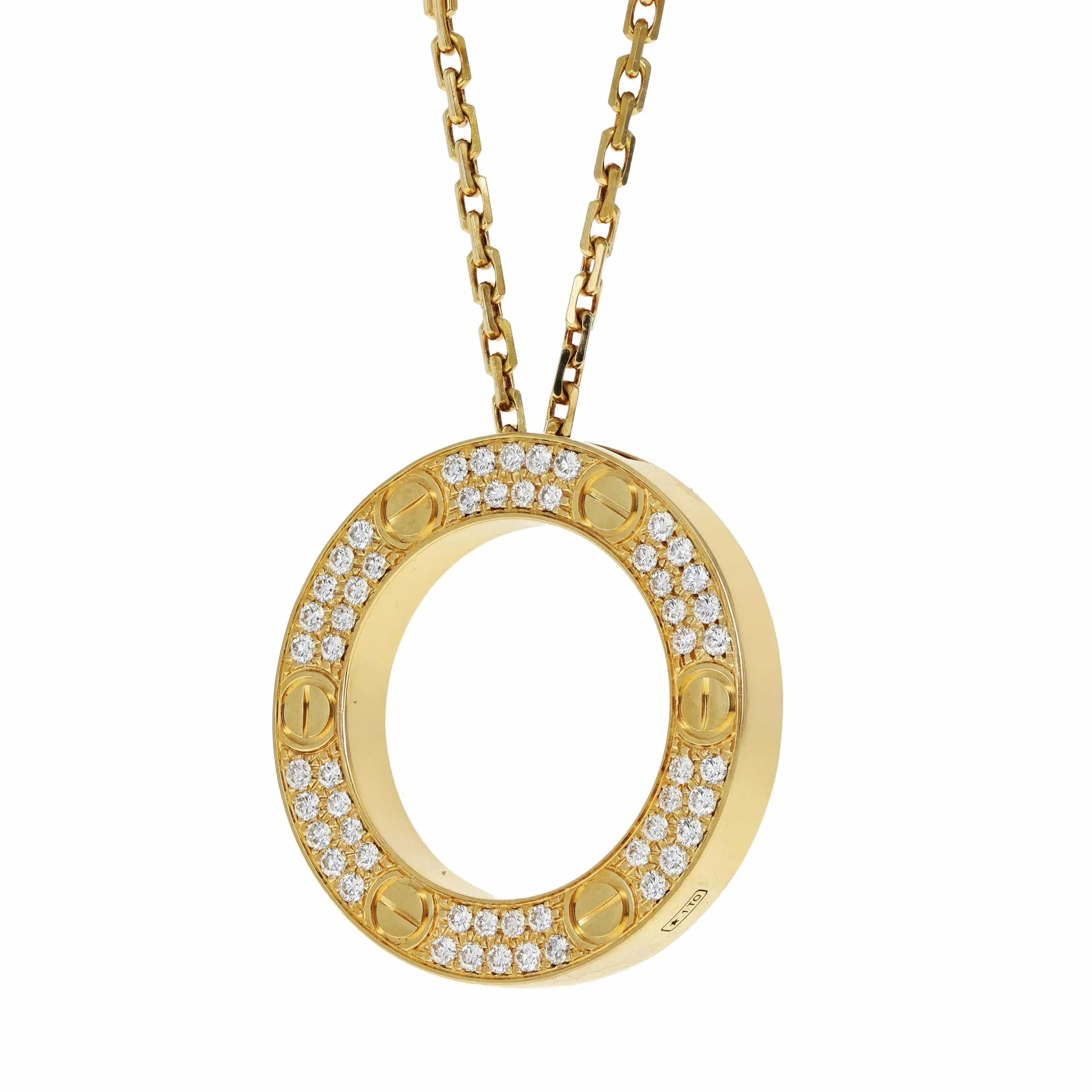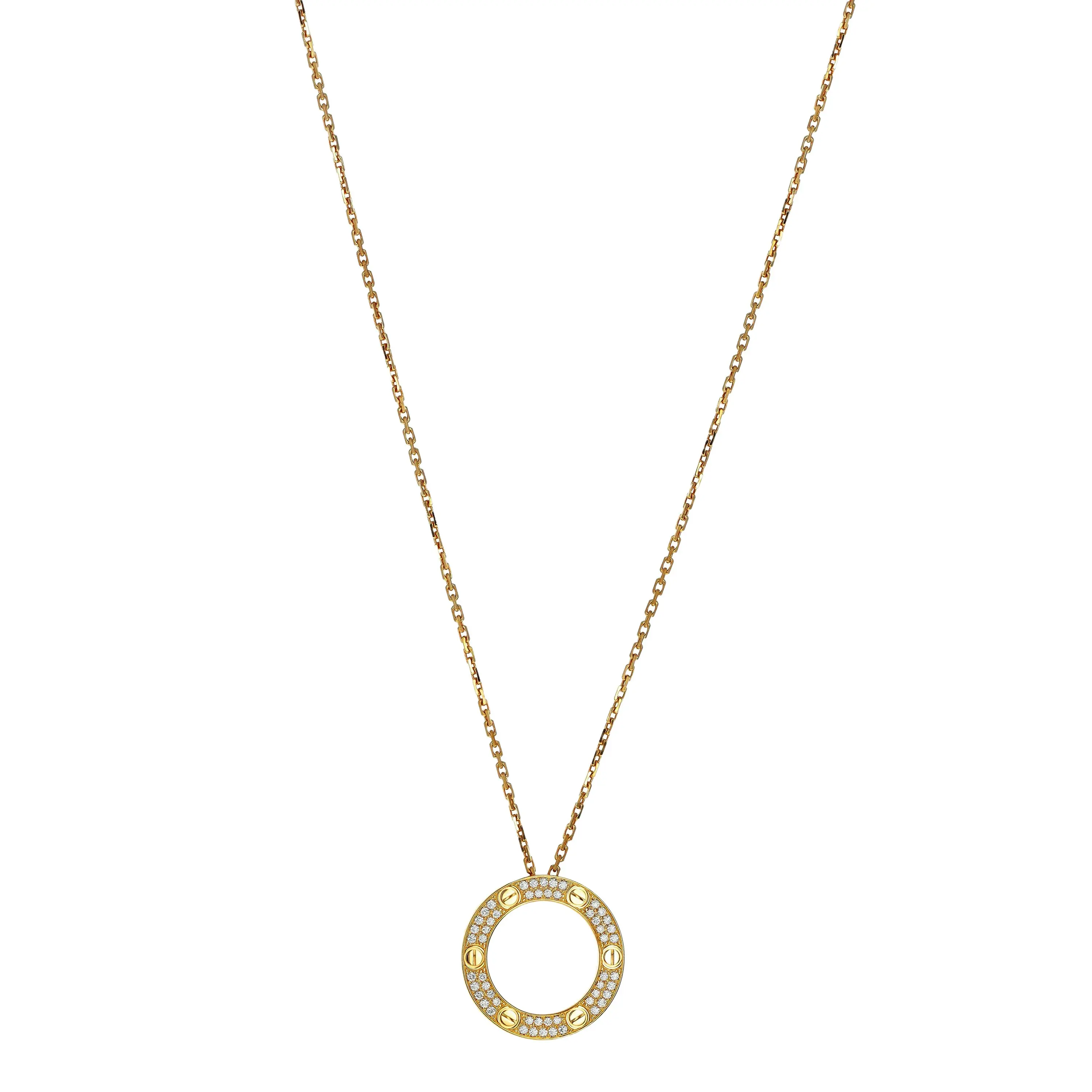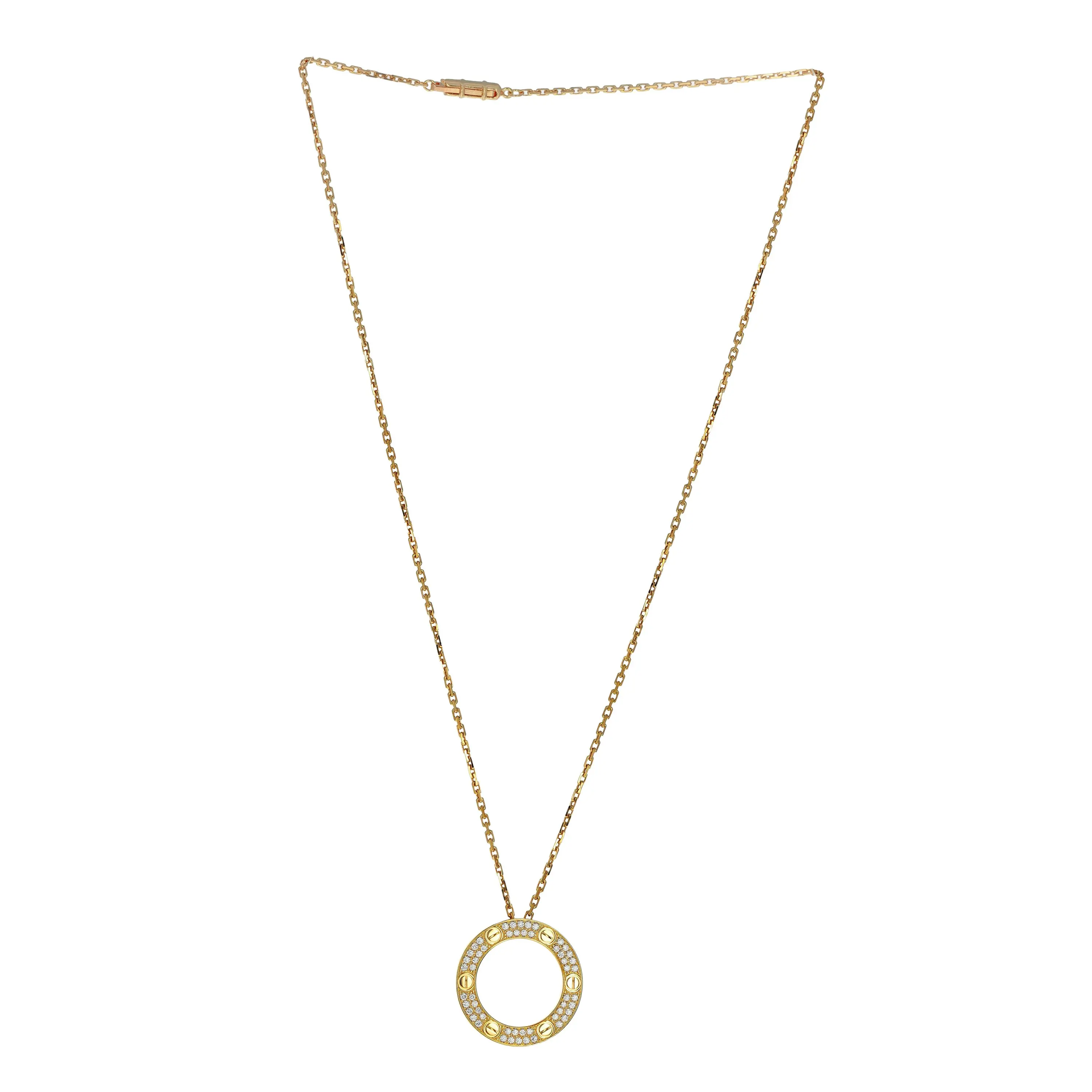 Pre-owned Cartier 18k yellow gold and diamond pendant necklace from the Love collection. The necklace features an open circle pendant with two rows of pave set round brilliant diamonds seperated by the signature screw design. The pendant is sliding on a cable link chain that is 16.5 inches in length and is secured with a box clasp.