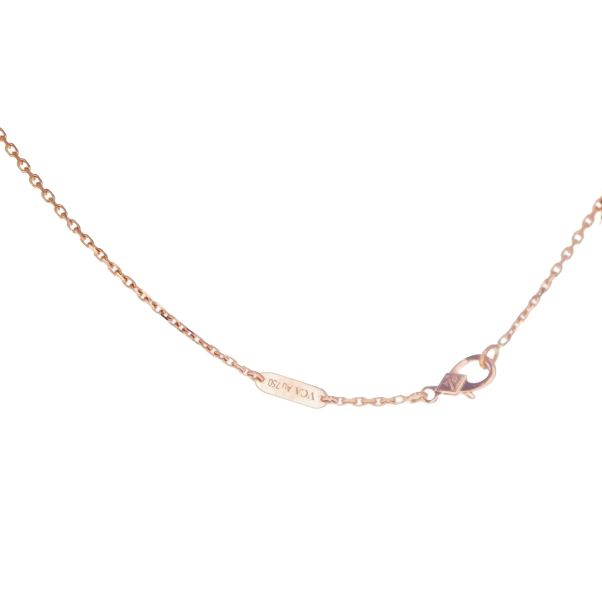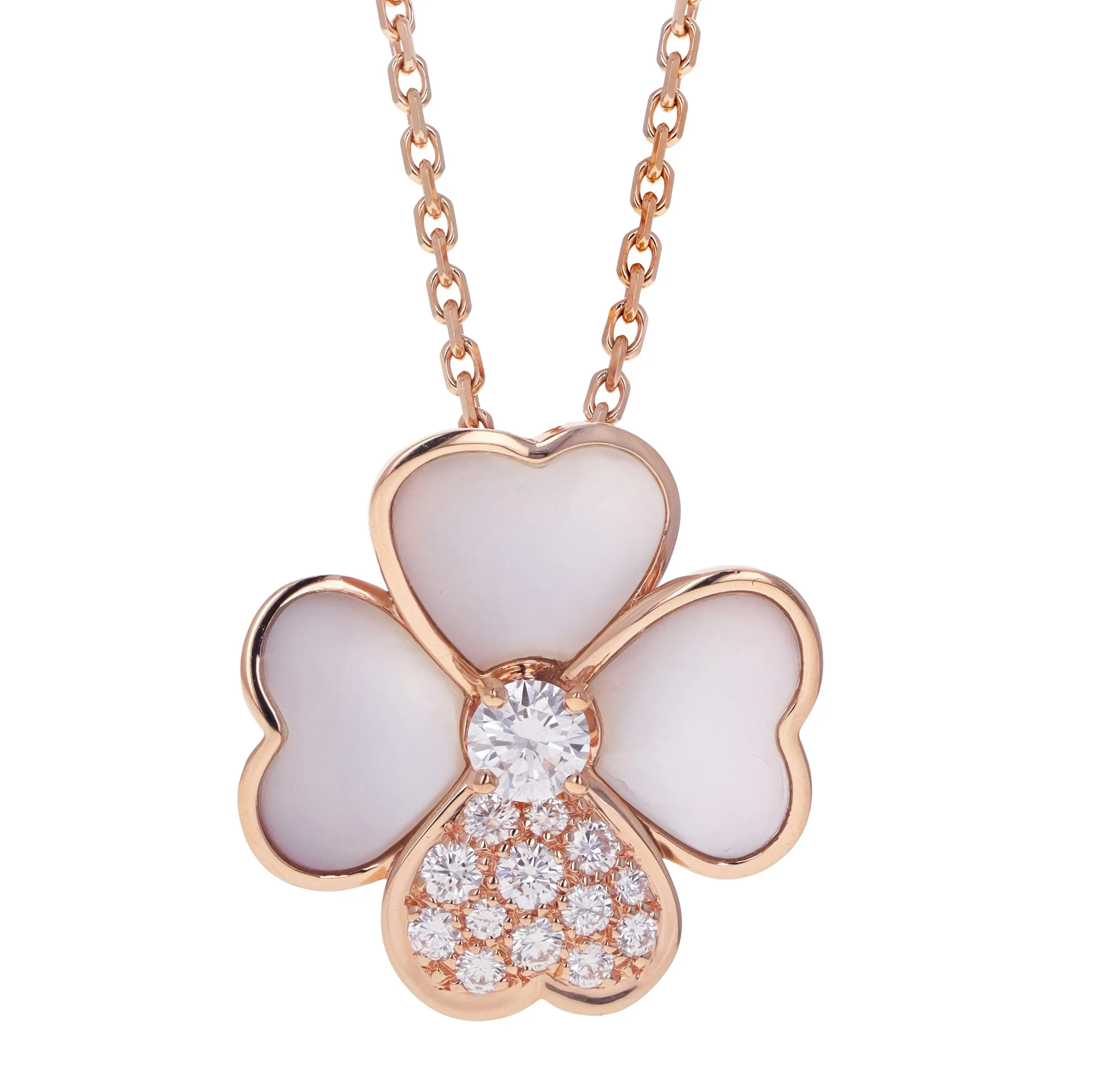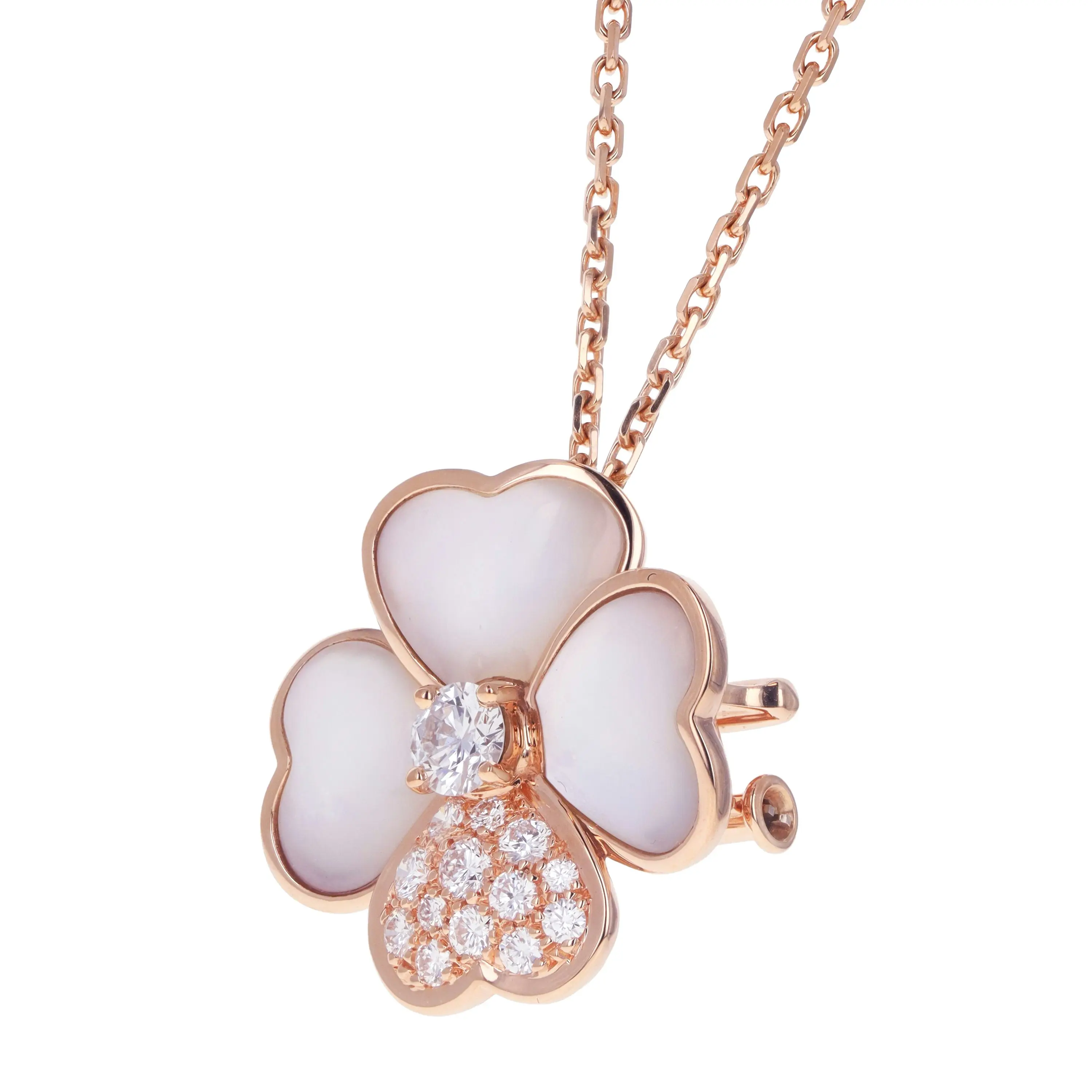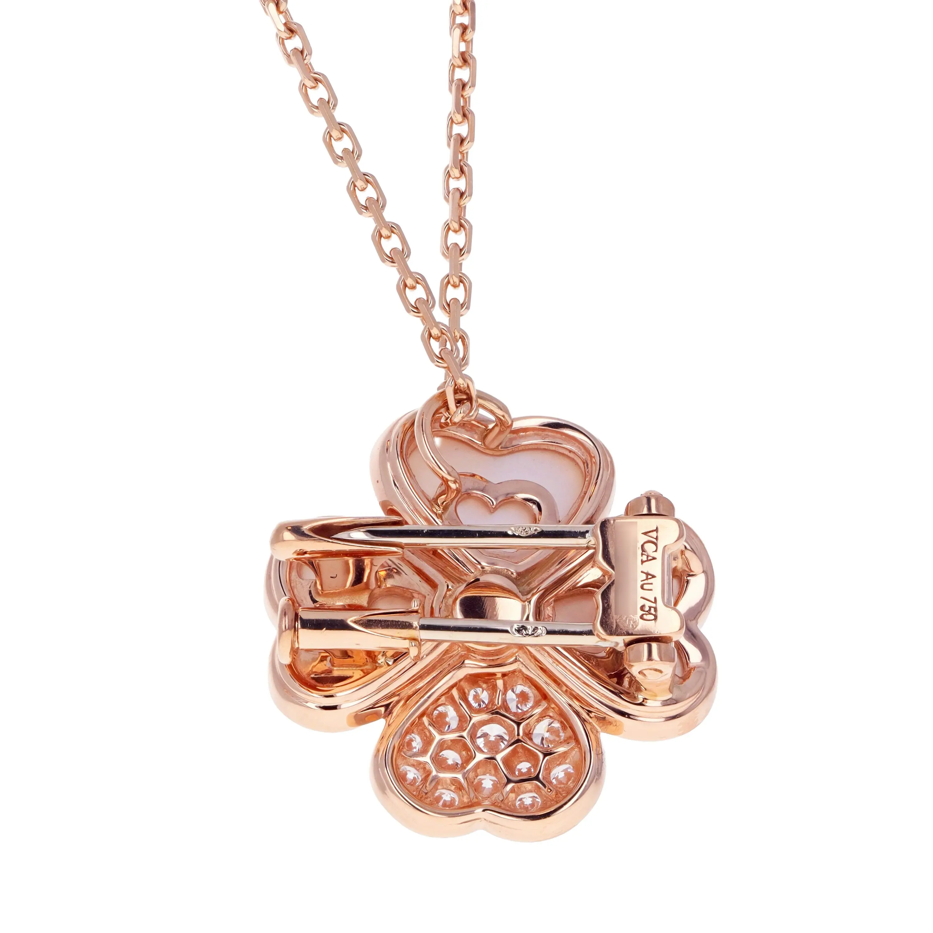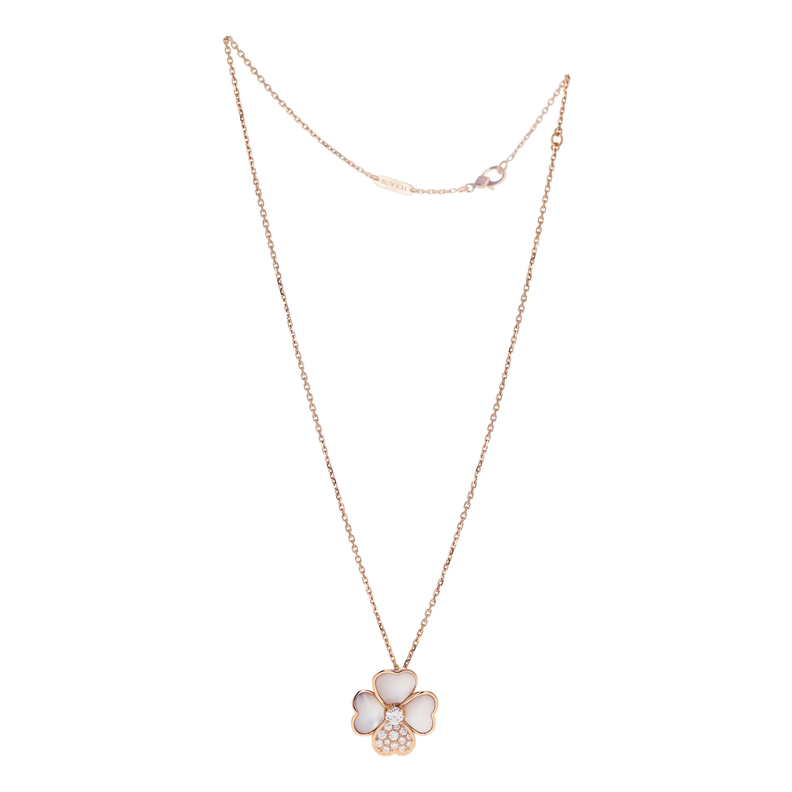 Pre-owned Van Cleef & Arpels 18kt rose gold, mother-of-pearl, and diamond flower necklace/brooch from the Cosmos collection. The pendant features a four petal flower design with three of the petals set with a mother-of-pearl stone, one petal with pave round brilliant diamonds, complete with a singular round brilliant diamond in the flower's center. The pendant is sliding on a cable link chain that is 18 inches in length and secured with a lobster clasp. The flower can alternatively be worn as a brooch with a two-prong pin.
