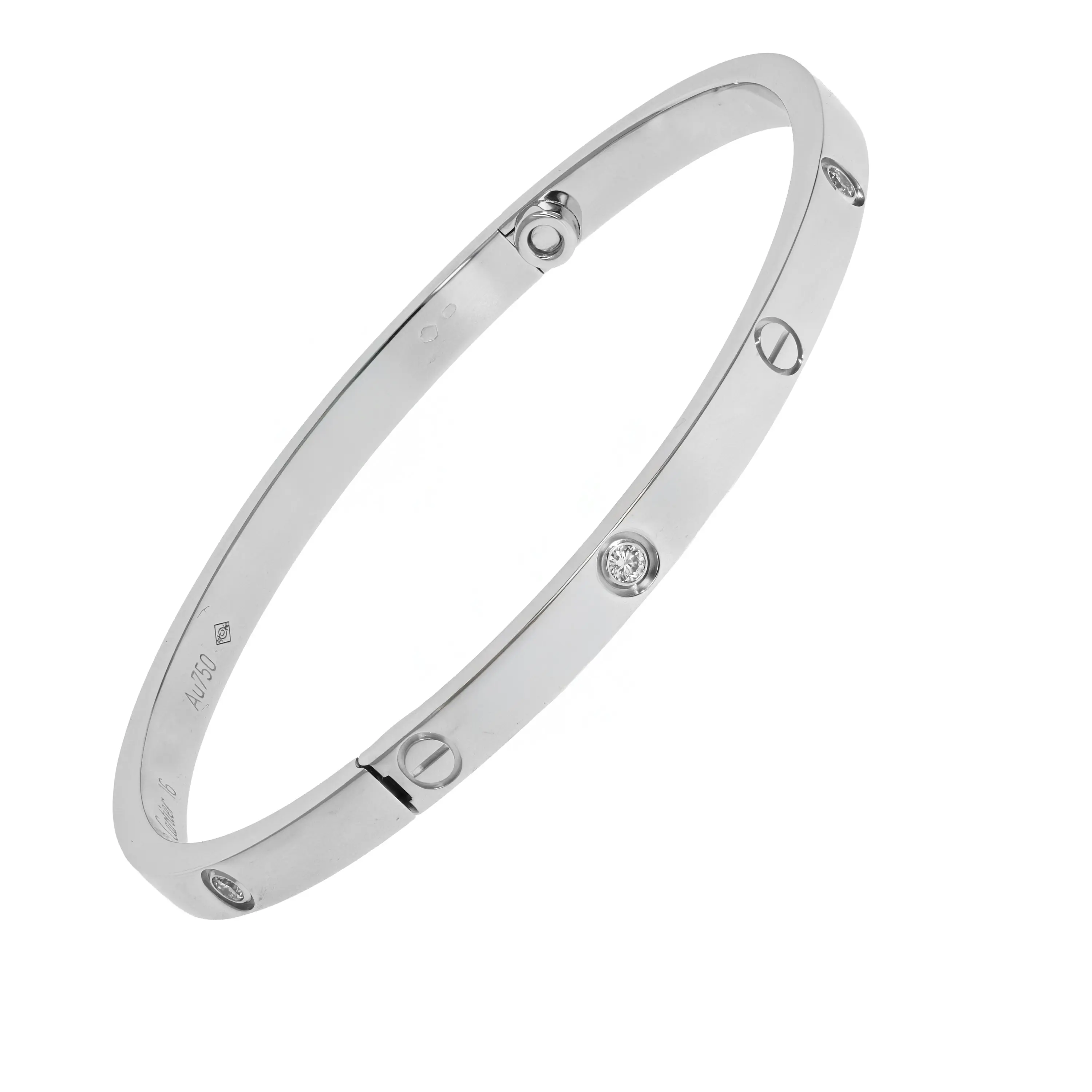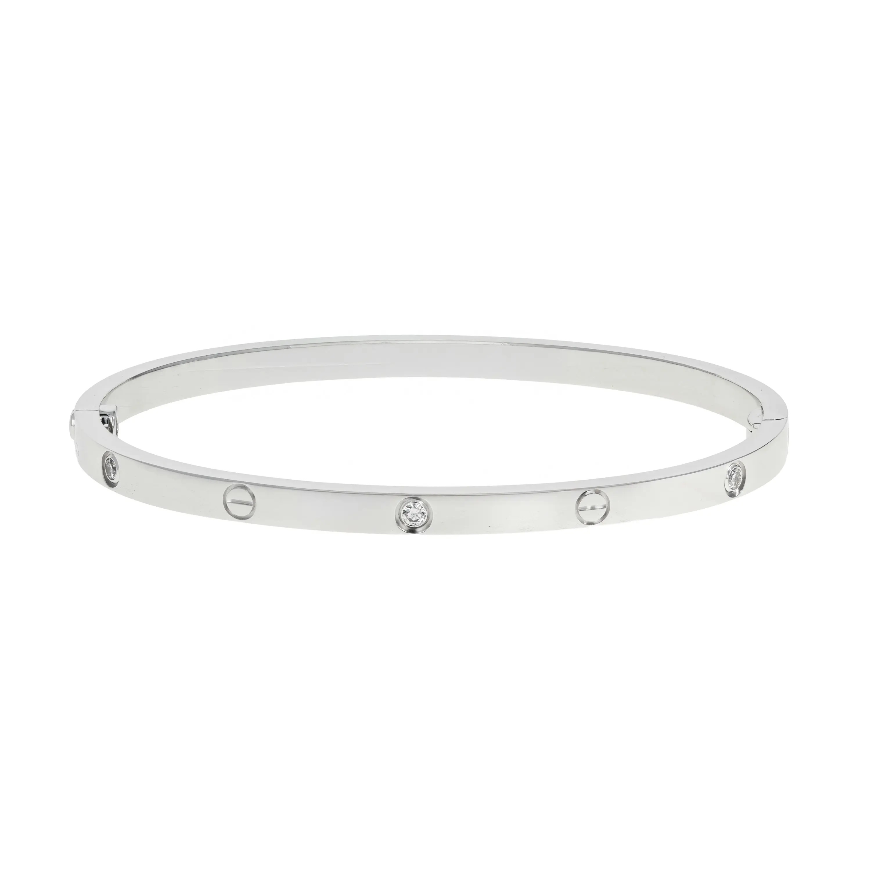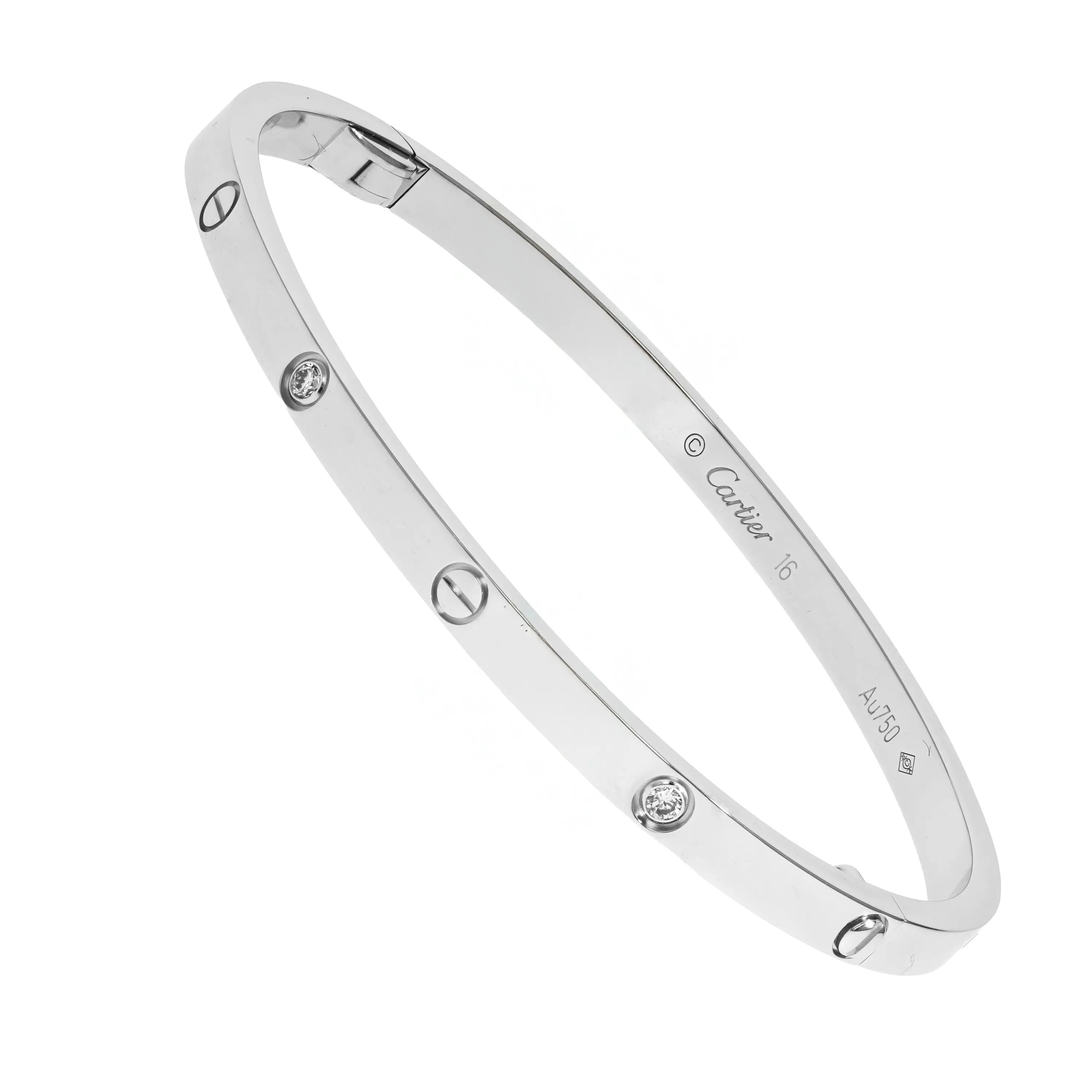 Pre-owned Cartier 18k white gold and diamond bangle bracelet from the Love collection. The bracelet is the small model and features six round brilliant diamonds alternating with the signature screw design going around the entire bangle. This piece is in a size 16 and comes with the original Cartier box and papers.