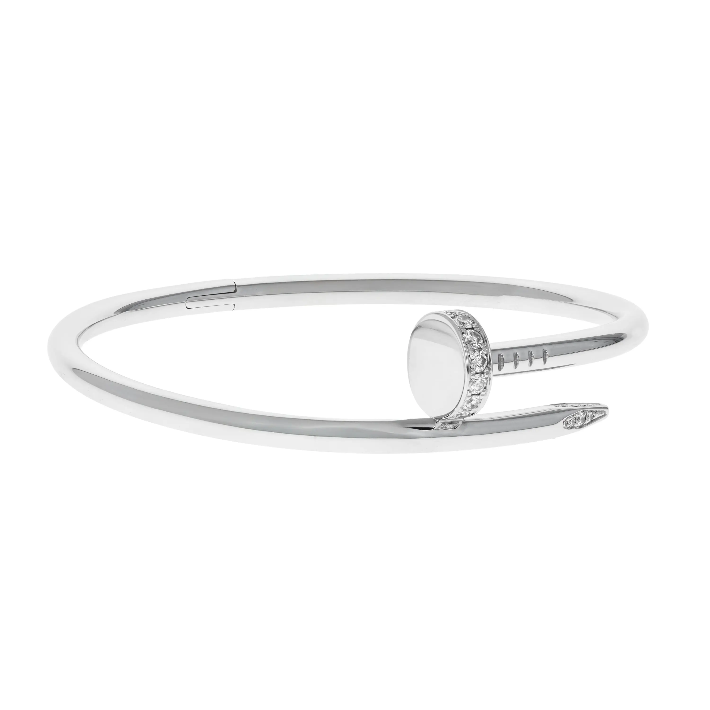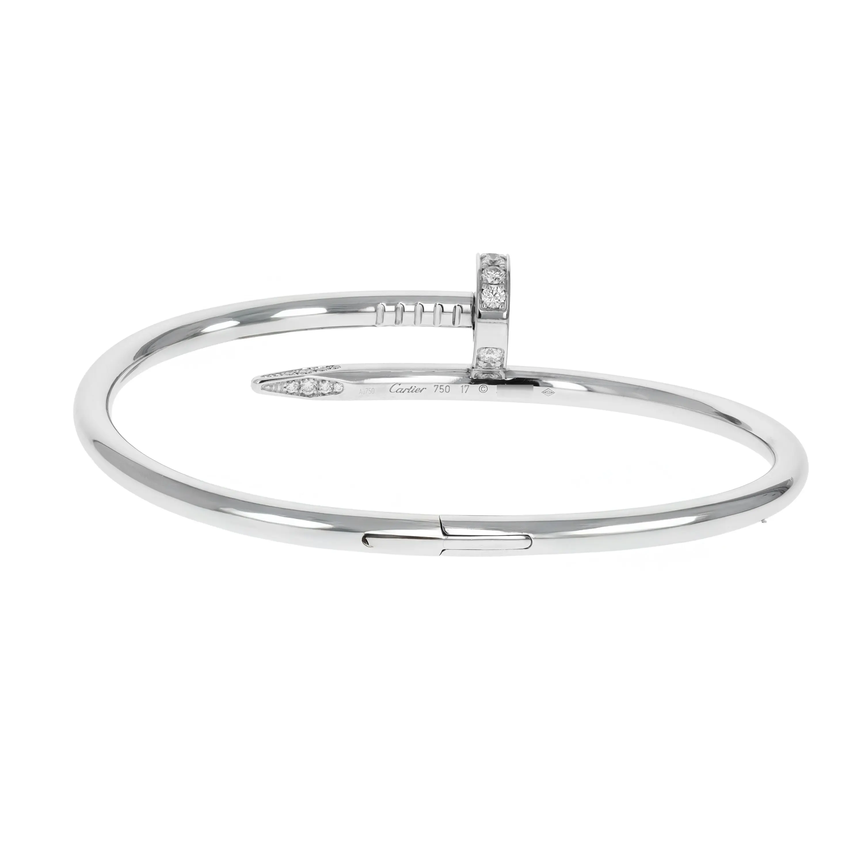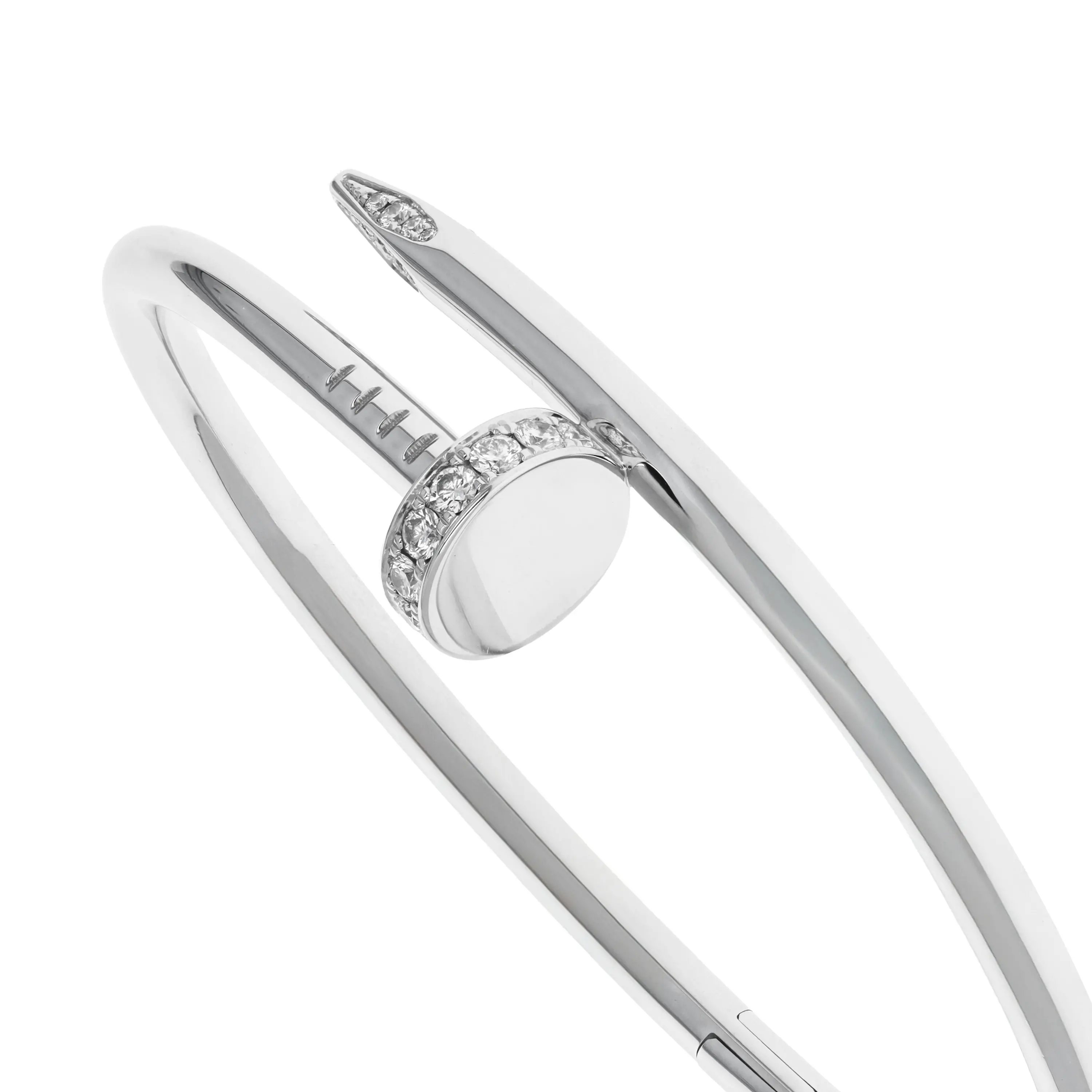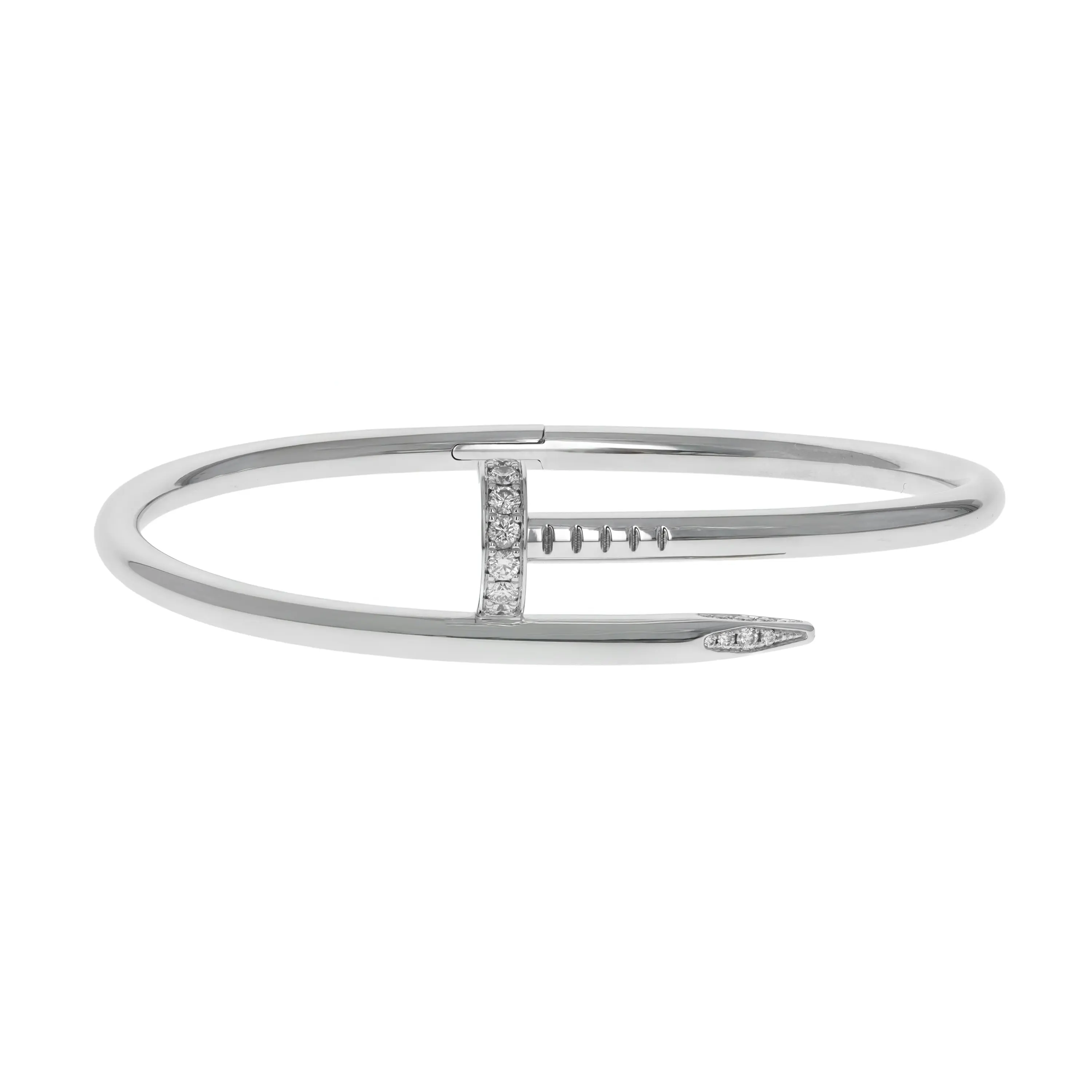 Pre-owned Cartier 18k white gold and diamond bangle bracelet from the Juste Un Clou collection. The bracelet features a nail design that wraps once around the wrist and is accented with round brilliant diamonds. This piece is in a size 17 and comes with the original Cartier papers.