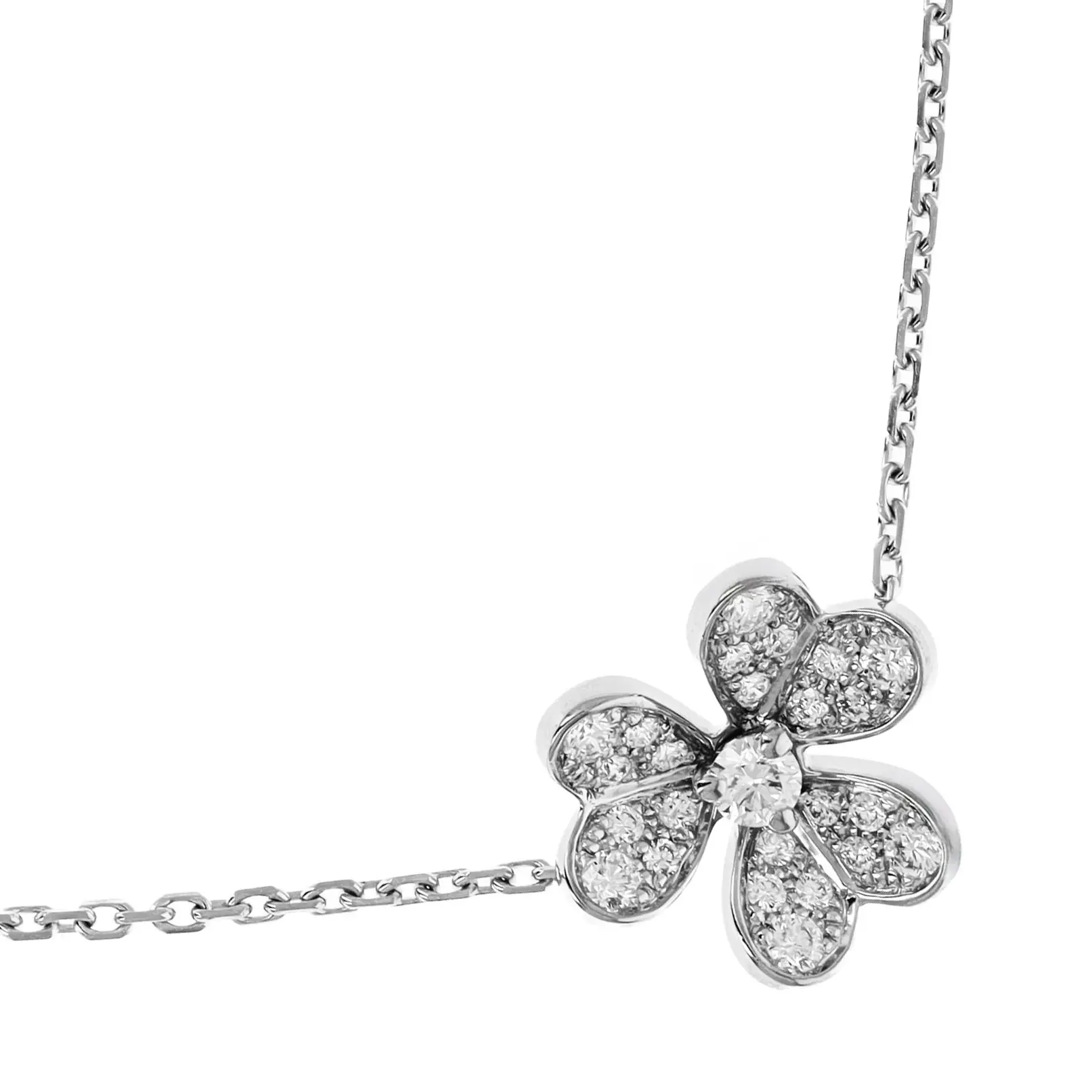 Pre-owned Van Cleef & Arpels 18k white gold and diamond bracelet from the Frivole collection. The bracelet features a single flower with pave round brilliant diamonds set in the petals as well as a singular round brilliant diamond in the center. The flower is stationed on a cable-link chain that measures 7 inches in length and is secured with a lobster clasp. This piece comes with the original VCA papers.