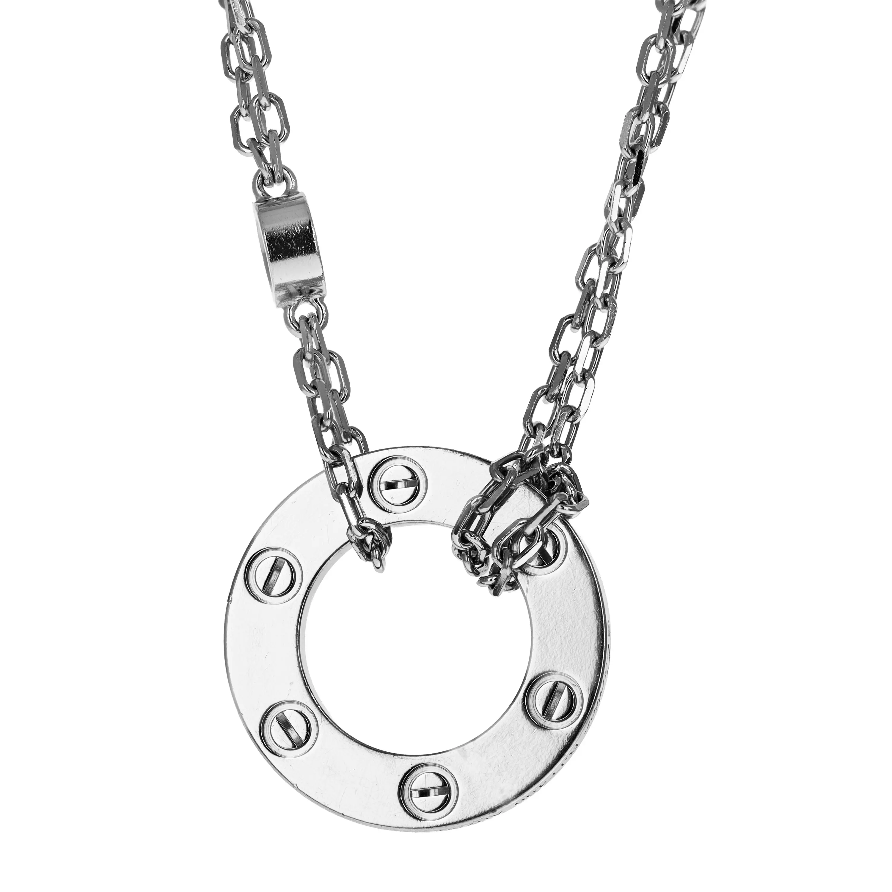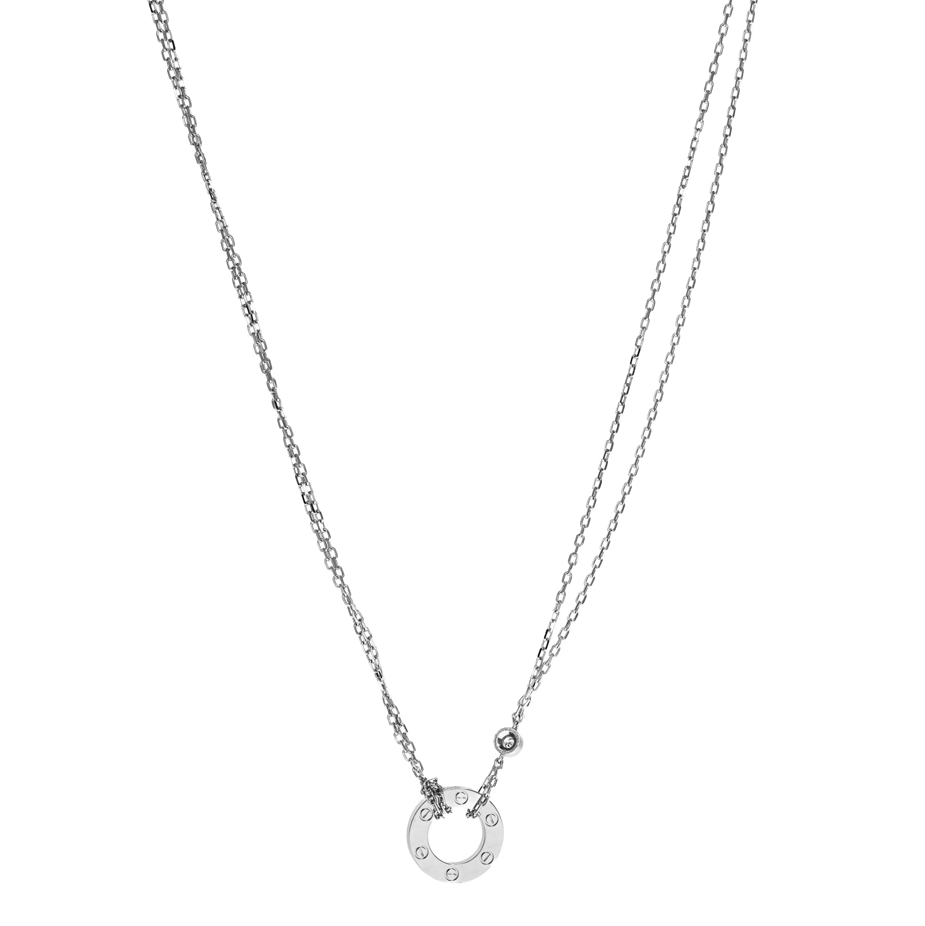 Pre-owned Cartier 18k white gold and diamond necklace from the Love collection. The necklace features a polished open circle pendant with "LOVE" engraving, the signature screw design and accented with one bezel-set round brilliant diamond. The pendant is stationed at the front of a double cable-link chain that wraps around the circle and is secured with a lobster clasp. The chain is adjustable and measures 15.5 to 16.5 inches in length. This piece comes with the original Cartier papers.