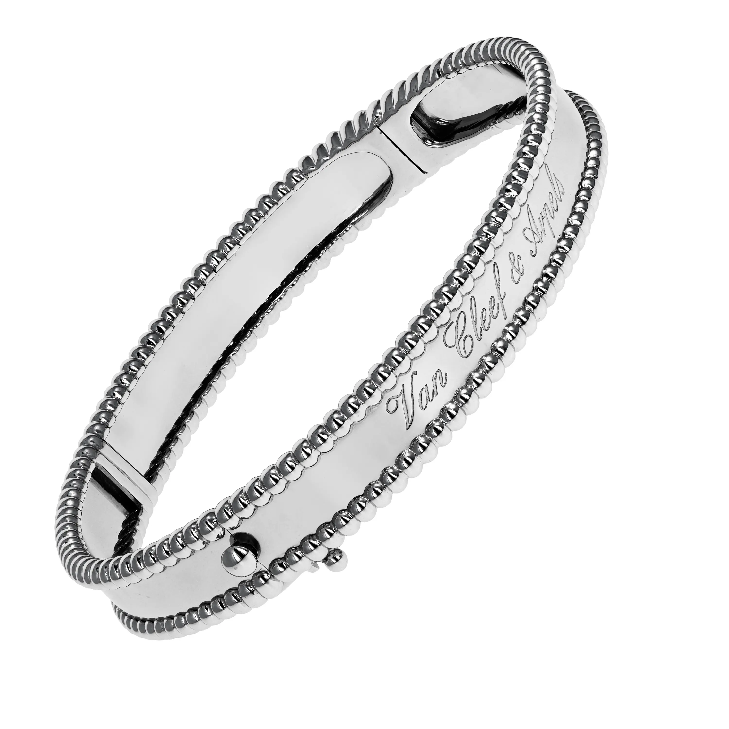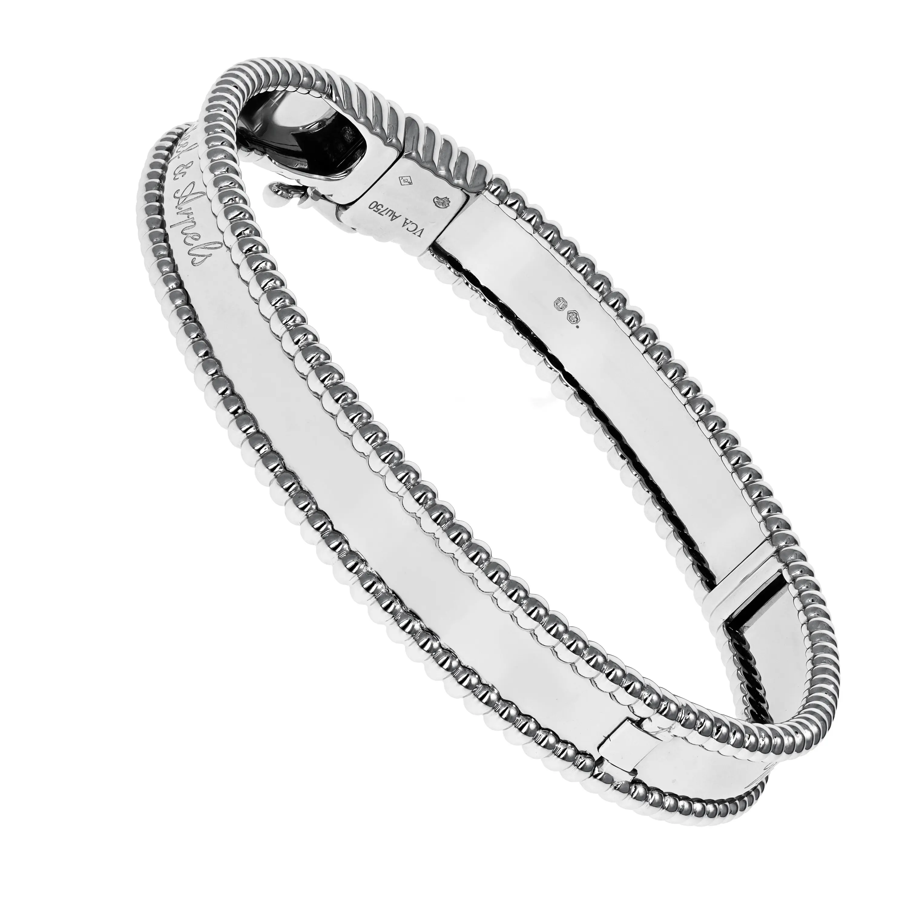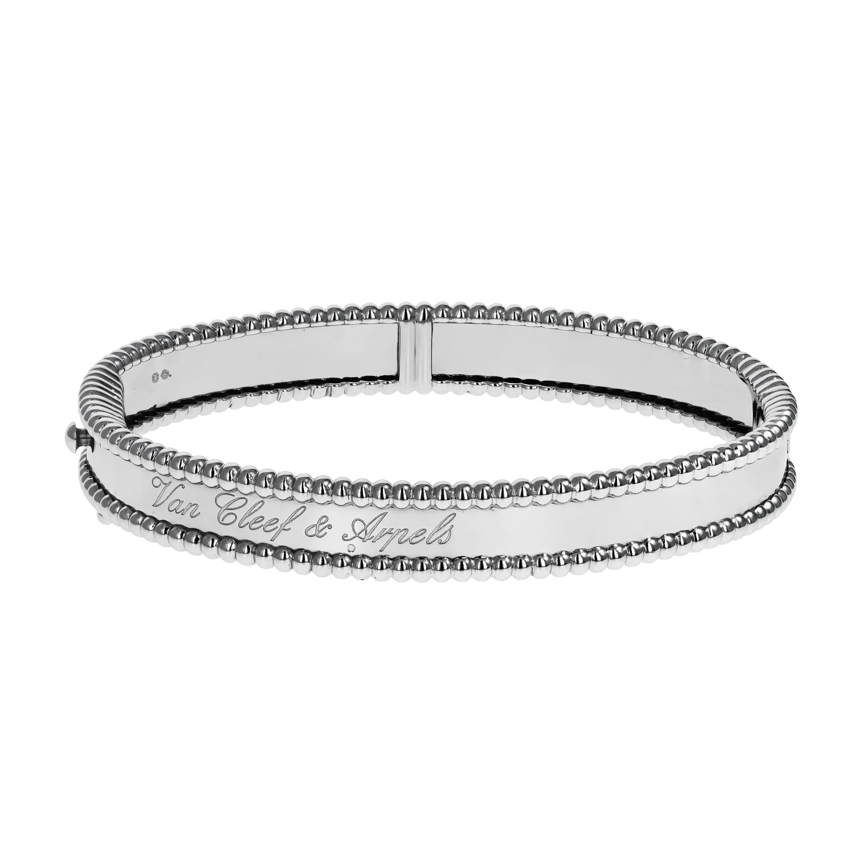 Pre-owned Van Cleef & Arpels 18k white gold bangle bracelet from the Perlée Signature collection. The bracelet features a beaded edge going all the way around the bangle with engraving in the center that reads "Van Cleef & Arpels" in a script design.