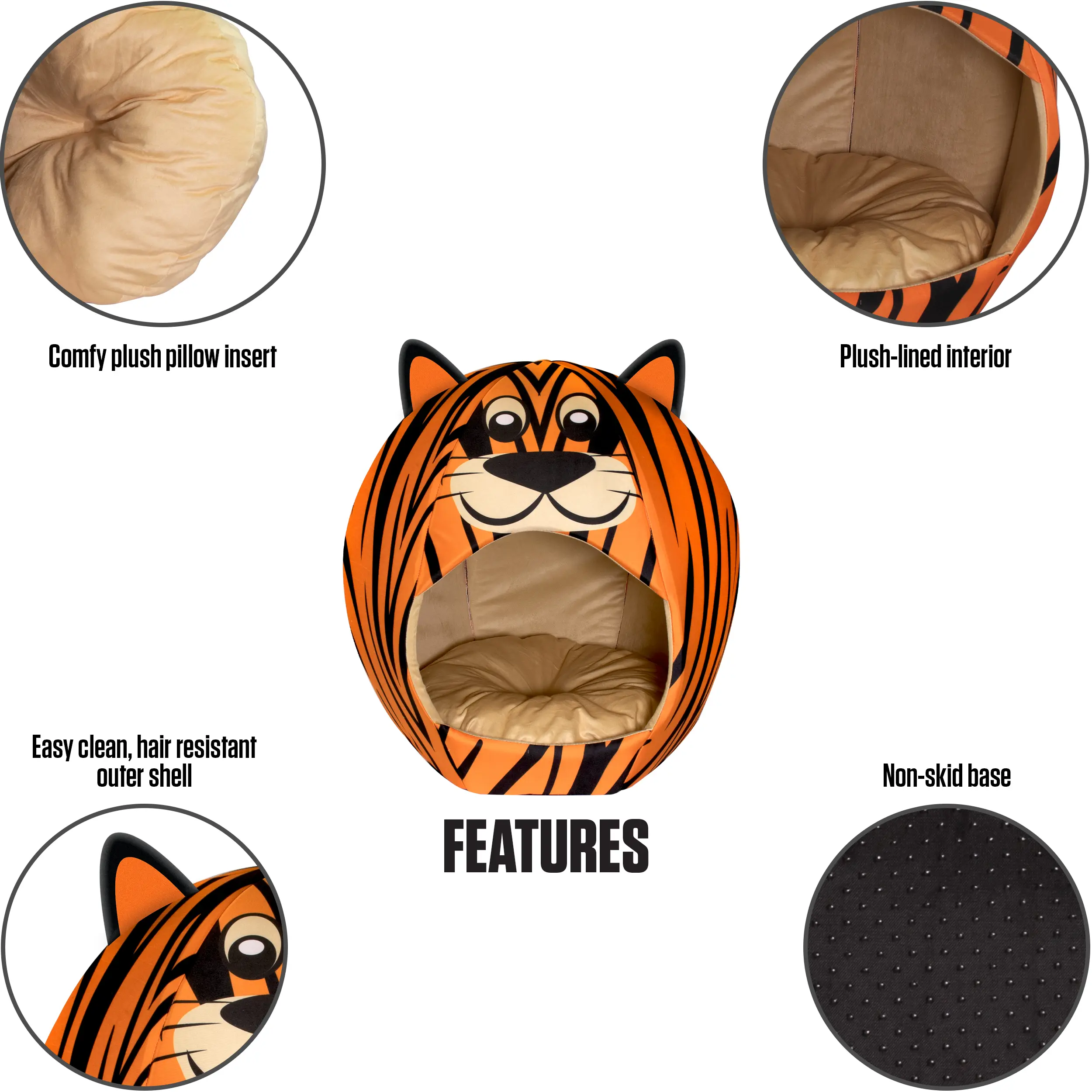 Let your pet's wild side rest in comfort. This Tiger-themed igloo bed combines a bold look with a soft, calming interior.