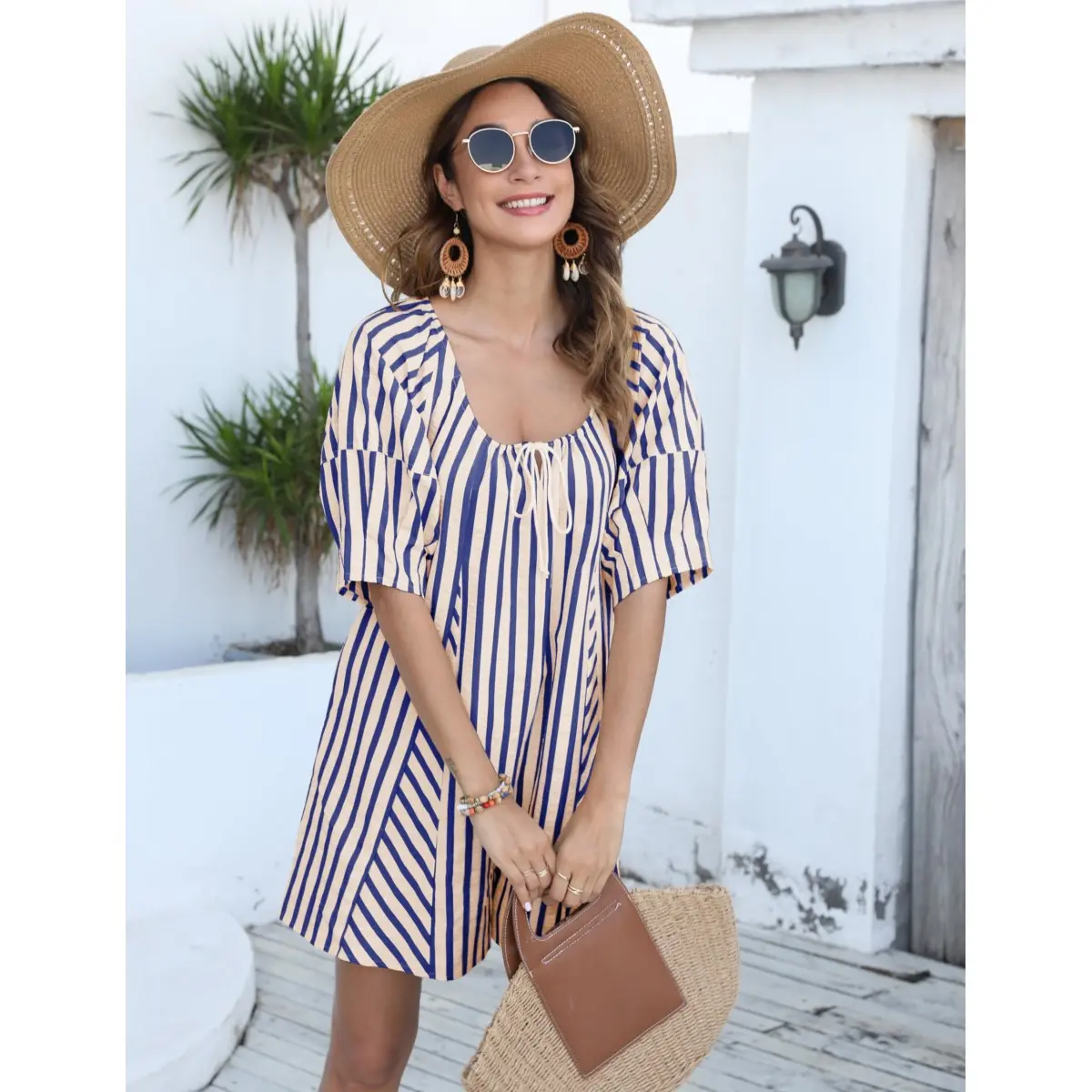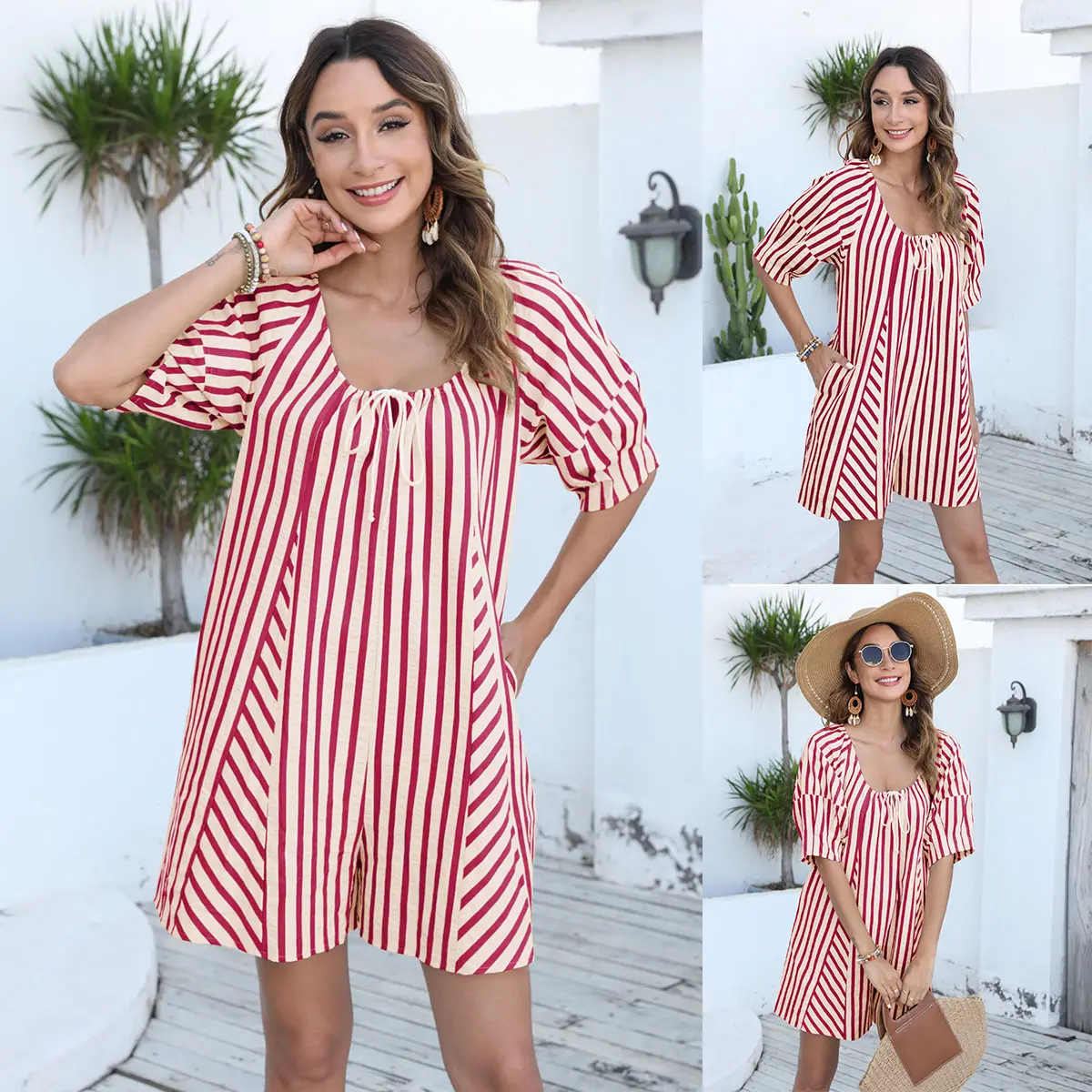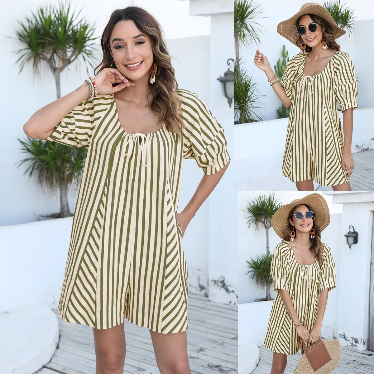 Feature: Scoop neckline with adjustable tie, 3/4 lantern sleeves, side pockerts for hands, keyhole cut out at back with button closurer, casual loose striped print romper that can help you feel lightweight and comfortable.