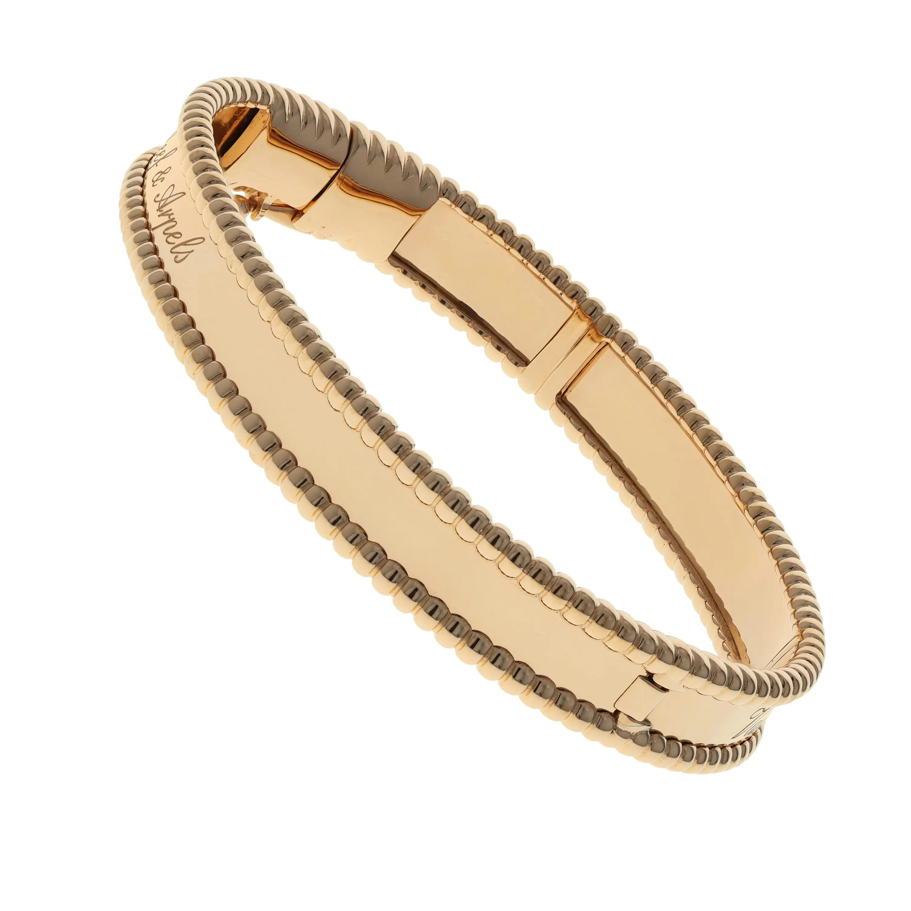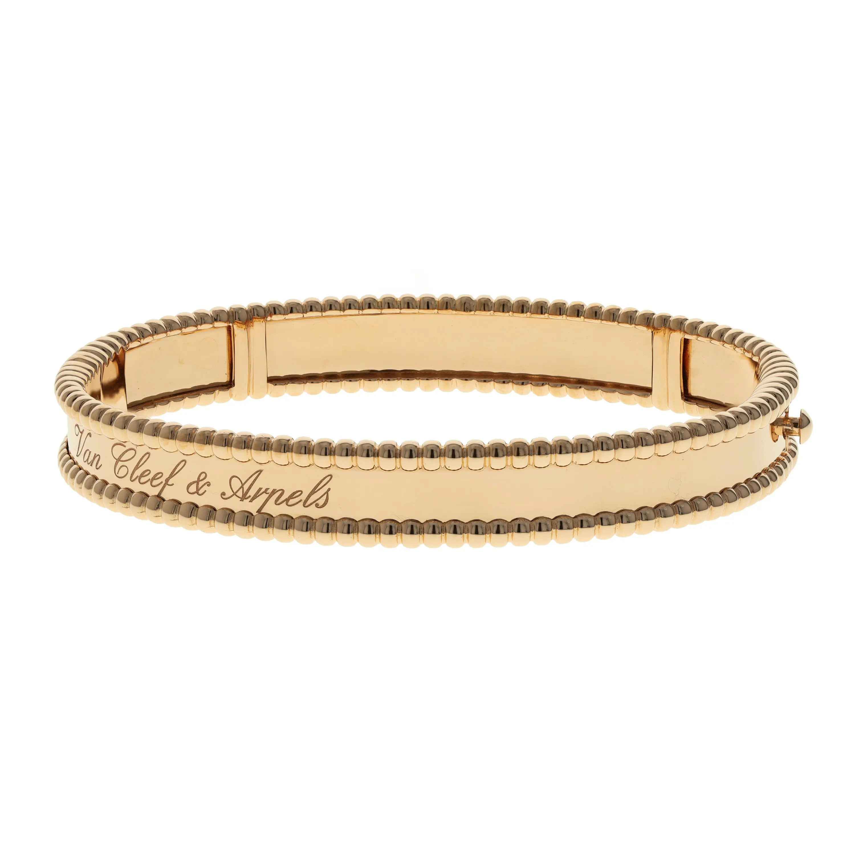 Pre-owned Van Cleef & Arpels 18k rose gold bangle bracelet from the Perlee collection. The bracelet features a polish center band, framed by the signature beaded edging that encircles the entire bangle. The interior center is delicately engraved in script with "Van Cleef & Arpels". The bangle is secured with a hinged, hidden box clasp and comes with the original VCA papers.