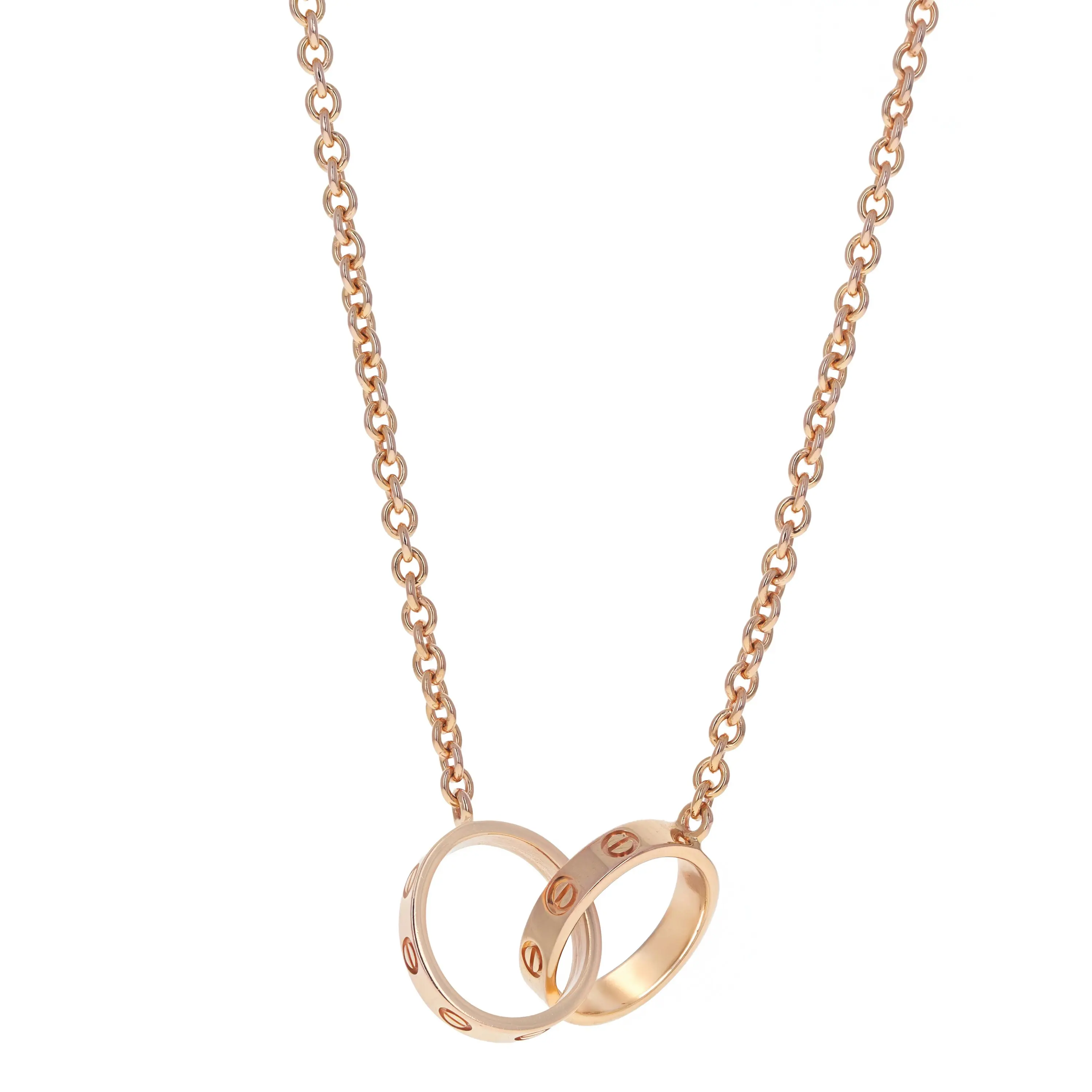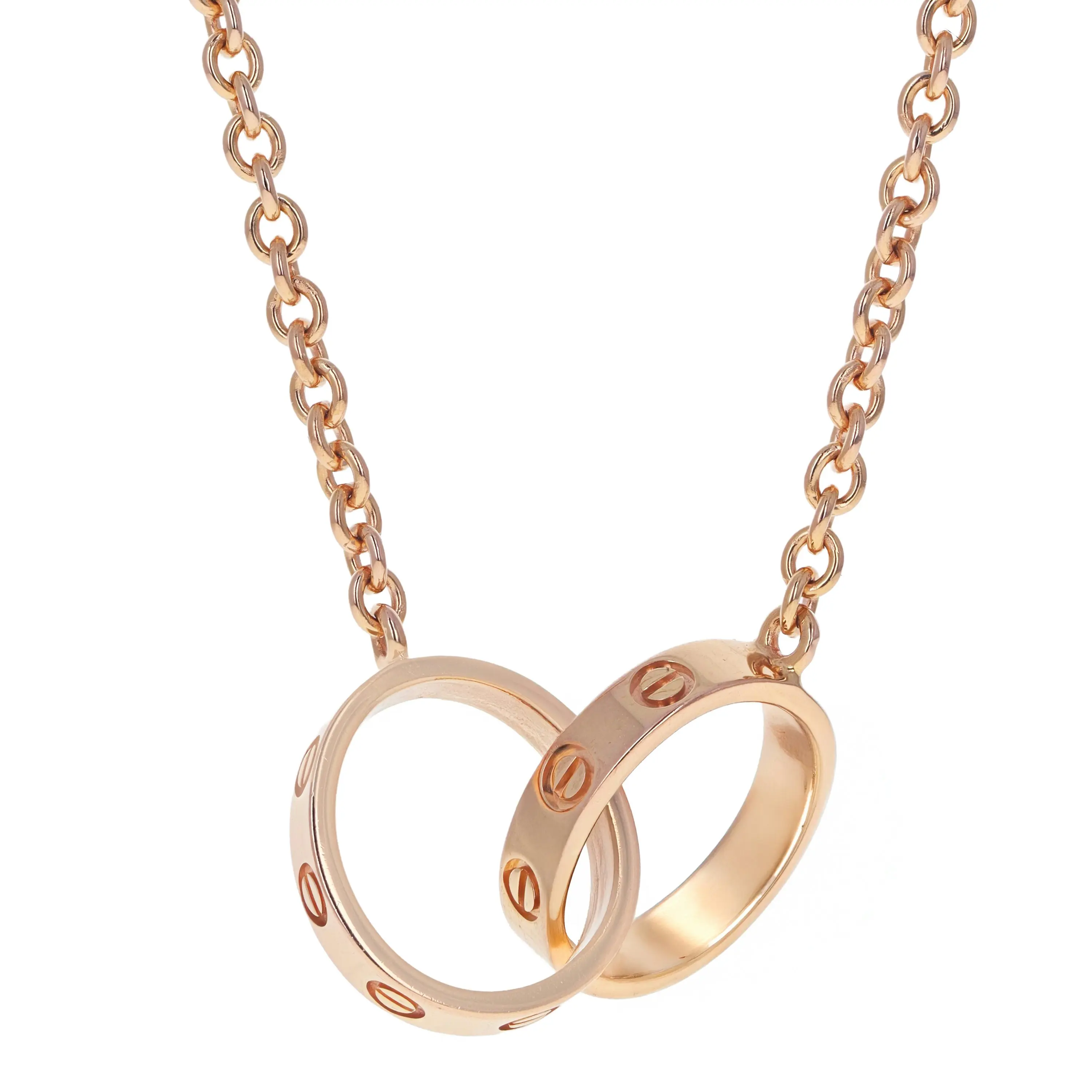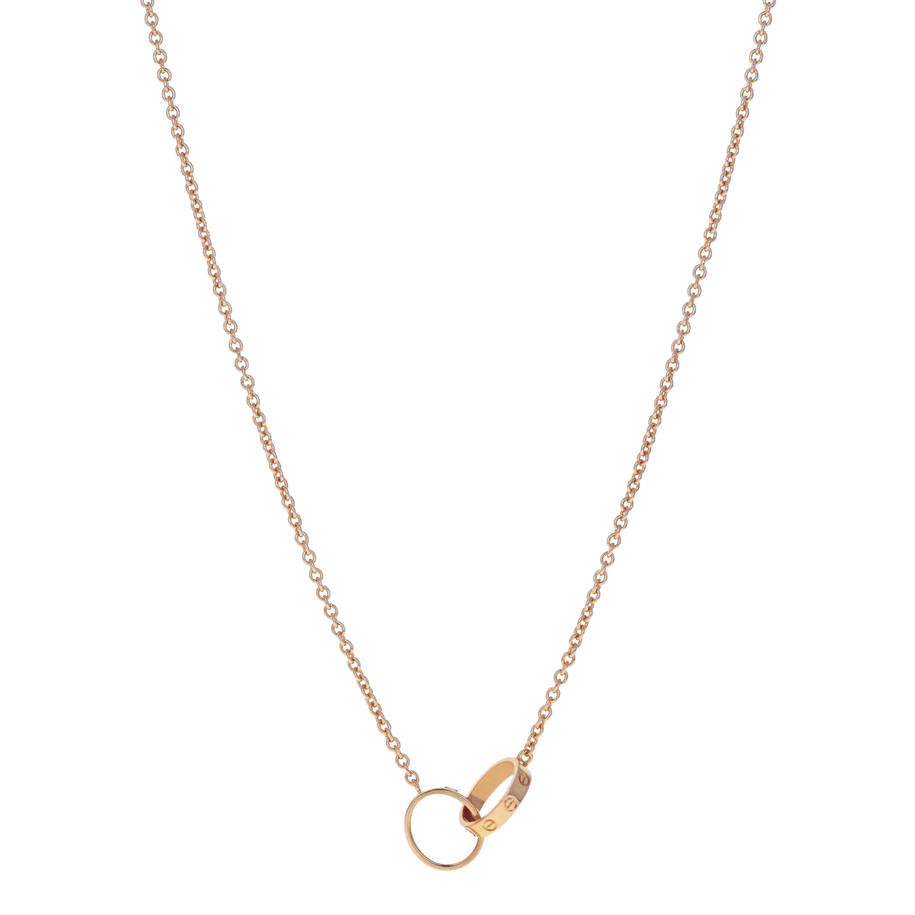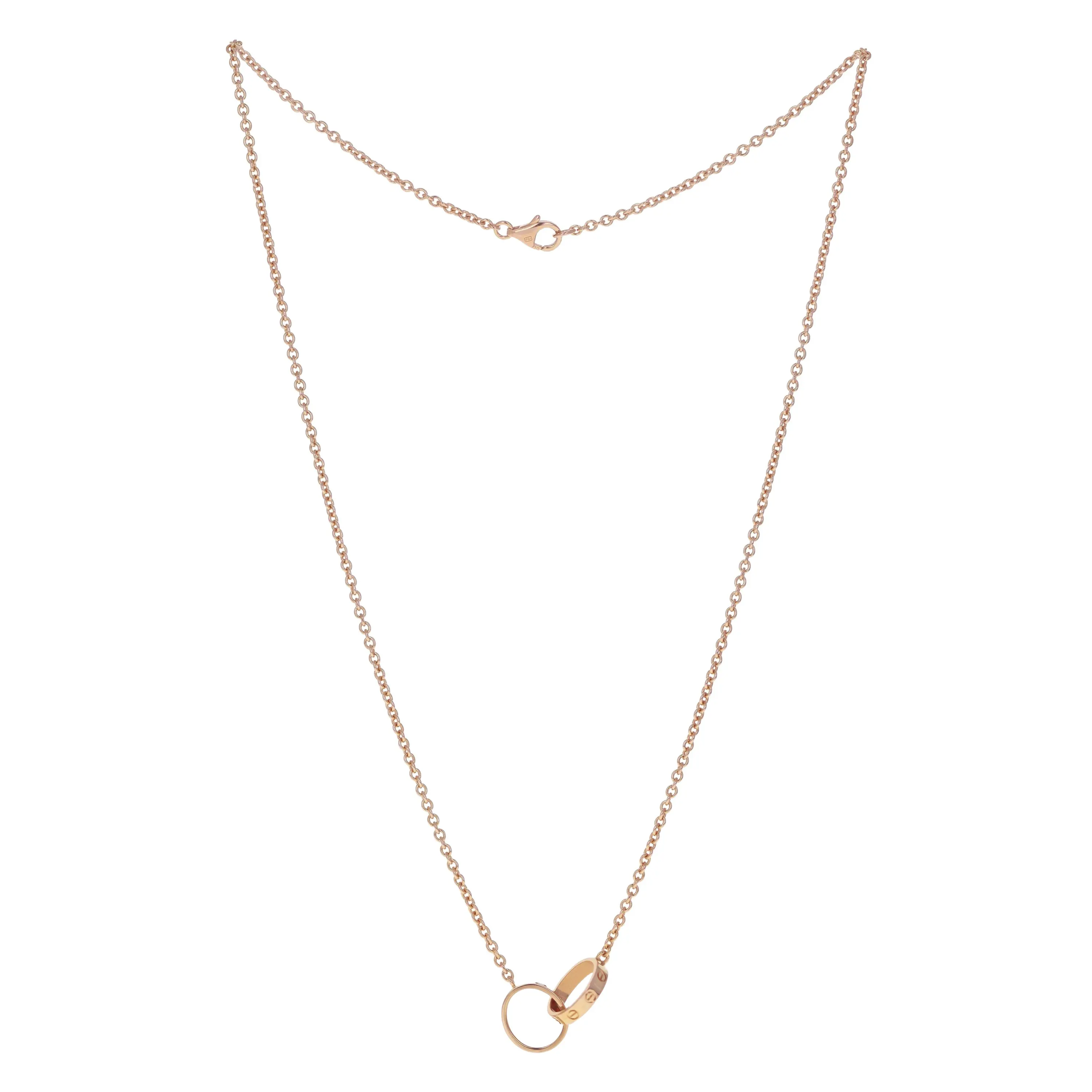 Pre-owned Cartier 18k rose gold pendant necklace from the Love collection. The neckace features two rings that are linked together and each feature the signature screw design. The pendants are stationed at the center of an 18k rose gold cable-link chain that measures 17 inches in length and is secured with a lobster clasp.