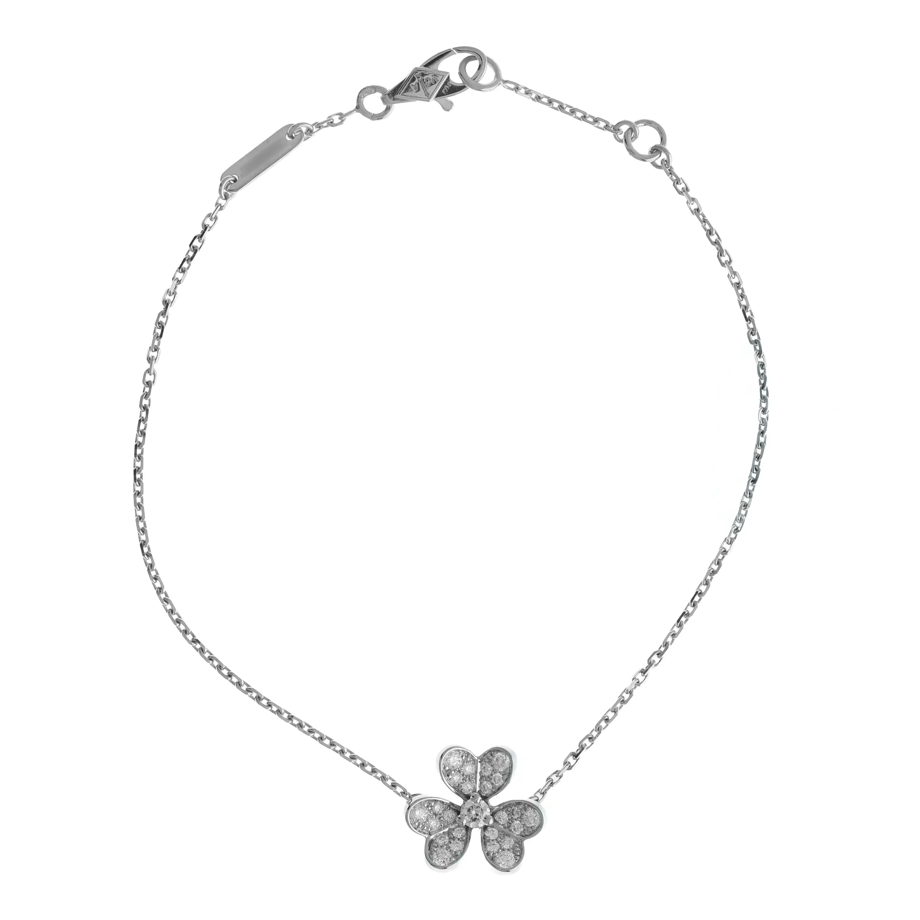 Pre-owned Van Cleef & Arpels 18k white gold and diamond bracelet from the Frivole collection. The bracelet features a single flower with pave round brilliant diamonds set in the petals as well as a singular round brilliant diamond in the center. The flower is stationed on a cable-link chain that measures 7 inches in length and is secured with a lobster clasp. This piece comes with the original VCA papers.