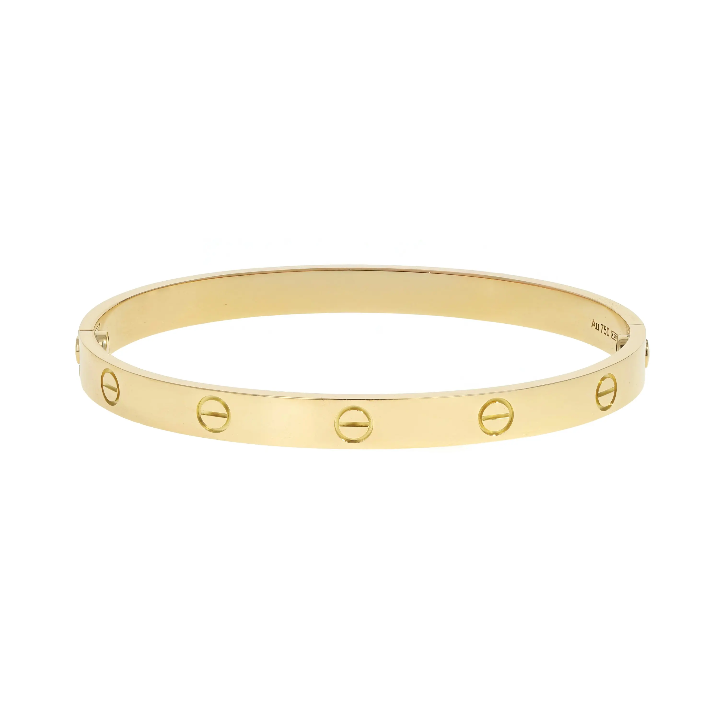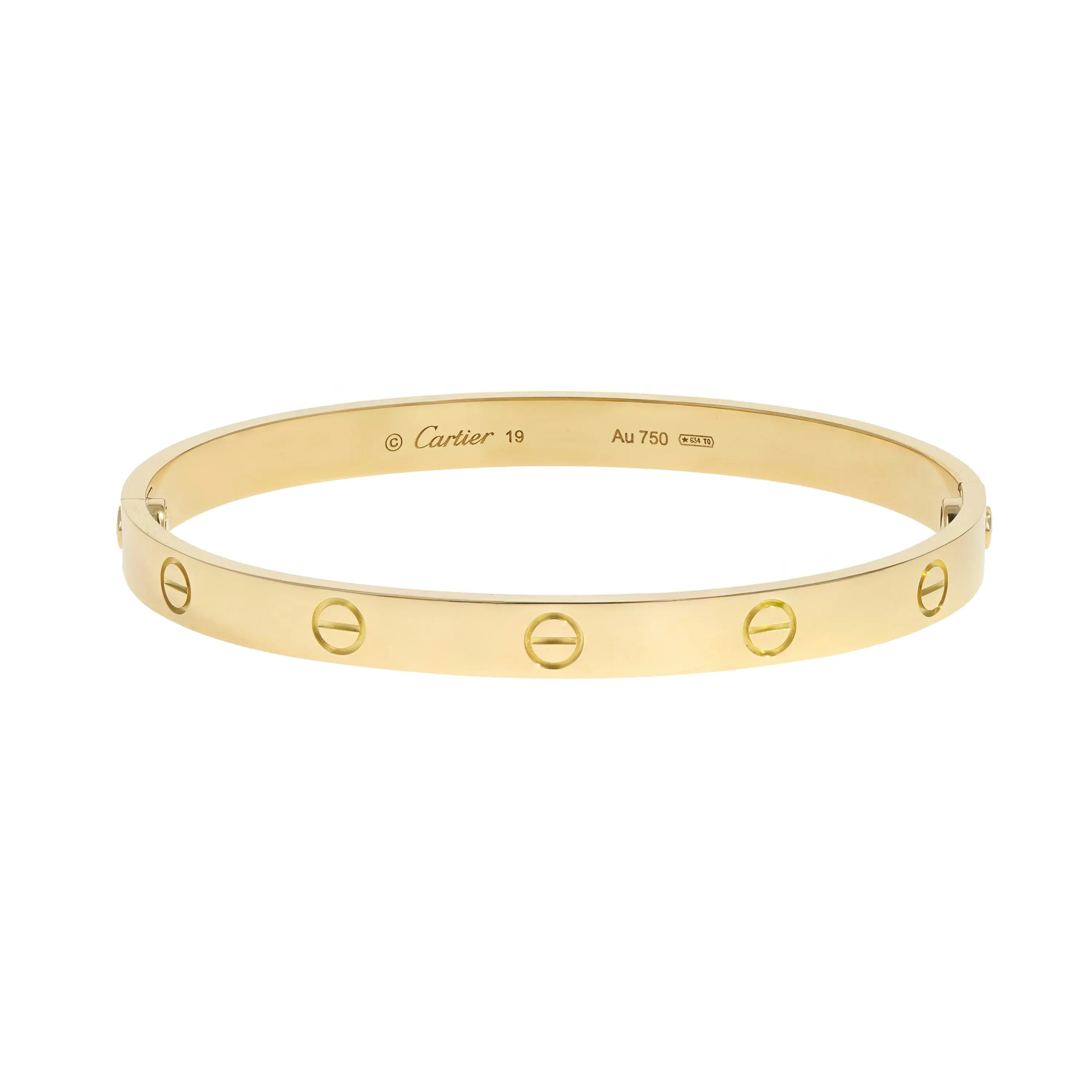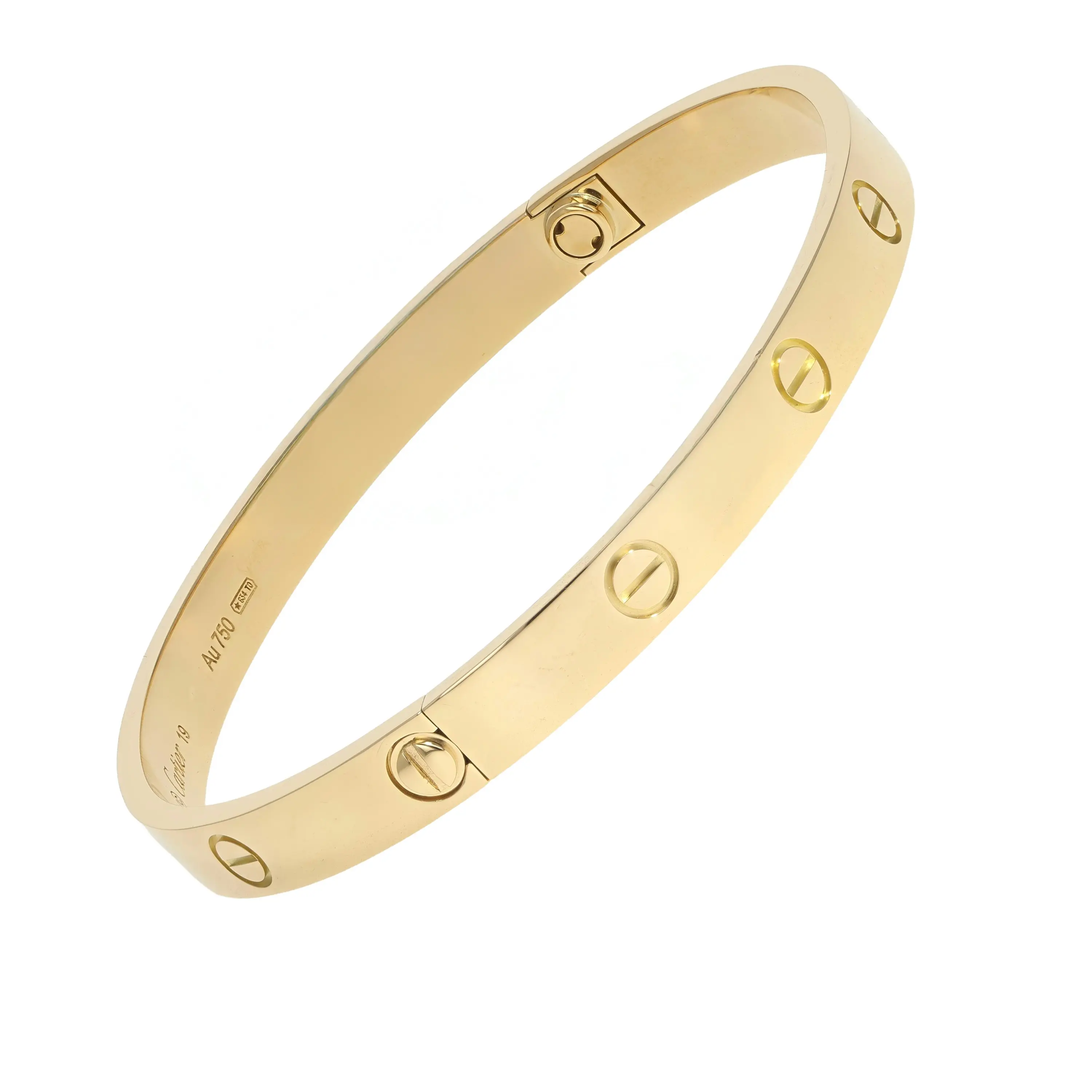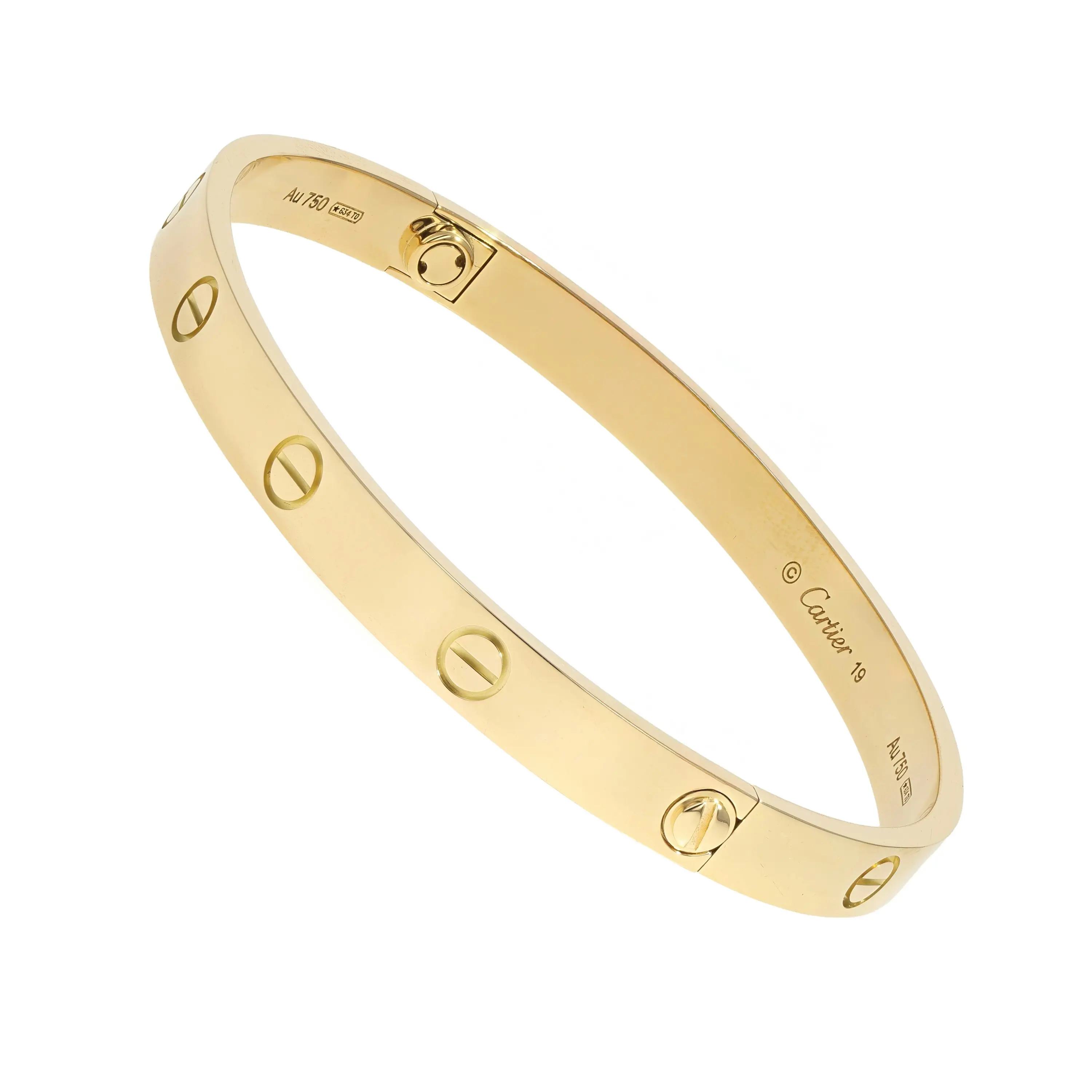 Pre-owned Cartier 18k yellow gold bangle bracelet from the Love collection. The bracelet features the signature screw design evenly spaced throughout. The bangle is a size 19 and comes with the original Cartier papers.