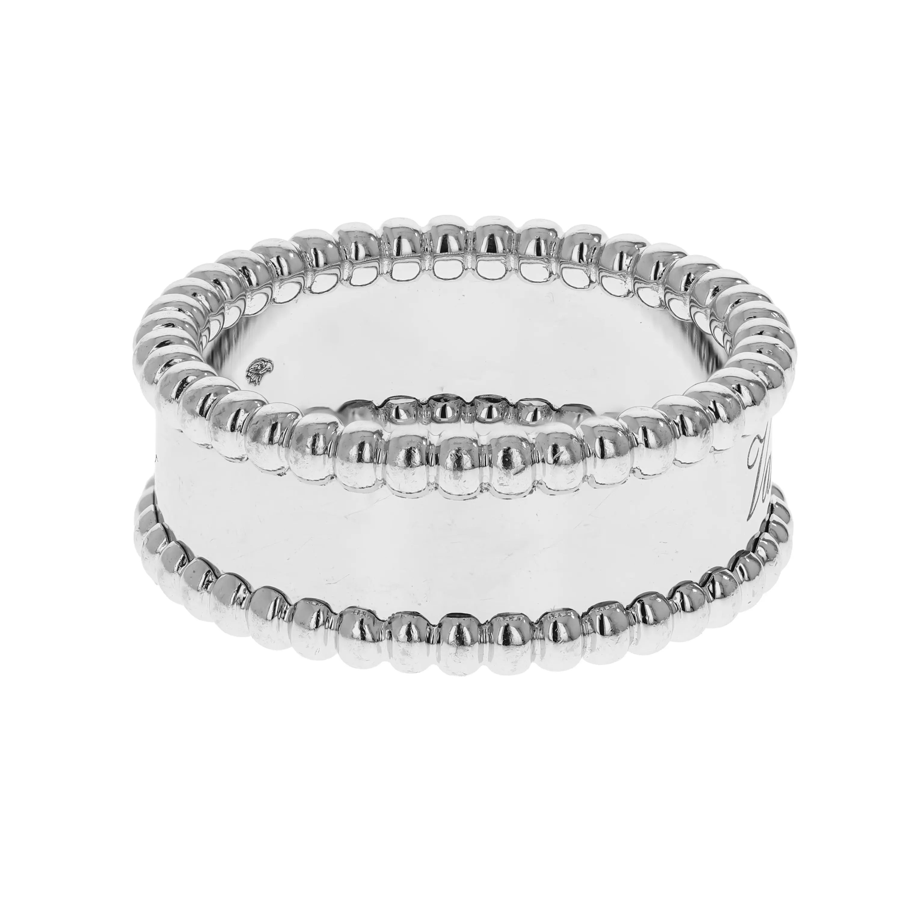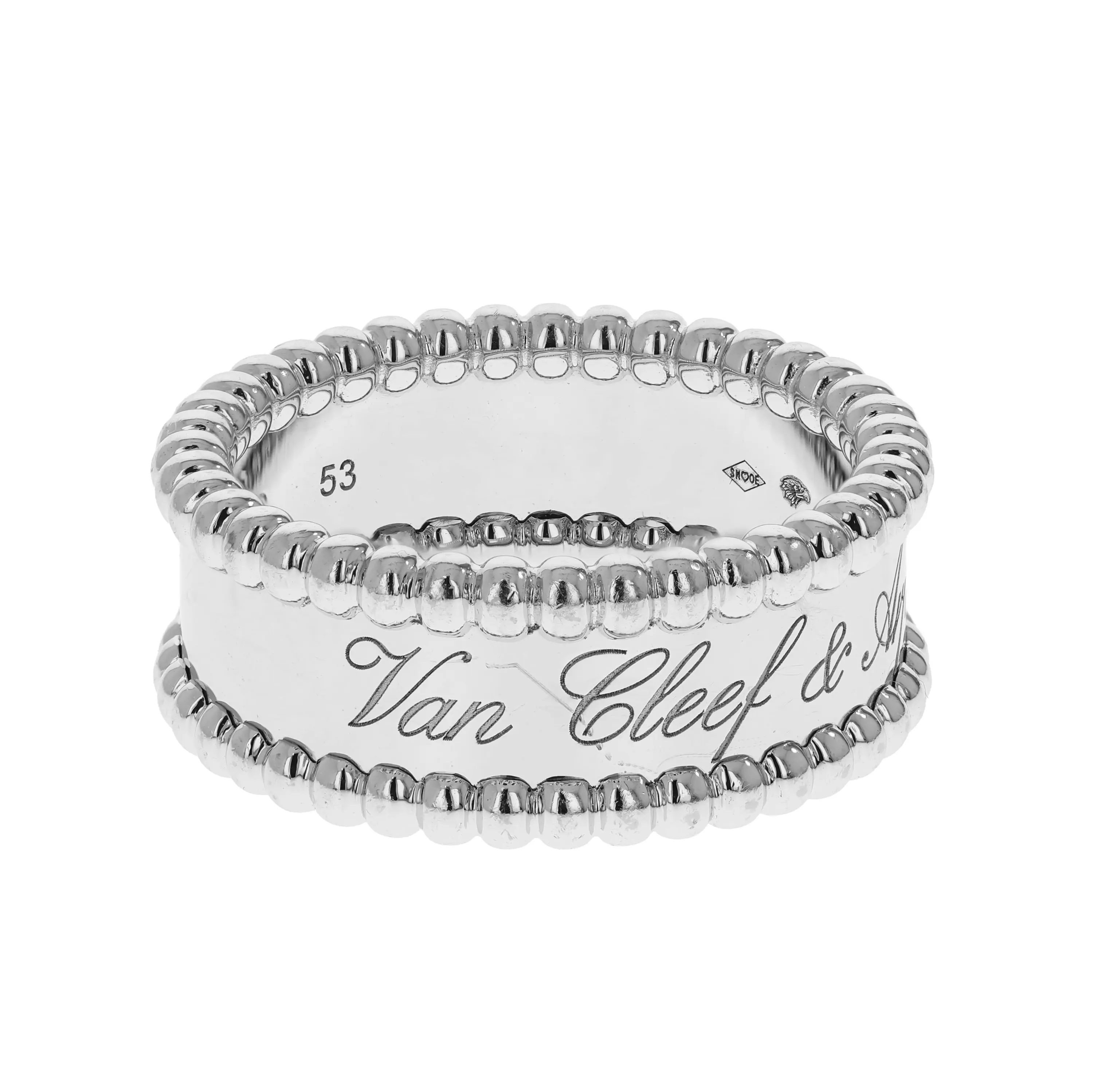 Pre-owned Van Cleef & Arpels 18k white gold ring from the Perlée Signature collection. The ring is a polished band that features a beaded edge that goes all the way around the ring. The center of the band is engraved with "Van Cleef & Arpels" in a script design. This piece is in a size 53 and comes with the original papers.