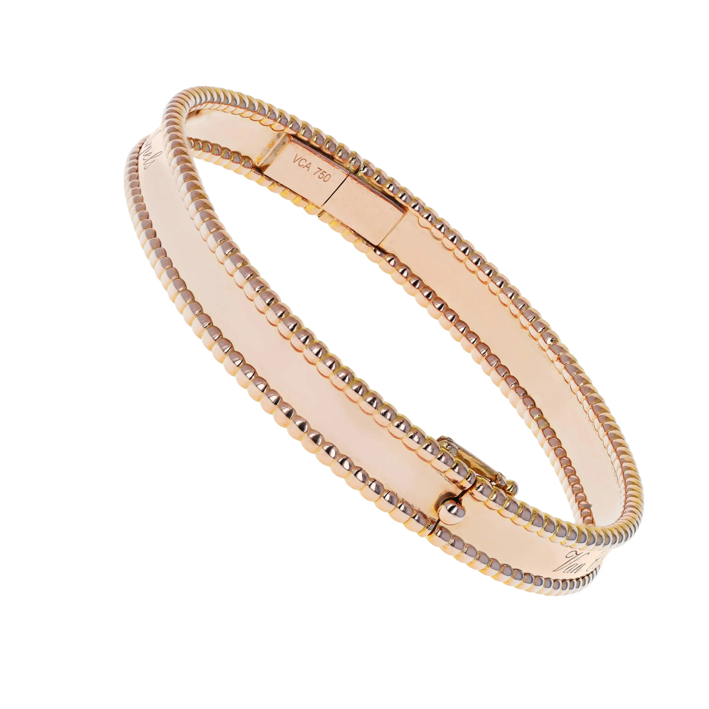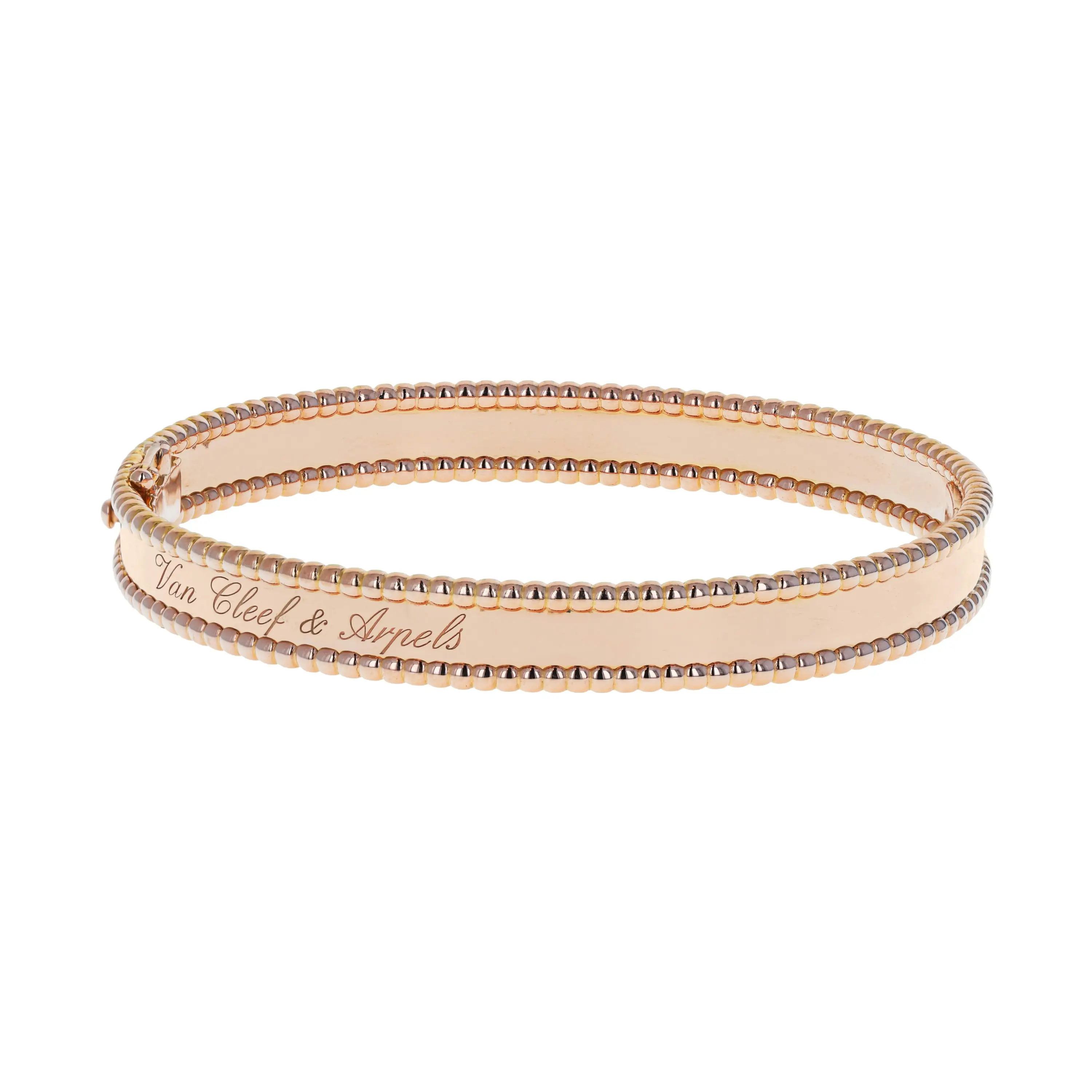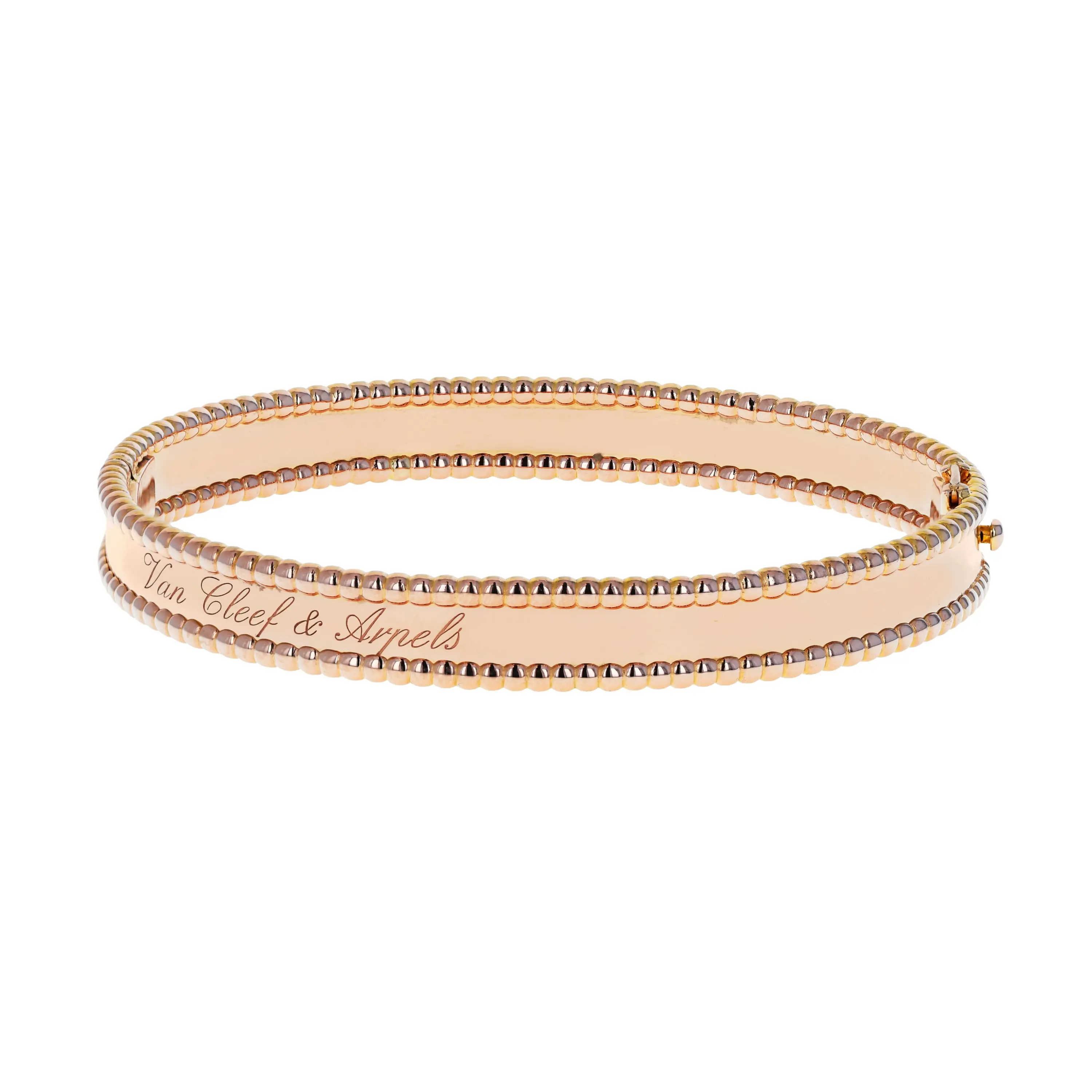 Pre-owned Van Cleef & Arpels 18k rose gold bangle bracelet from the Perlée Signature collection. The bracelet features a polished finish and has a beaded edge around the entire bangle. The center of the piece reads "Van Cleef & Arpels" in a script engraving. The bracelet is the medium model and is secured by a hidden box clasp. This piece comes with the original VCA papers.