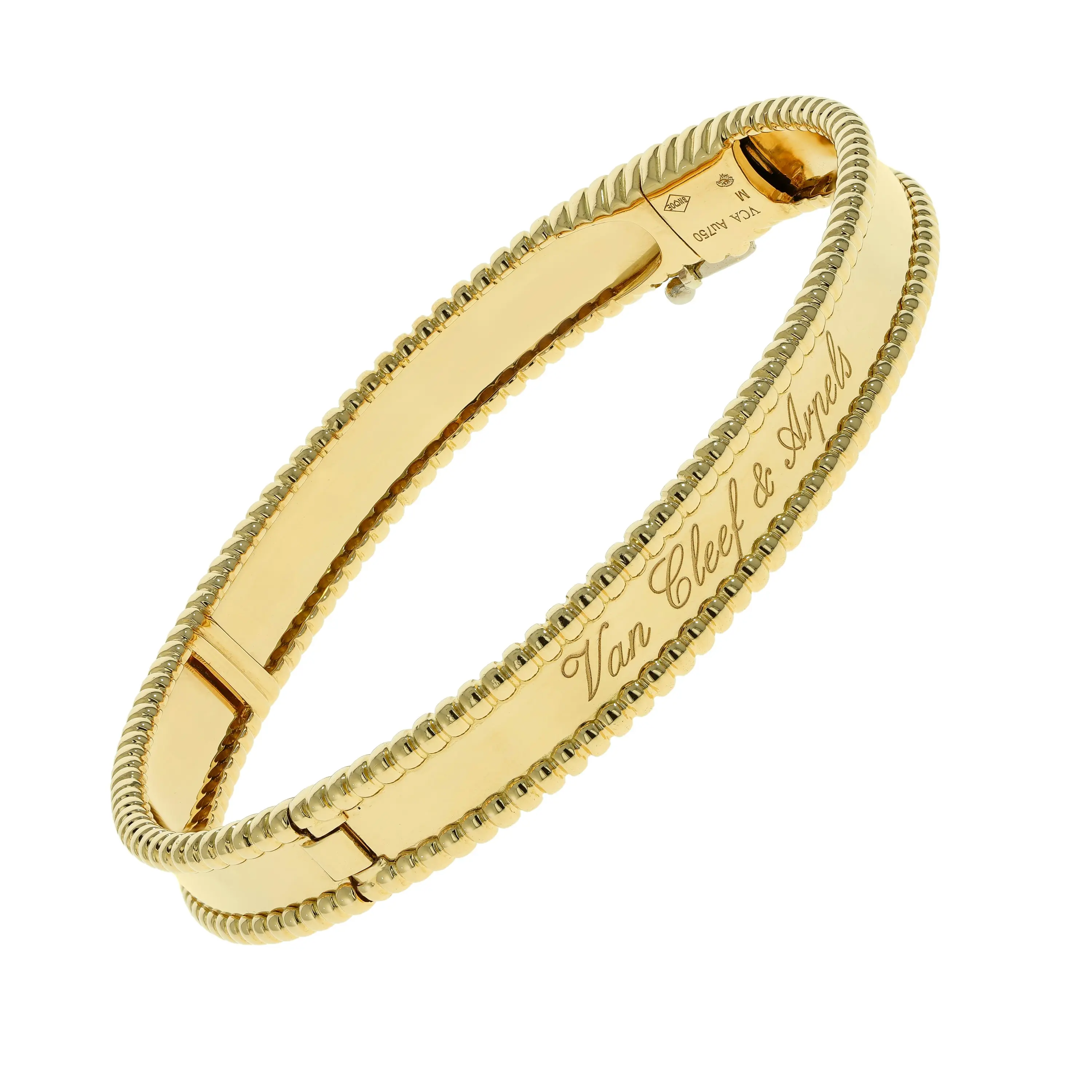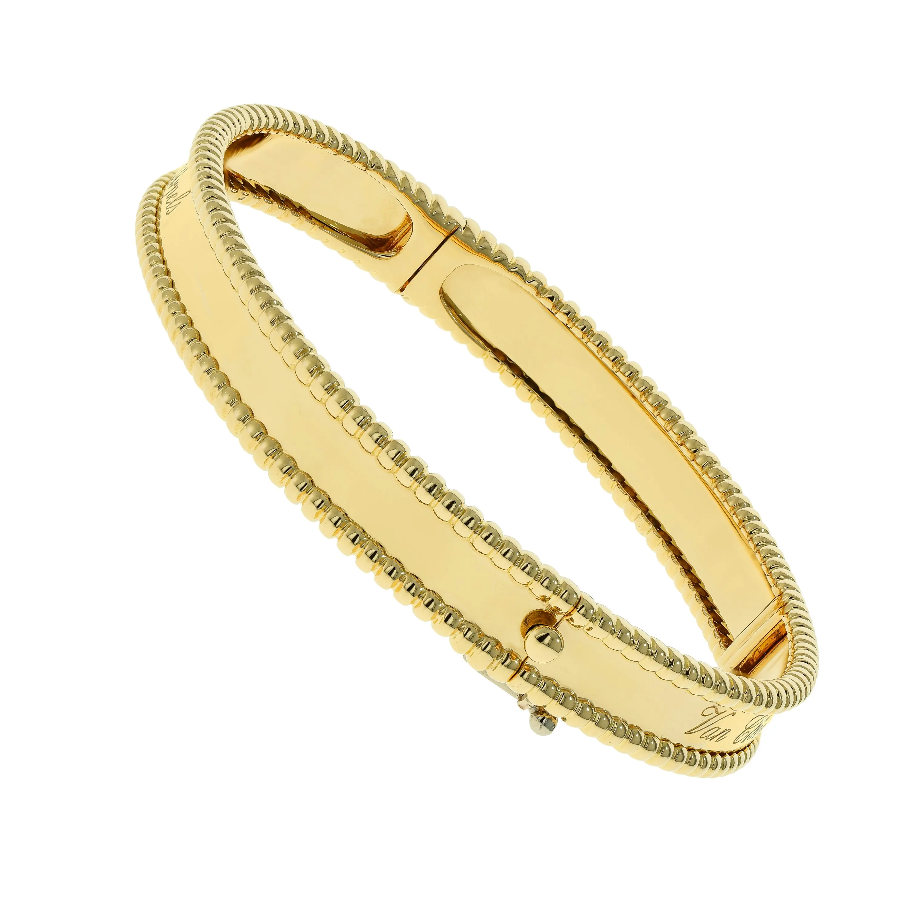 Pre-owned Van Cleef & Arpels 18k yellow gold bangle bracelet from the Perlee collection. The bracelet features a polished center band that is framed by the signature beaded edge that encircles the entire bangle. The interior center is dlicately engraved in script with "Van Cleef & Arpels". This piece comes with the original VCA papers.