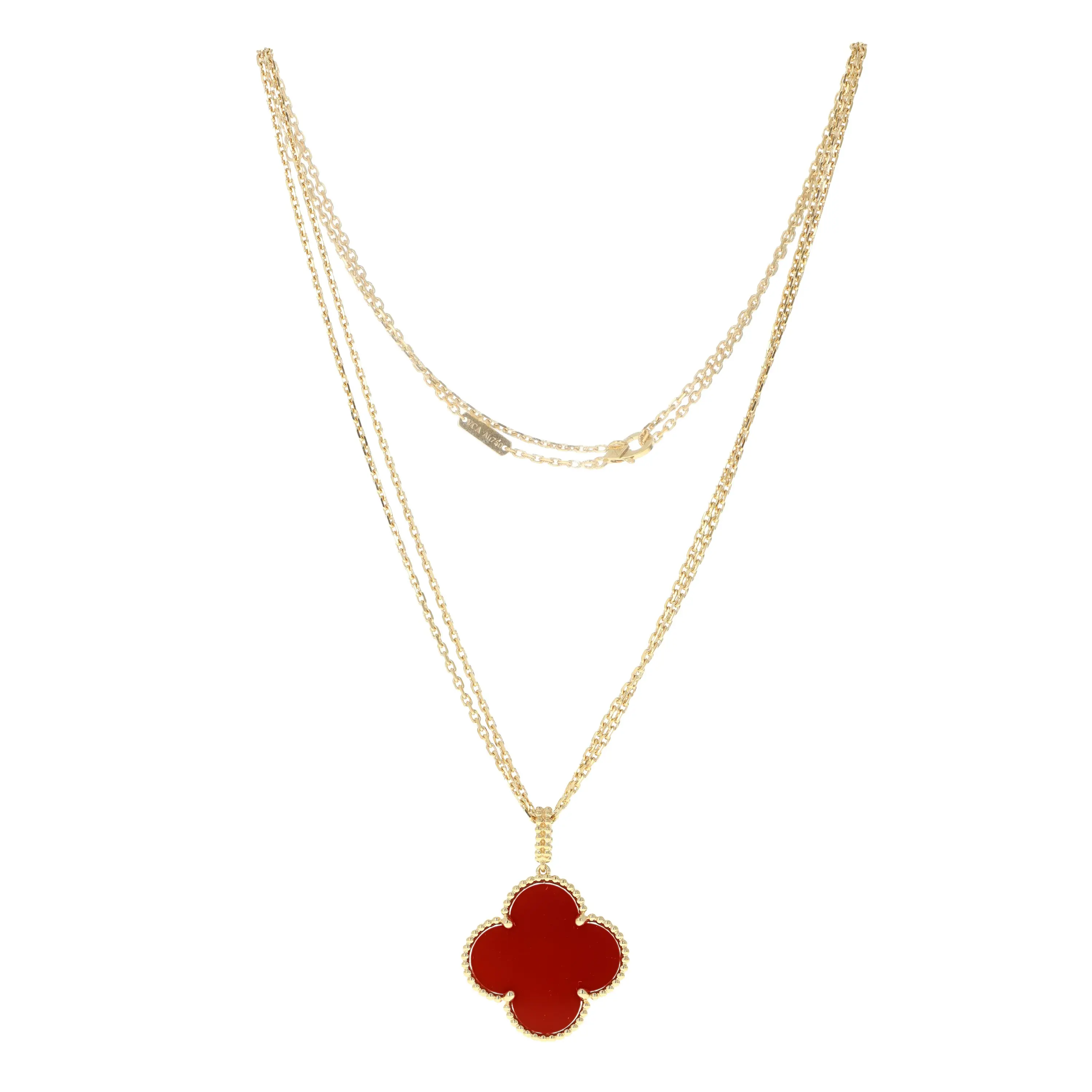 Pre-owned Van Cleef & Arpels 18k yellow gold and carnelian pendant necklace from the Magic Alhambra collection. The necklace features a single large four petal motif pendant with a carnelian stone. The pendant is sliding on a cable-link chain that measures 36 inches in length. This piece comes with the original VCA papers.