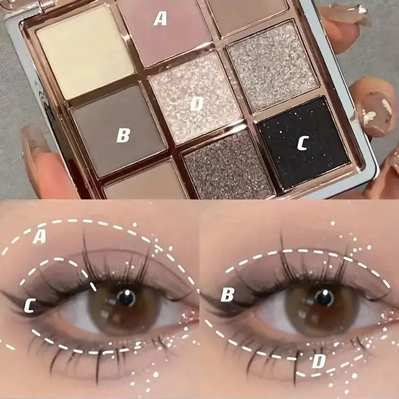 9-color eyeshadow palette - a blend of smoky grey, brown and pink tones, mousse eyeshadow, matte and shimmery finishes, fine Shimmery glitter, low saturation all-in-one palette with matte earthy tones, fine powder texture that doesn't fly off