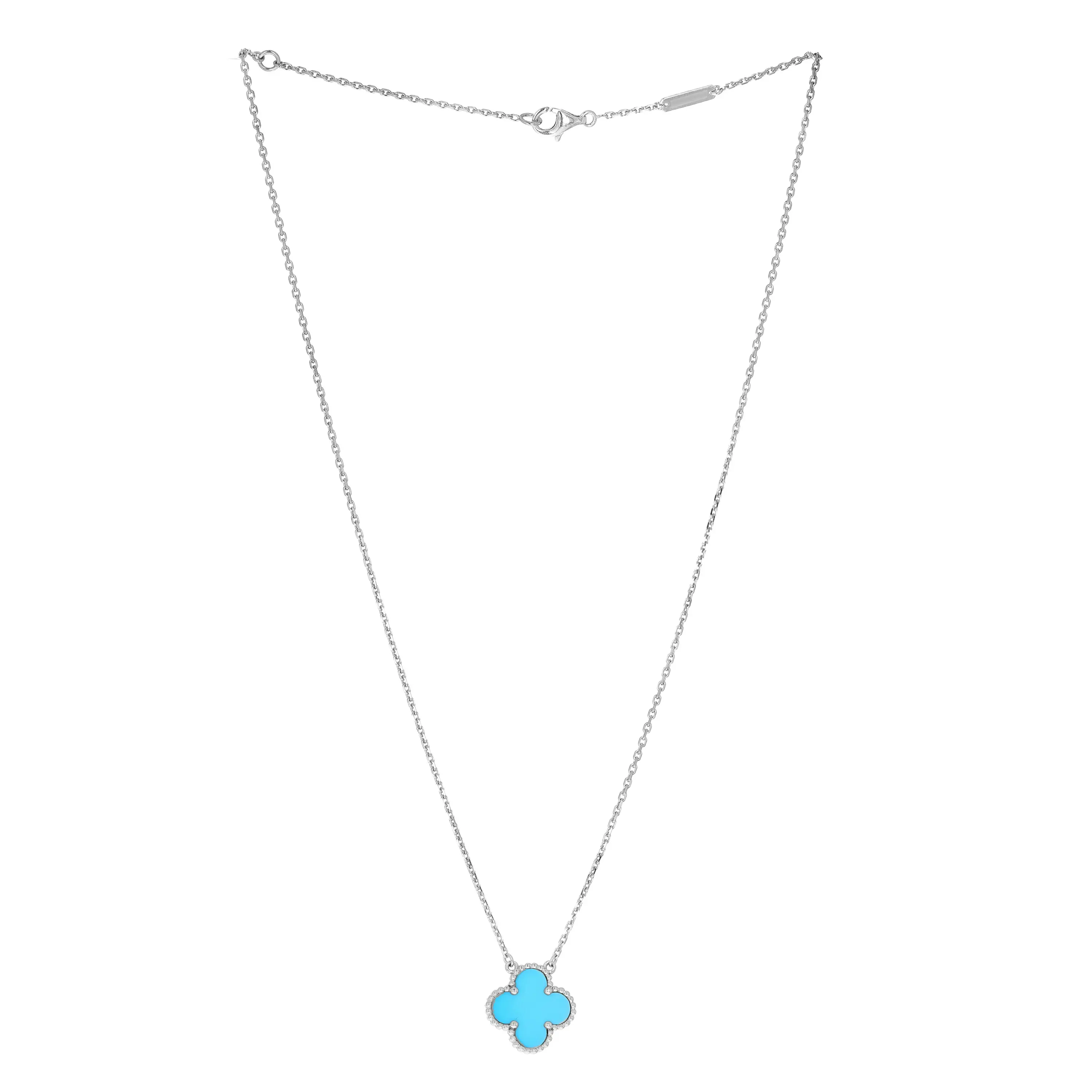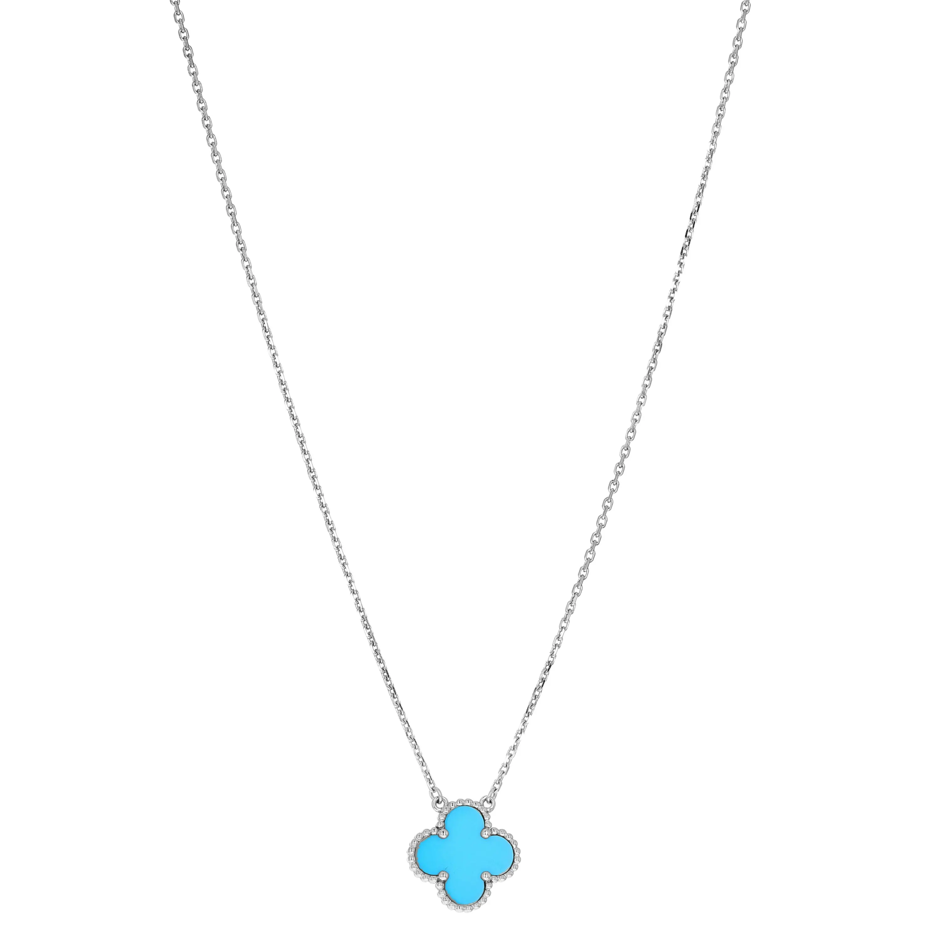 Pre-owned Van Cleef & Arpels 18k white gold and turquoise pendant necklace from the Vintage Alhambra collection. The necklace features a single signature four petal motif pendant that is set with a turquoise stone. The pendant is stationed at the center of an 18k white gold cable-link chain that measures 16.5 inches in length and is secured with a lobster clasp. This piece comes with the original box.