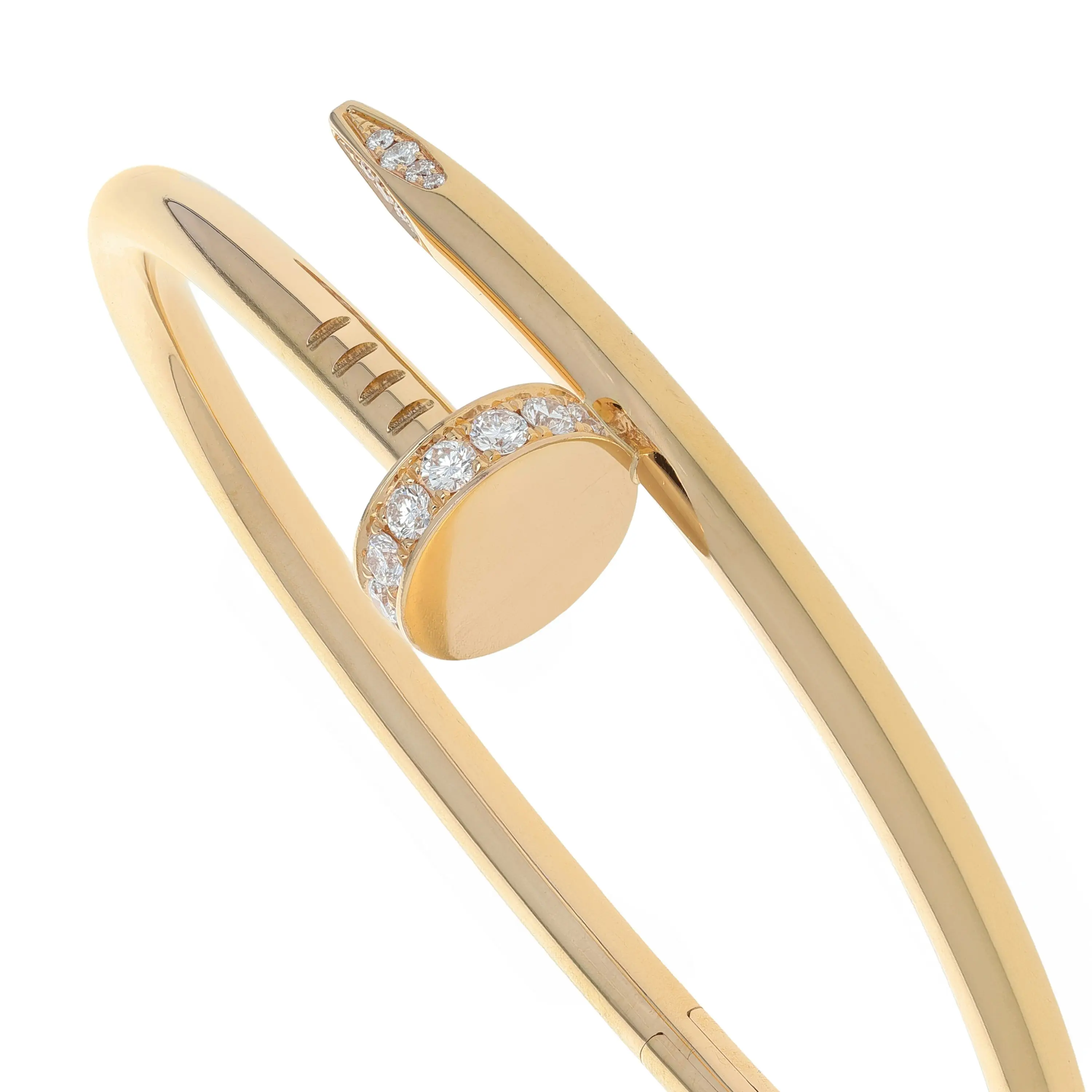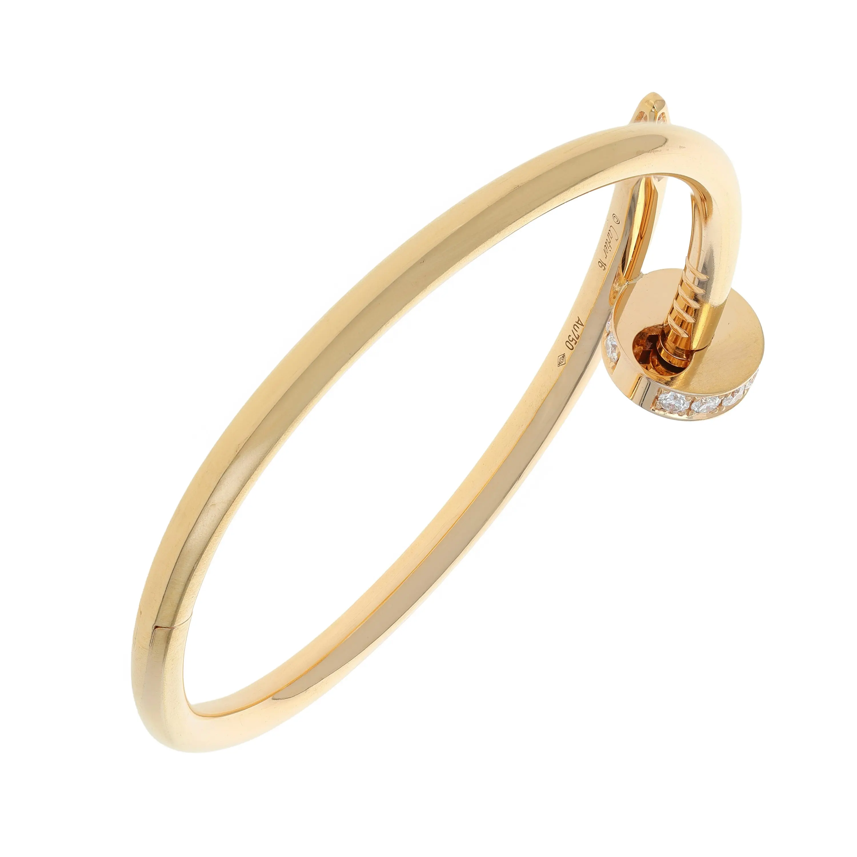 Pre-owned Cartier 18k yellow gold and diamond bangle bracelet from the Juste Un Clou collection. The bracelet features a nail design that wraps once around the wrist and is secured with a hidden hinged closure. Round brilliant diamonds accent both ends of the bangle. This piece is in a size 16.
