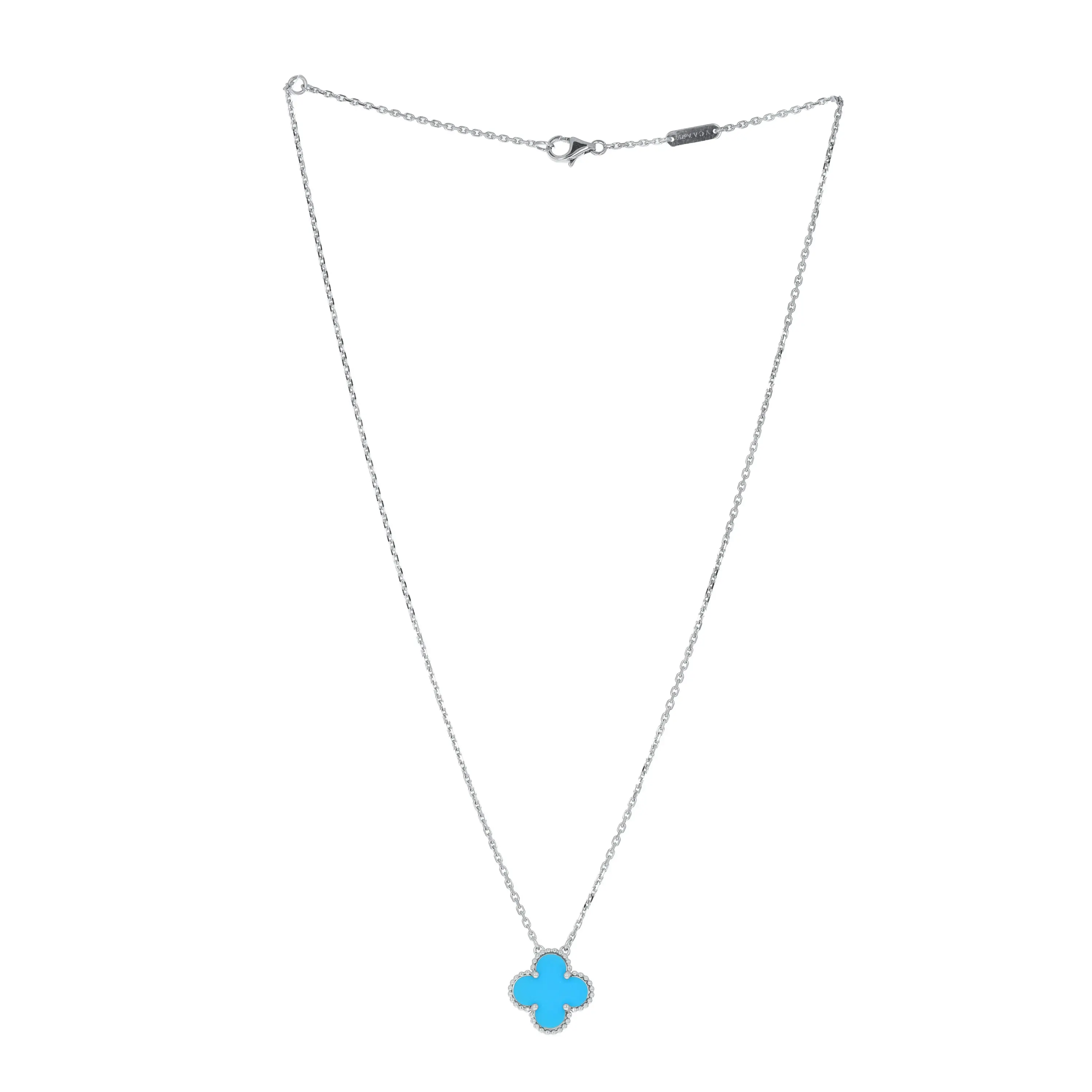 Pre-owned Van Cleef & Arpels 18k white gold and turquoise pendant necklace from the Vintage Alhambra collection. The necklace features a single signature four petal motif pendant that is set with a turquoise stone. The pendant is stationed at the center of an 18k white gold cable-link chain that measures 16.5 inches in length and is secured with a lobster clasp.