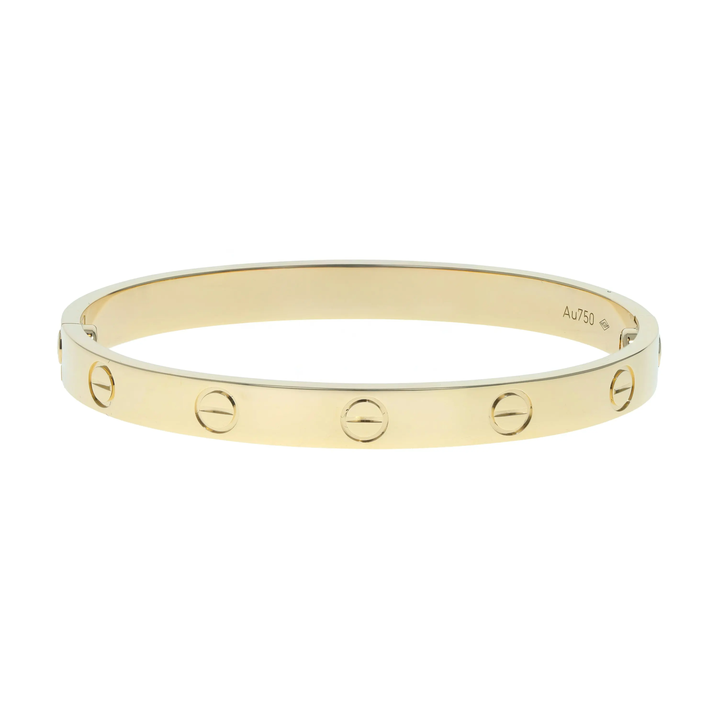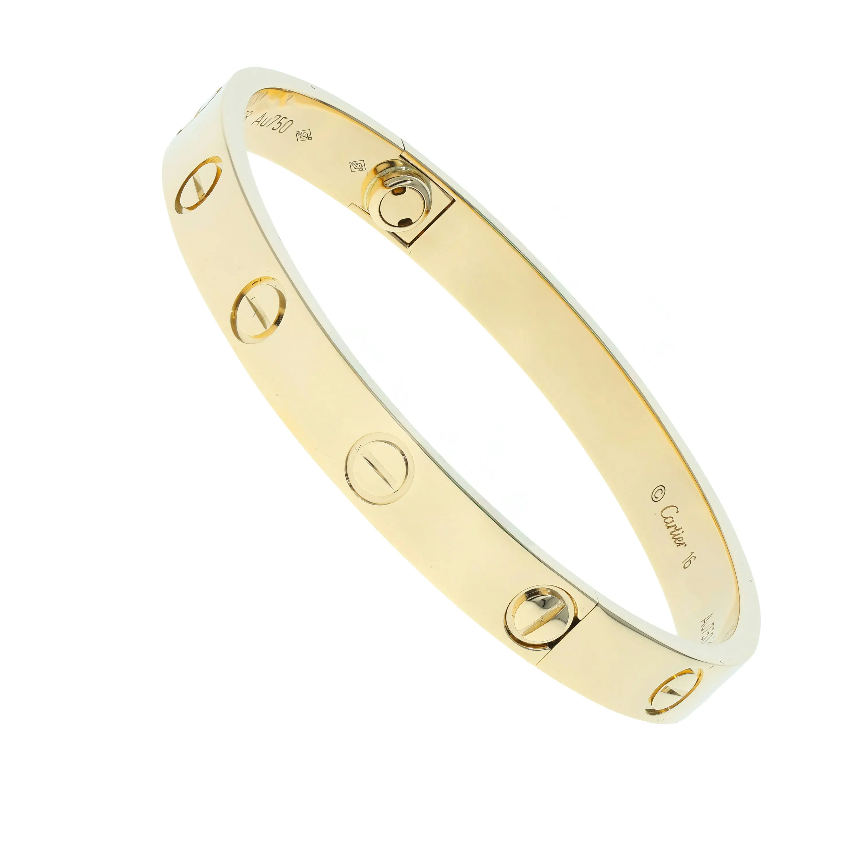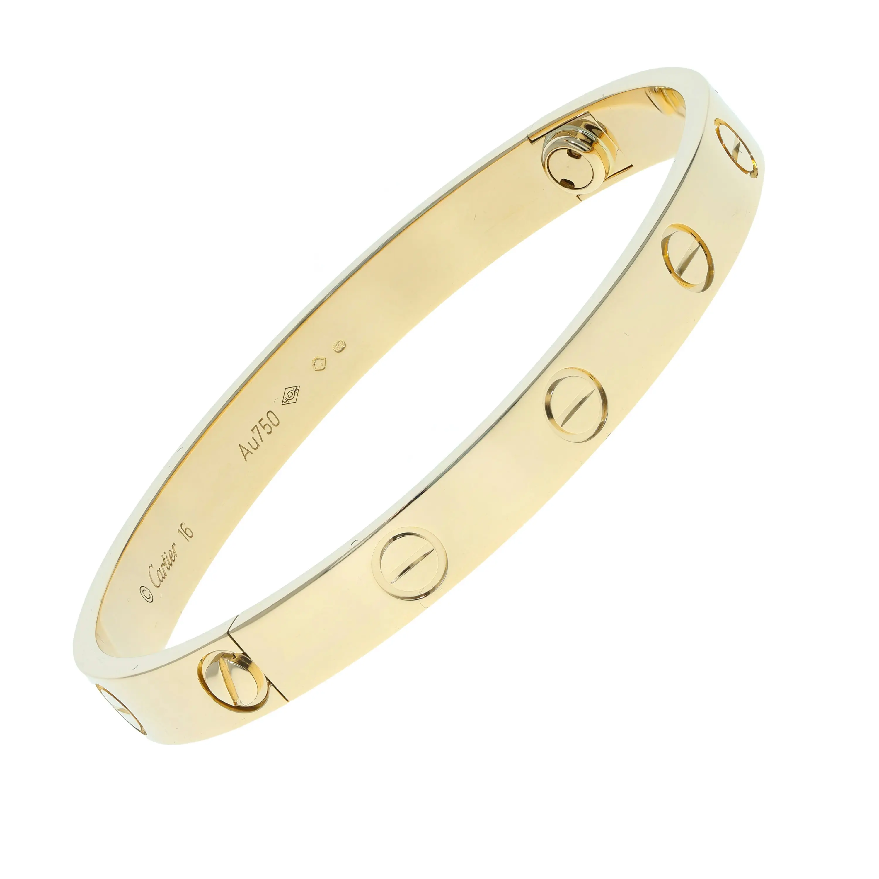 Pre-owned Cartier 18k yellow gold bangle bracelet from the Love collection. The bracelet features the signature screw design evenly spaced around the bangle. This piece is a size 16 and comes with the original papers.