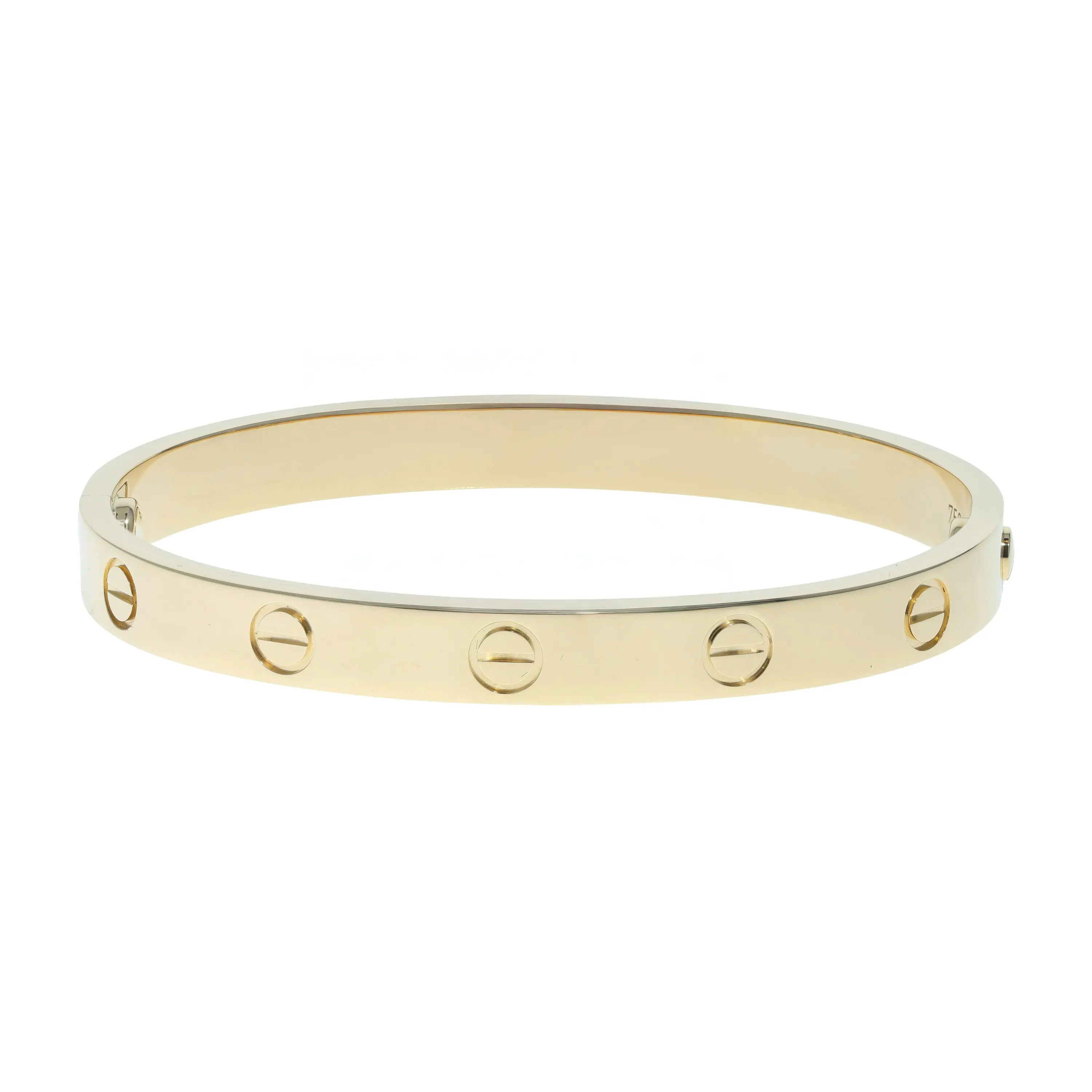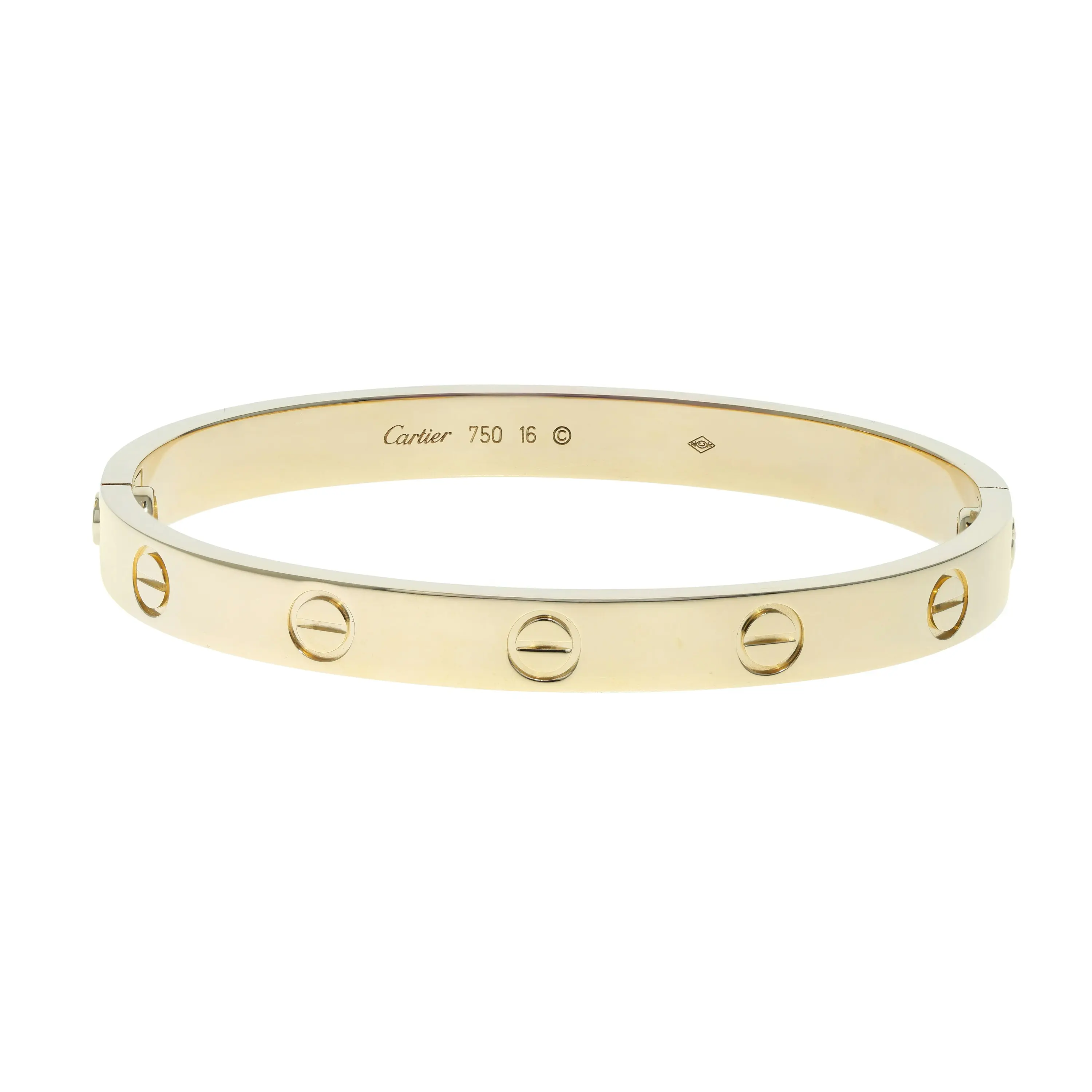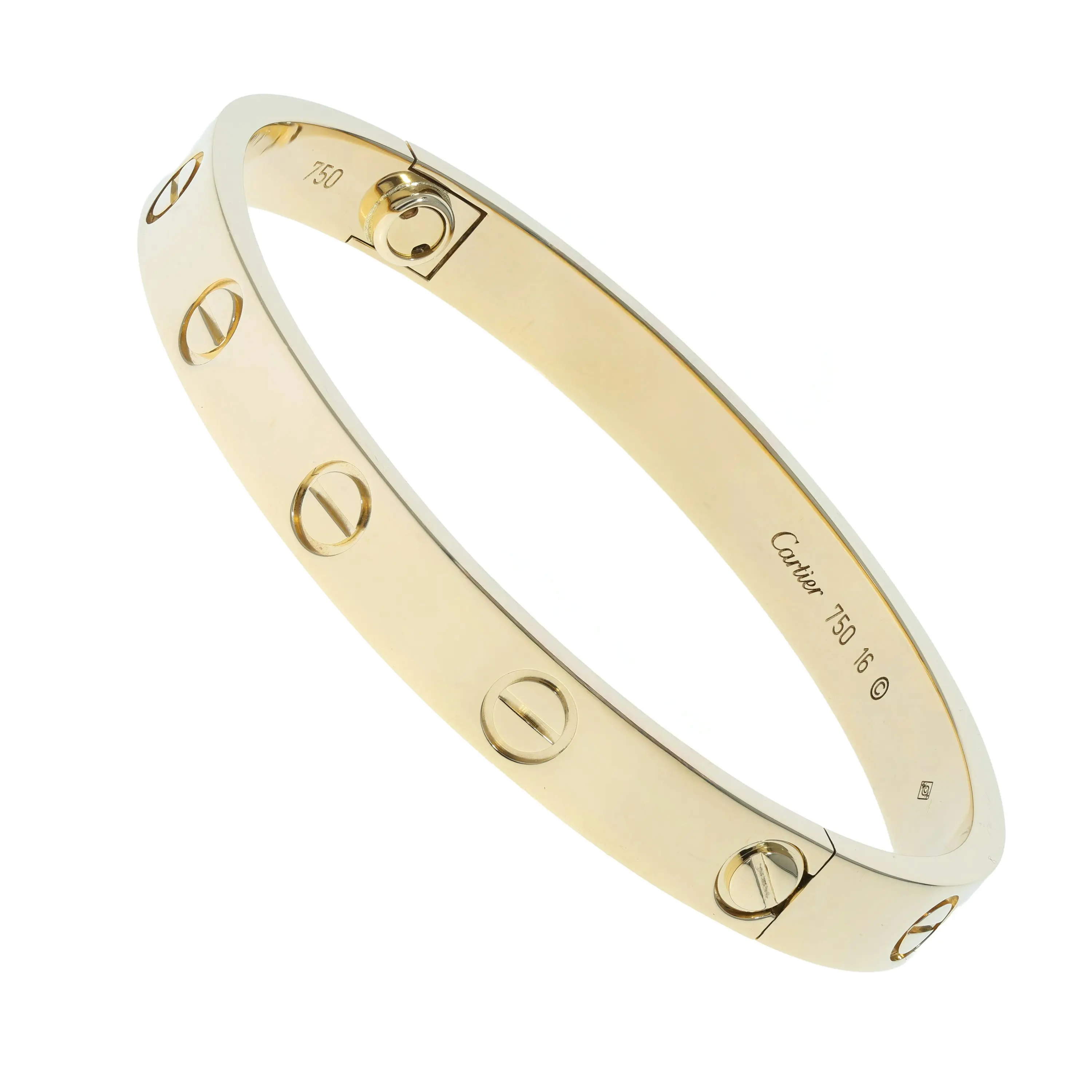 Pre-owned Cartier 18k yellow gold bangle bracelet from the Love collection. The bracelet features the signature screw design evenly spaced around the bangle. This piece is a size 16.