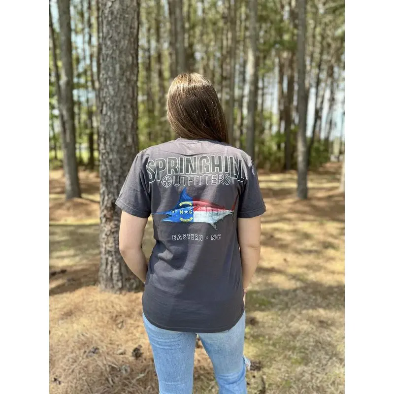 - Authentic Springhill Outfitters design featuring marlin and North Carolina flag elements