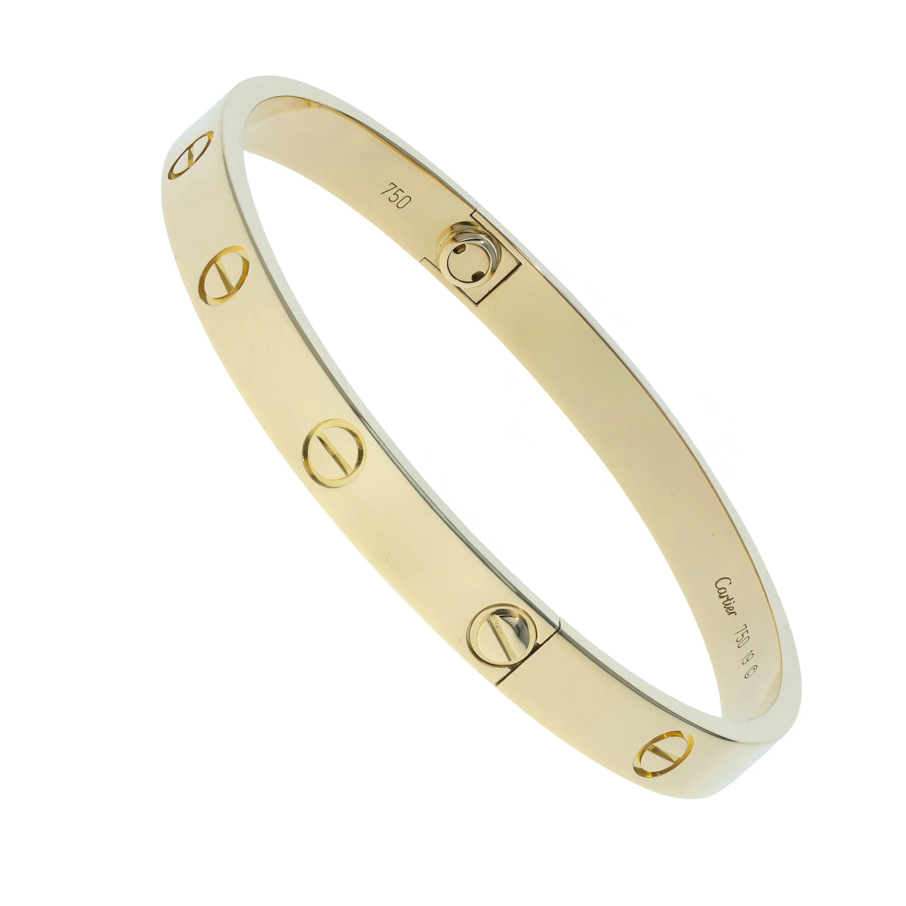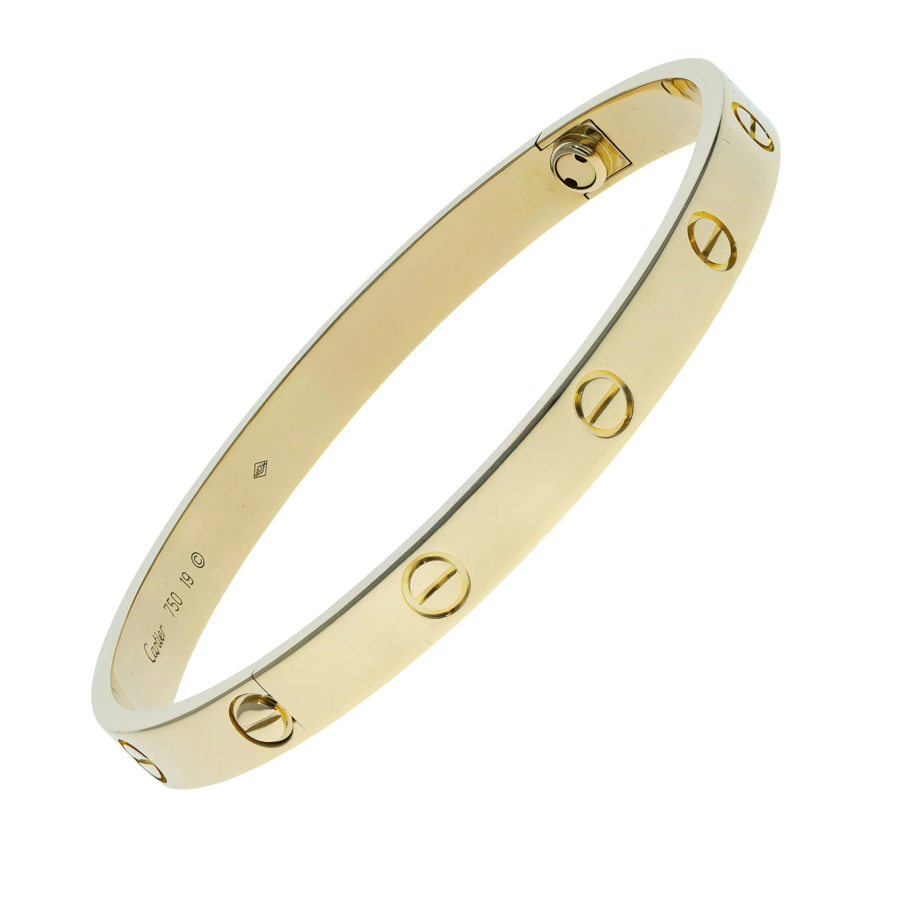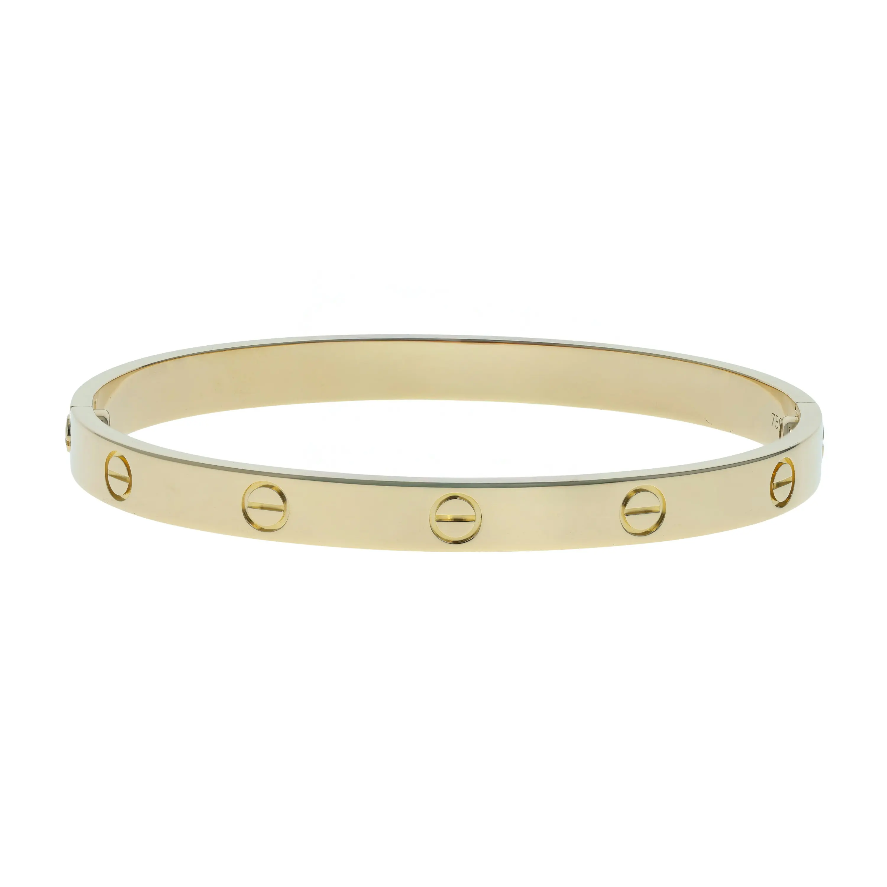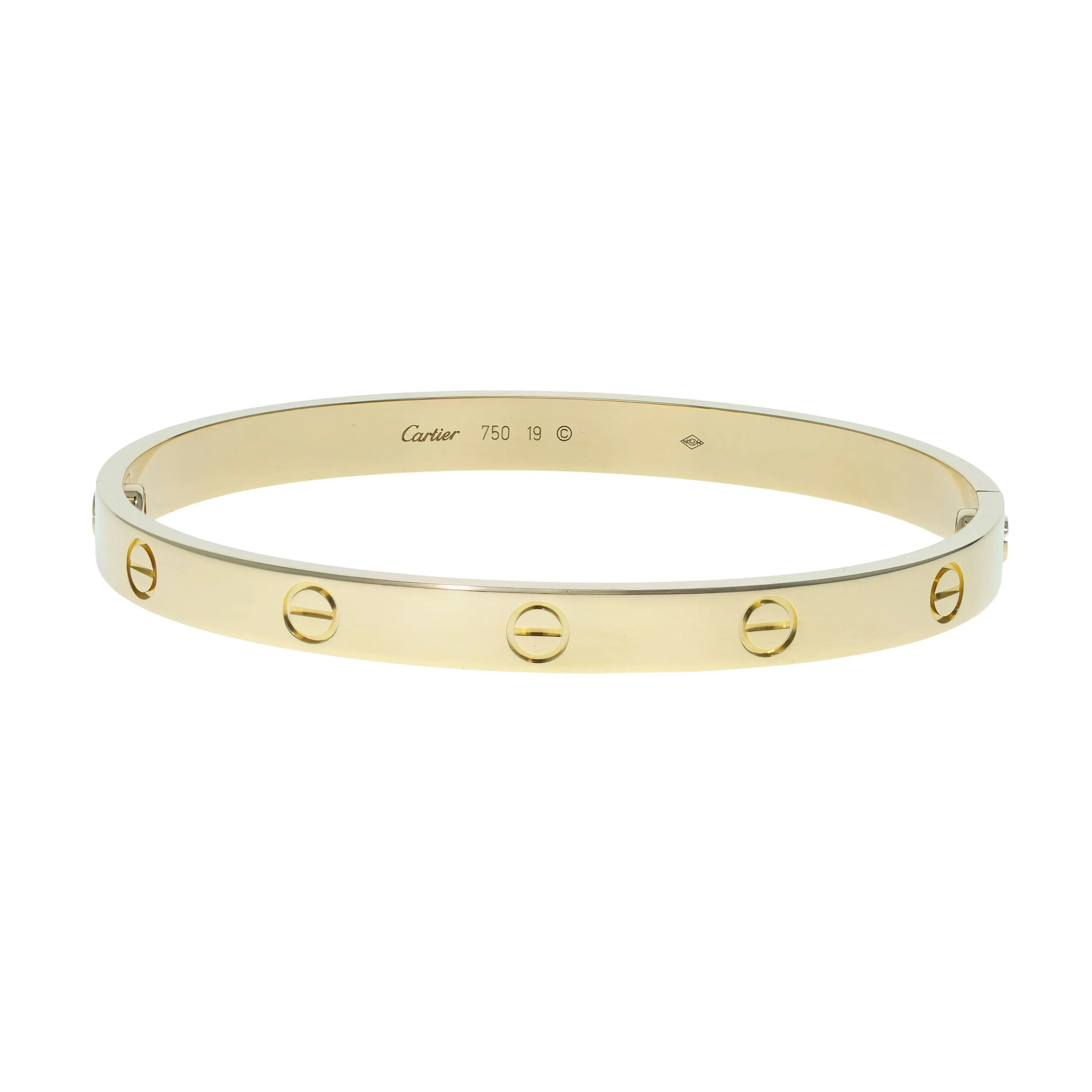 Pre-owned 18k yellow gold bangle bracelet from the Love collection. The bracelet features the signature screw design evenly spaced throughout the bangle. This piece is in a size 19.