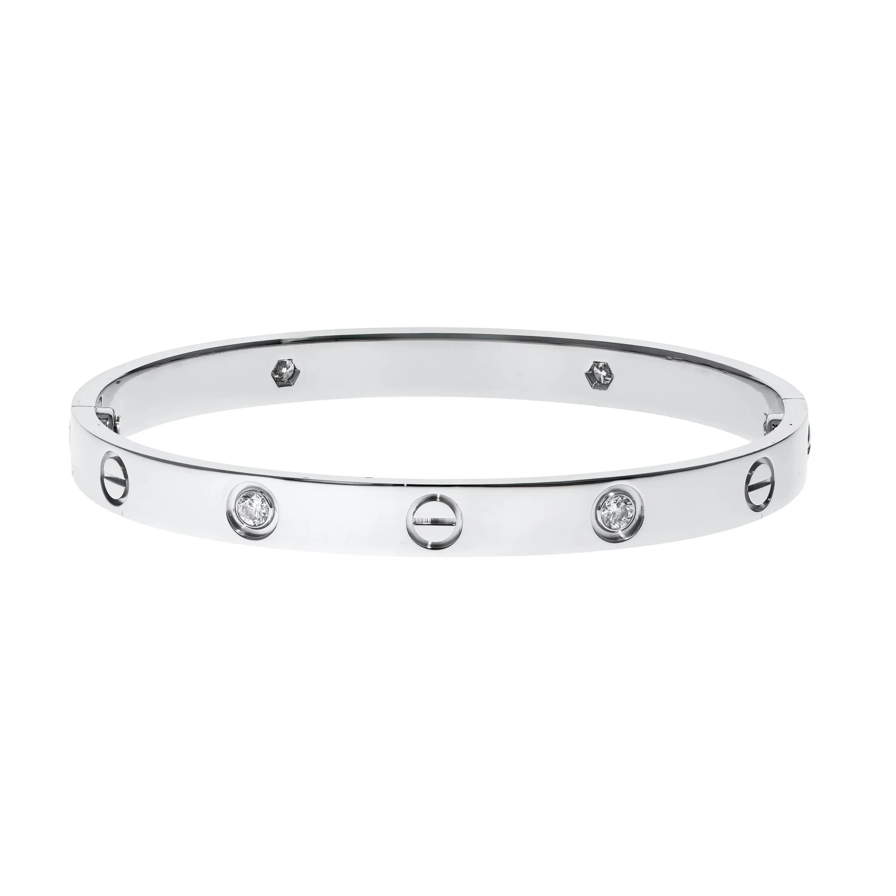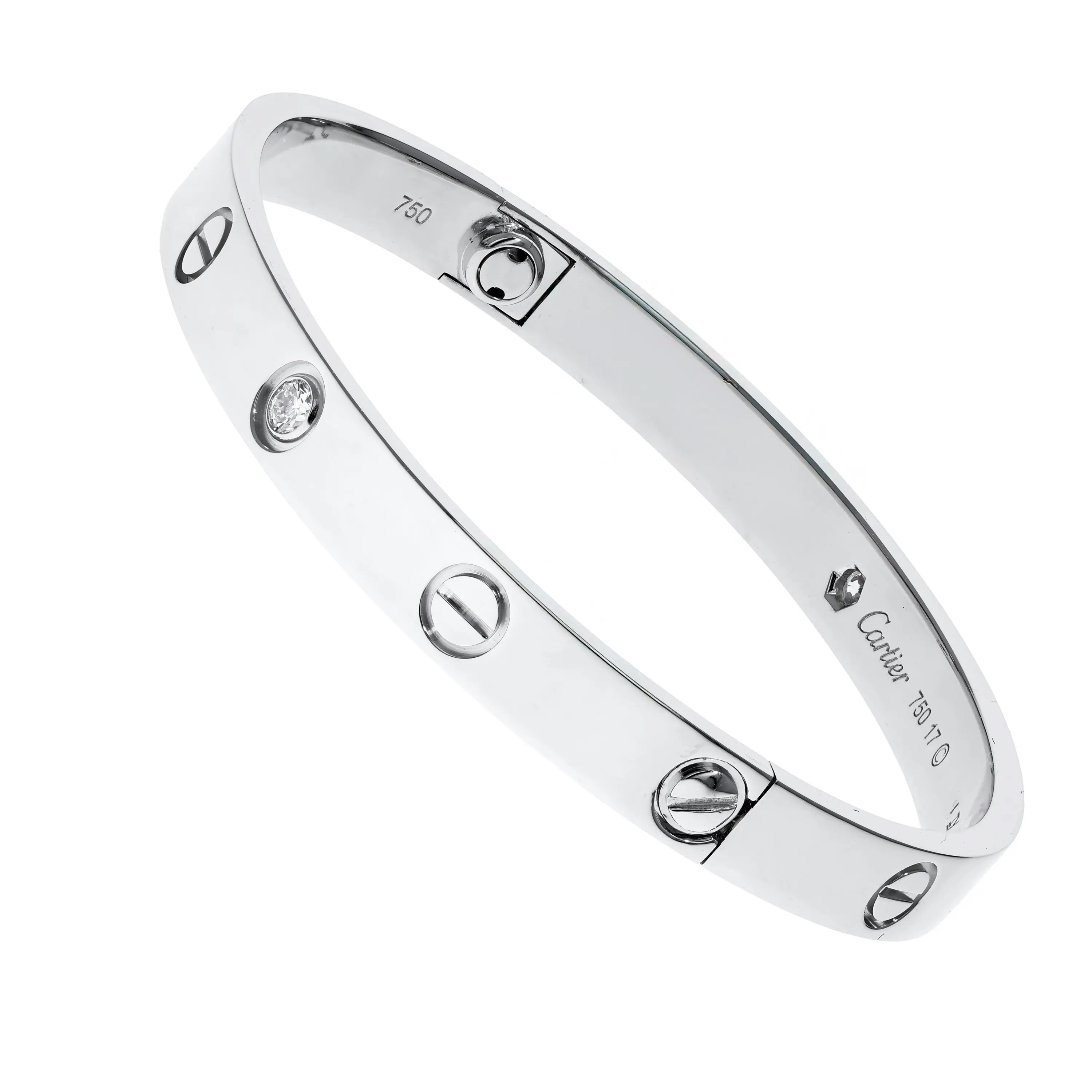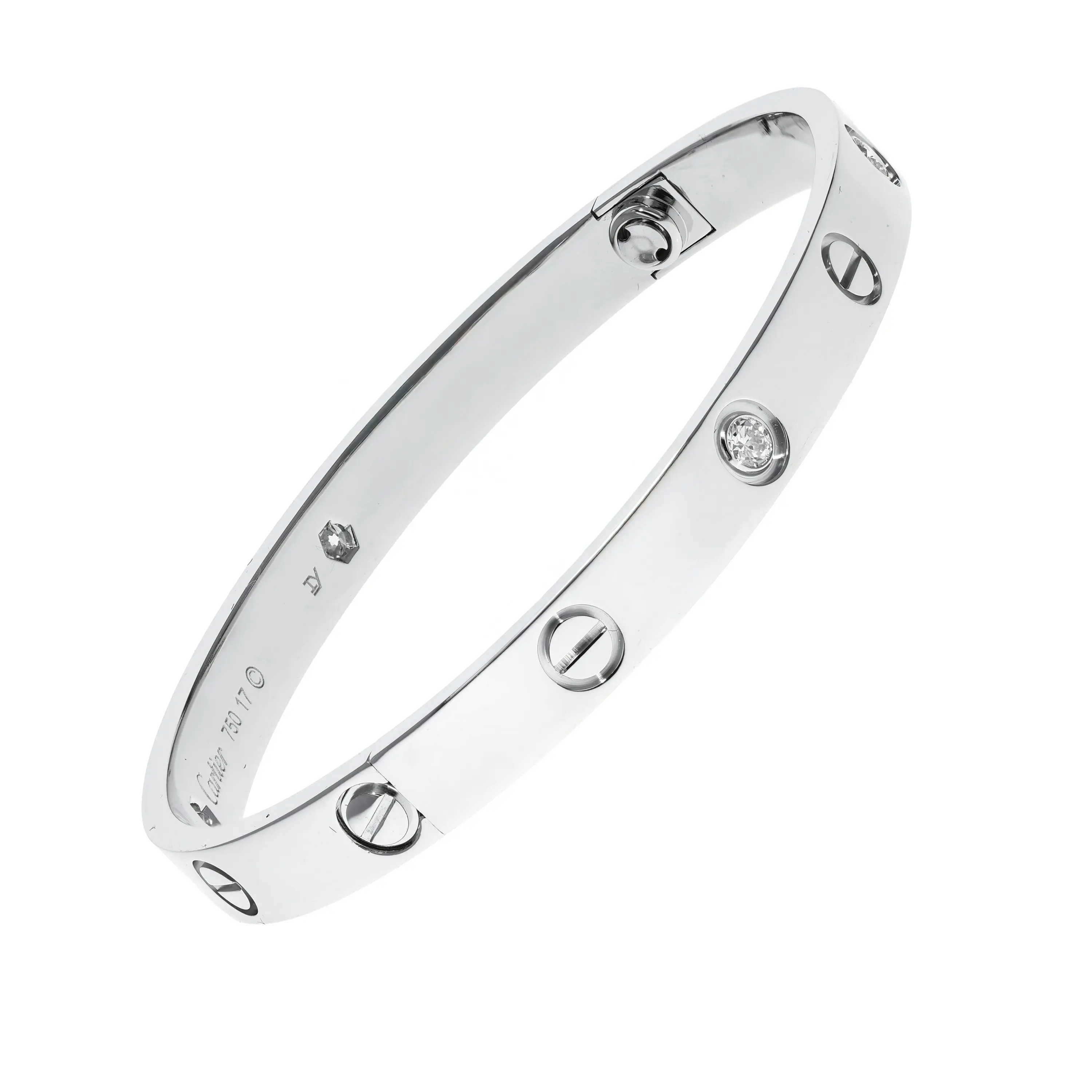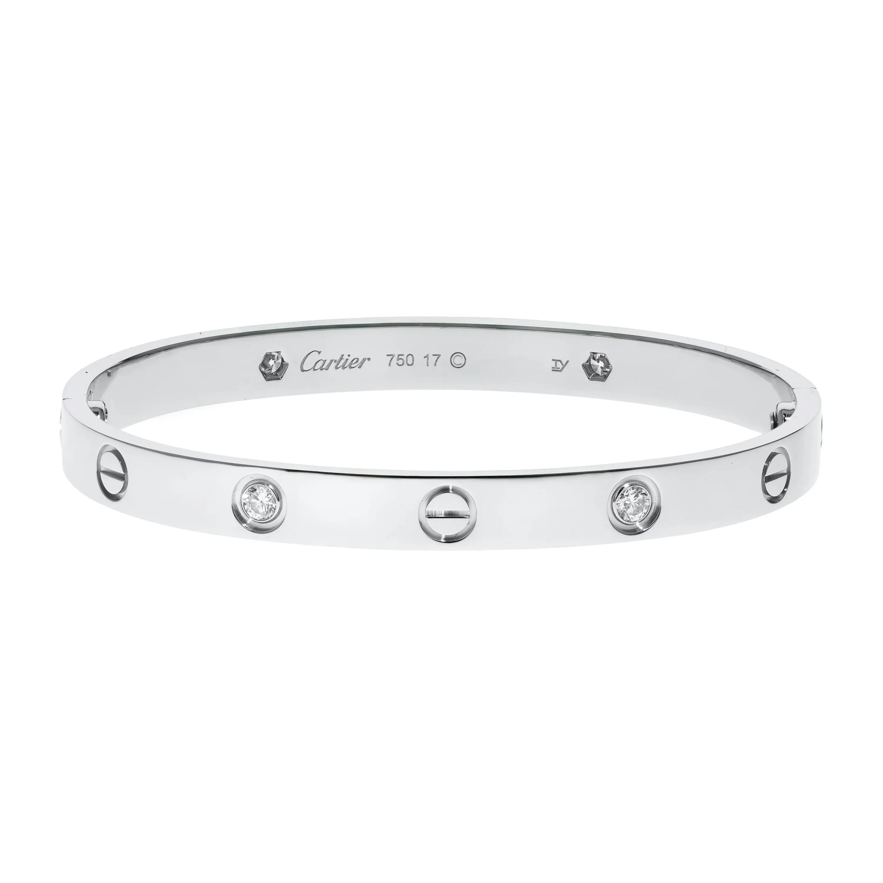 Pre-owned Cartier 18k white gold and diamond bangle bracelet from the Love collection. The bracelet features four bezel-set round brilliant diamonds that alternate between the signature screw design around the size 17 bangle. This piece comes with the original papers.