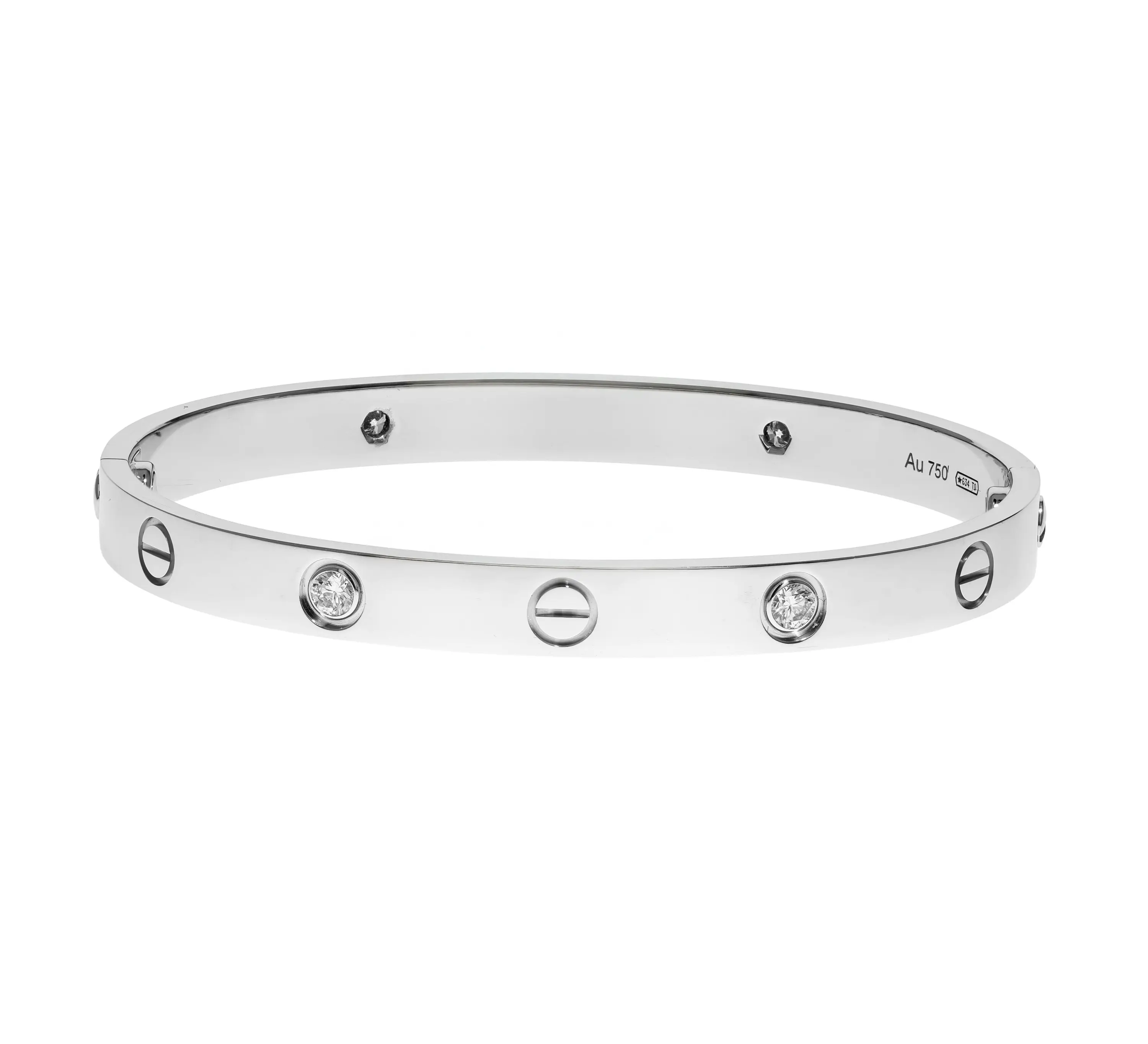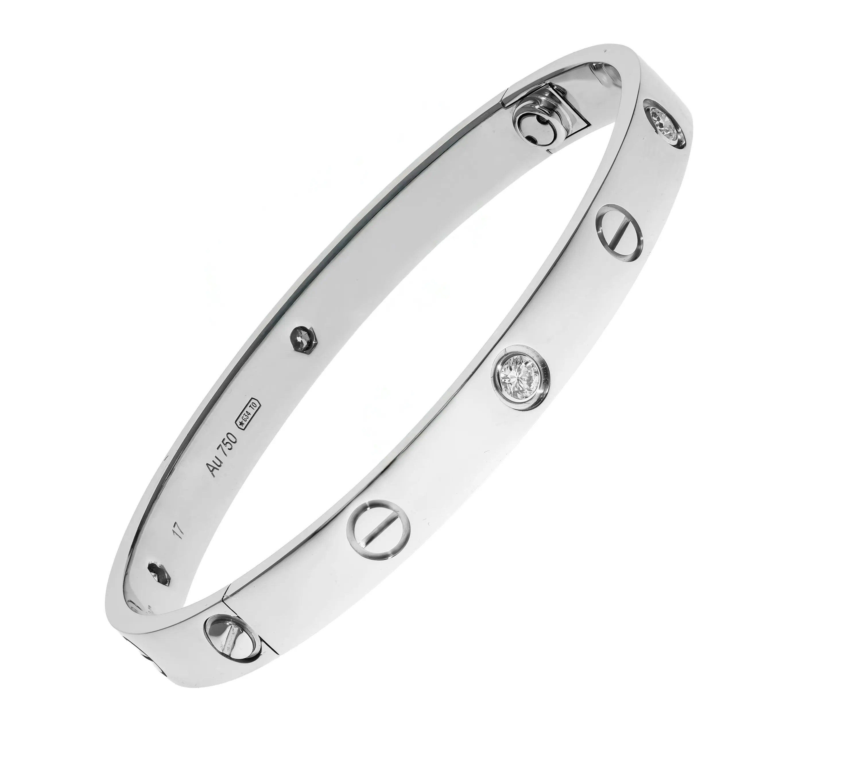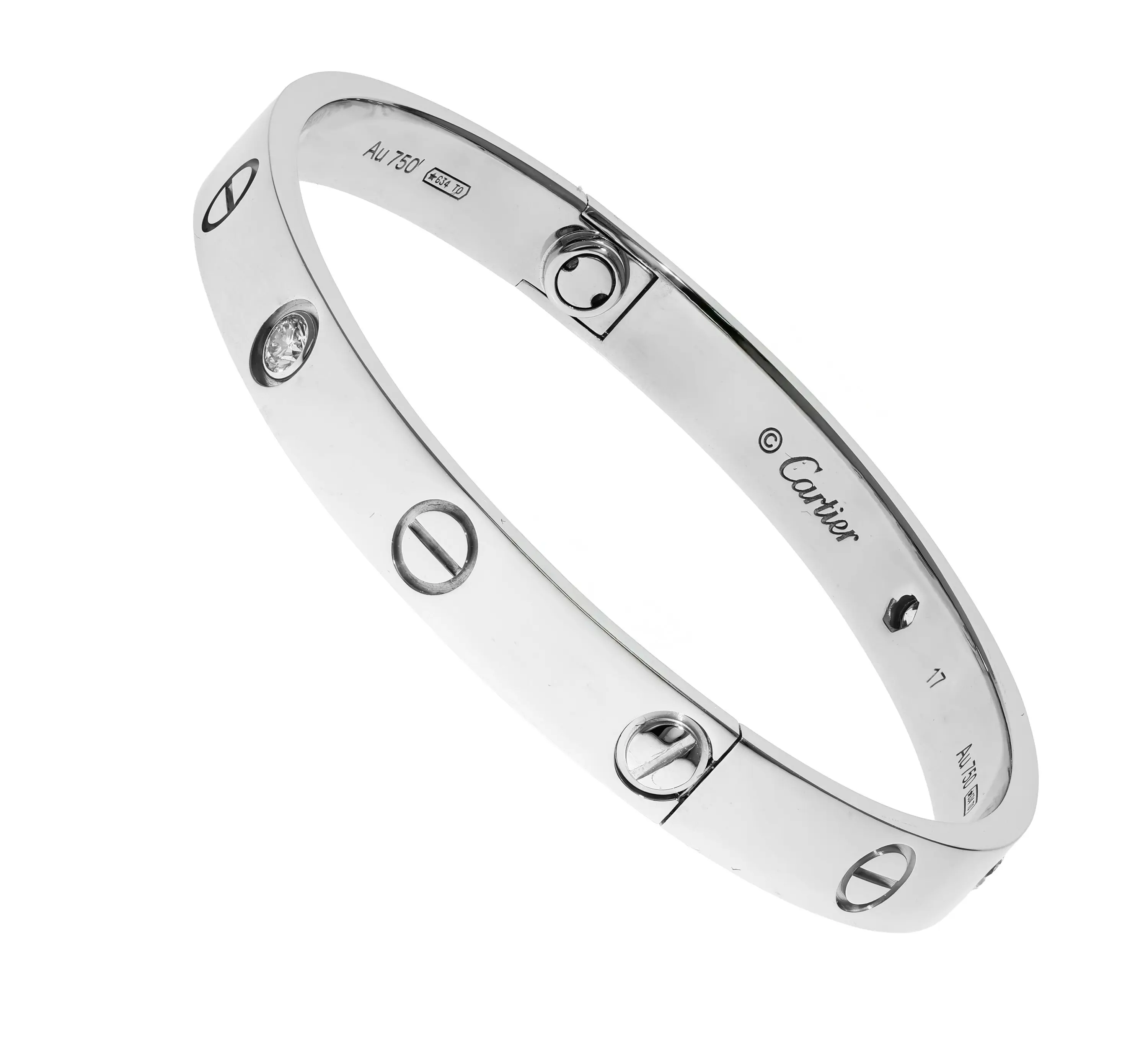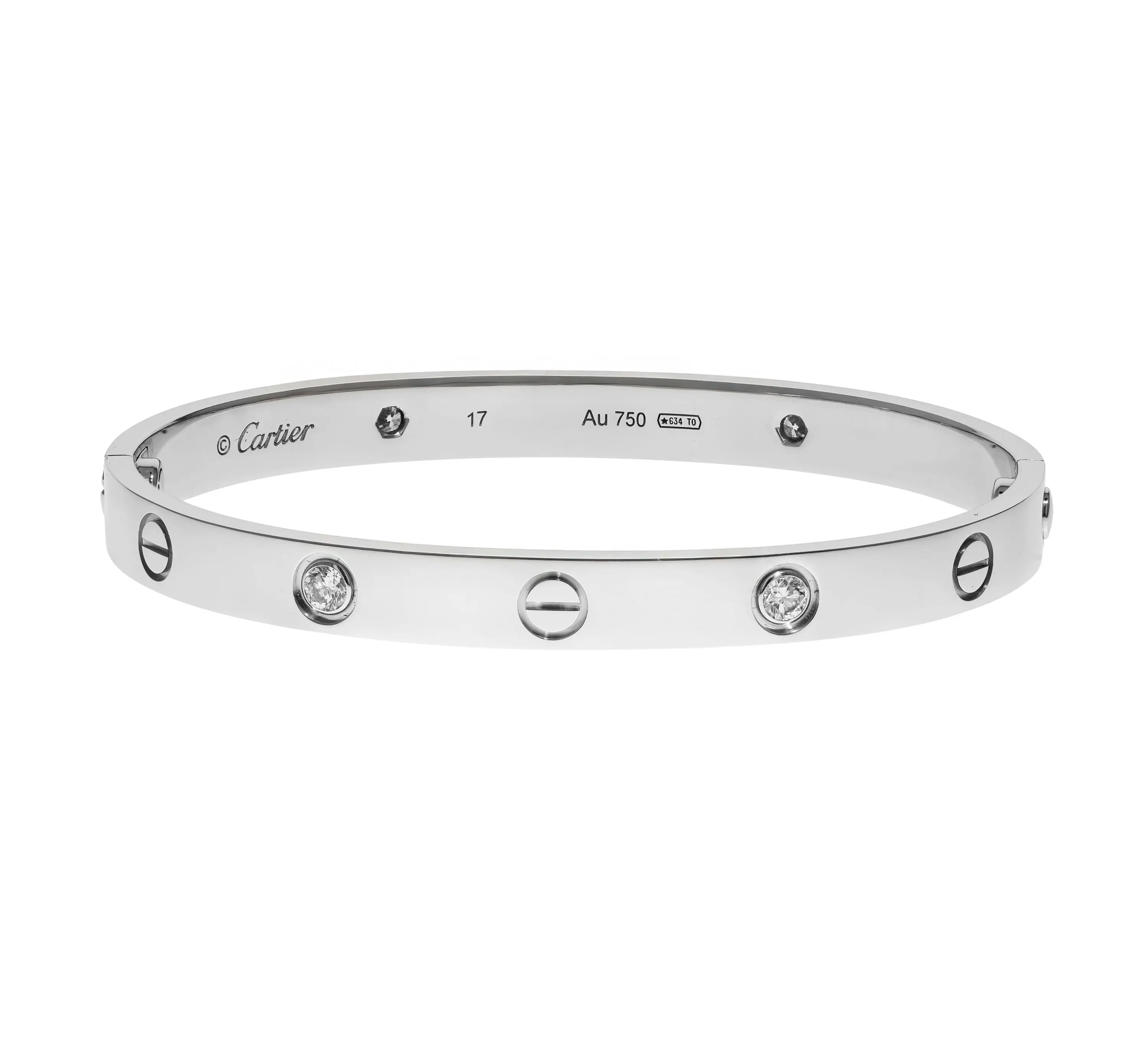 Pre-owned Cartier 18k white gold and diamond bangle bracelet from the Love collection. The bracelet features four bezel-set round brilliant diamonds that alternate between the signature screw design evenly spaced around the outside of the bangle. This piece is in a size 17 and comes with the original papers.