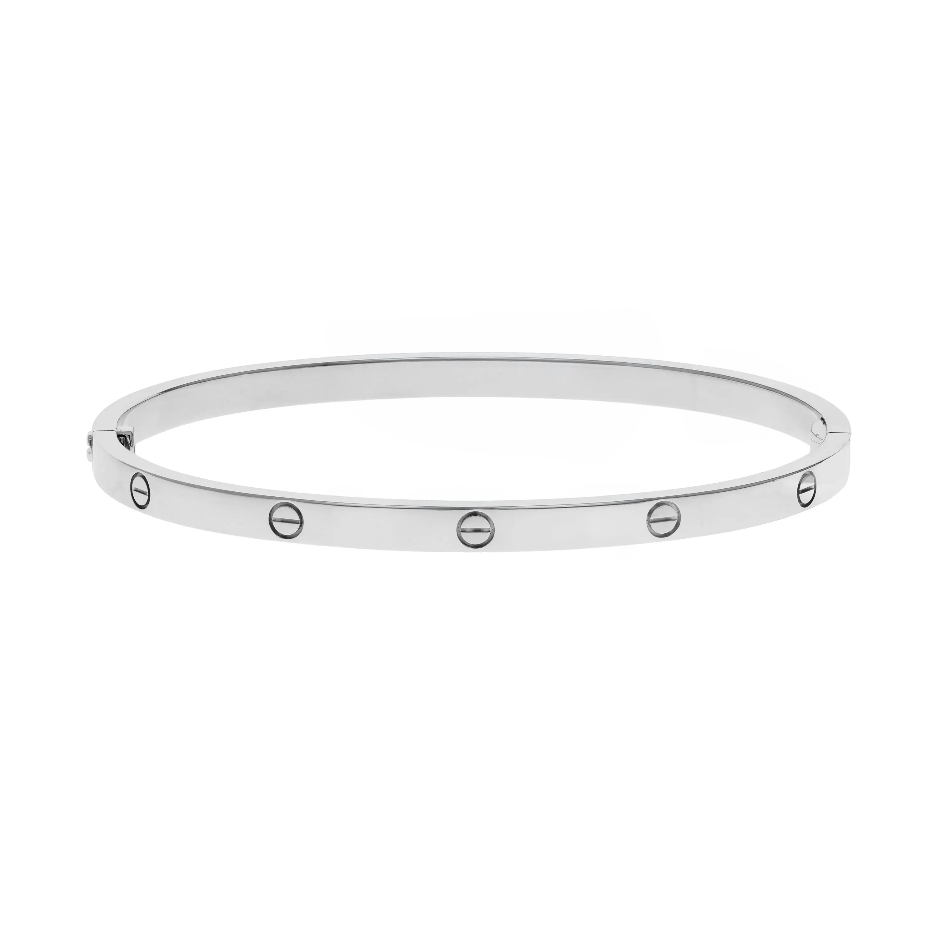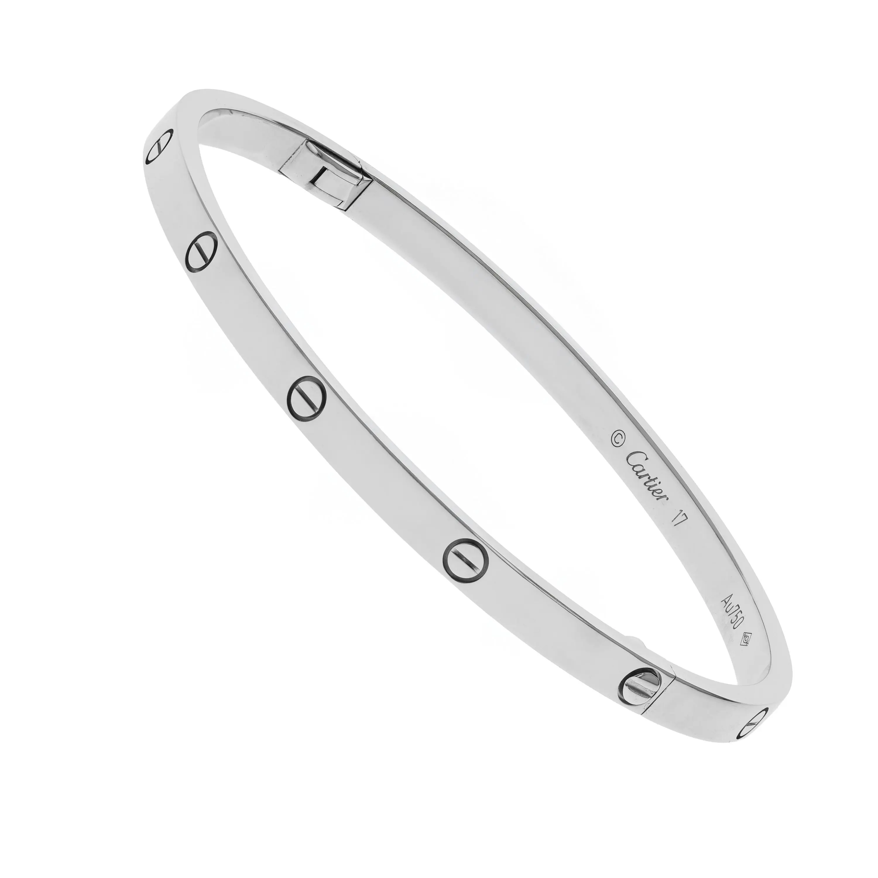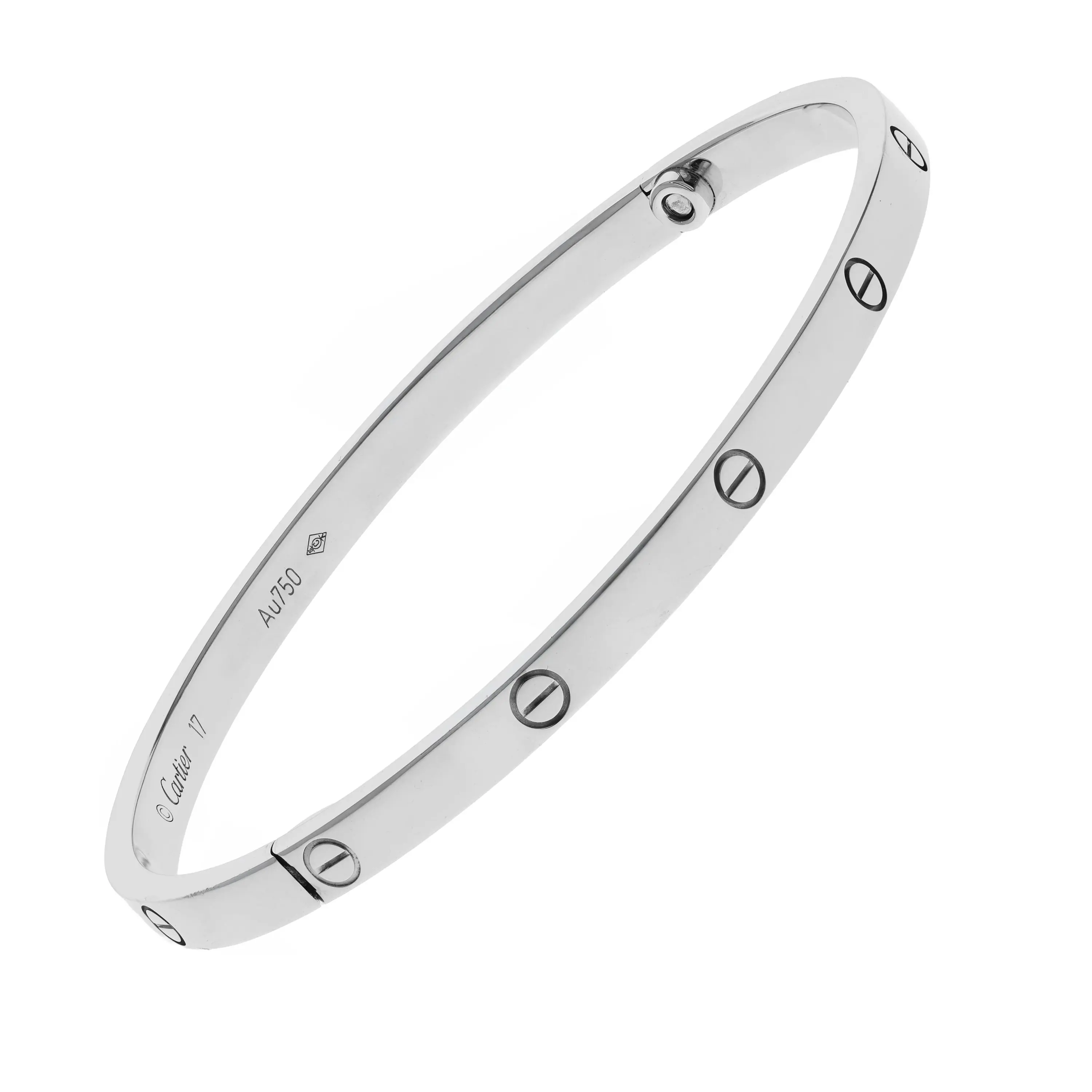 Pre-owned Cartier 18k white gold bangle bracelet from the Love collection. The small model bracelet features the signature screw design evenly spaced around the outside of the bangle. This piece is in a size 17 and comes with the original papers.