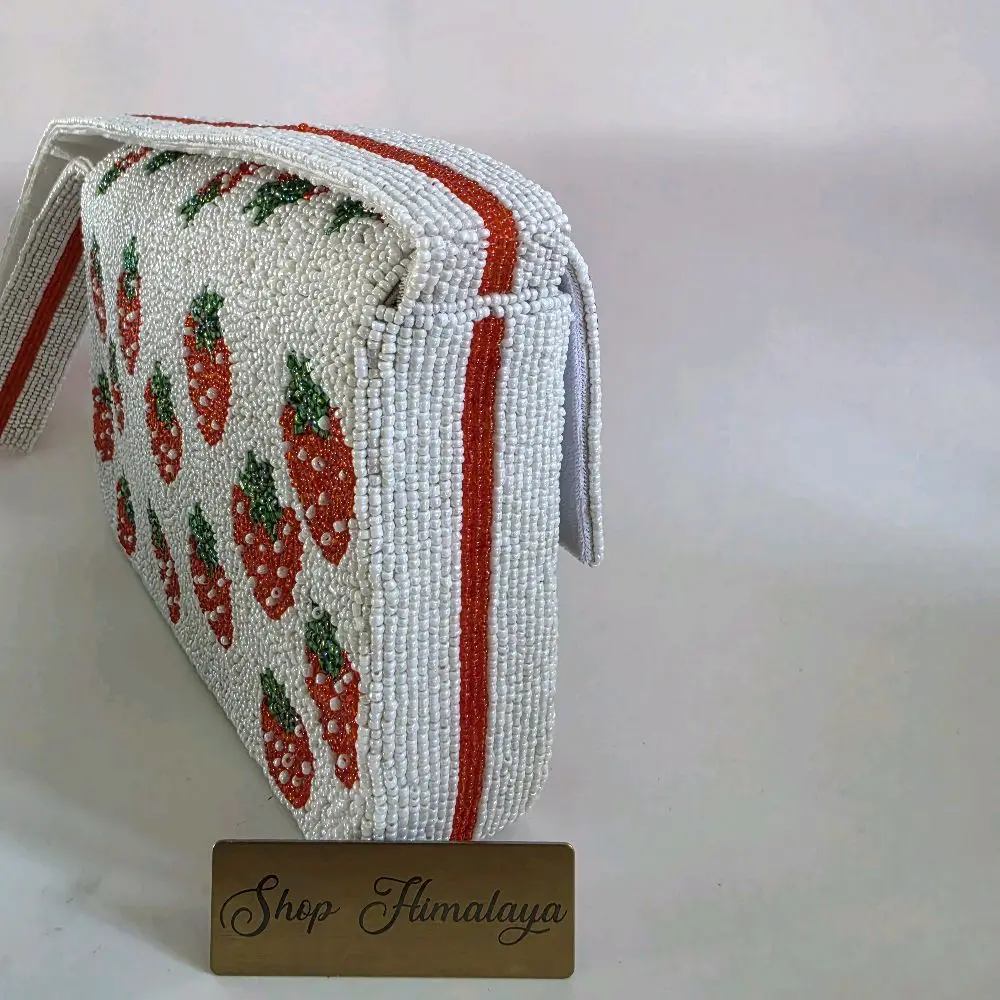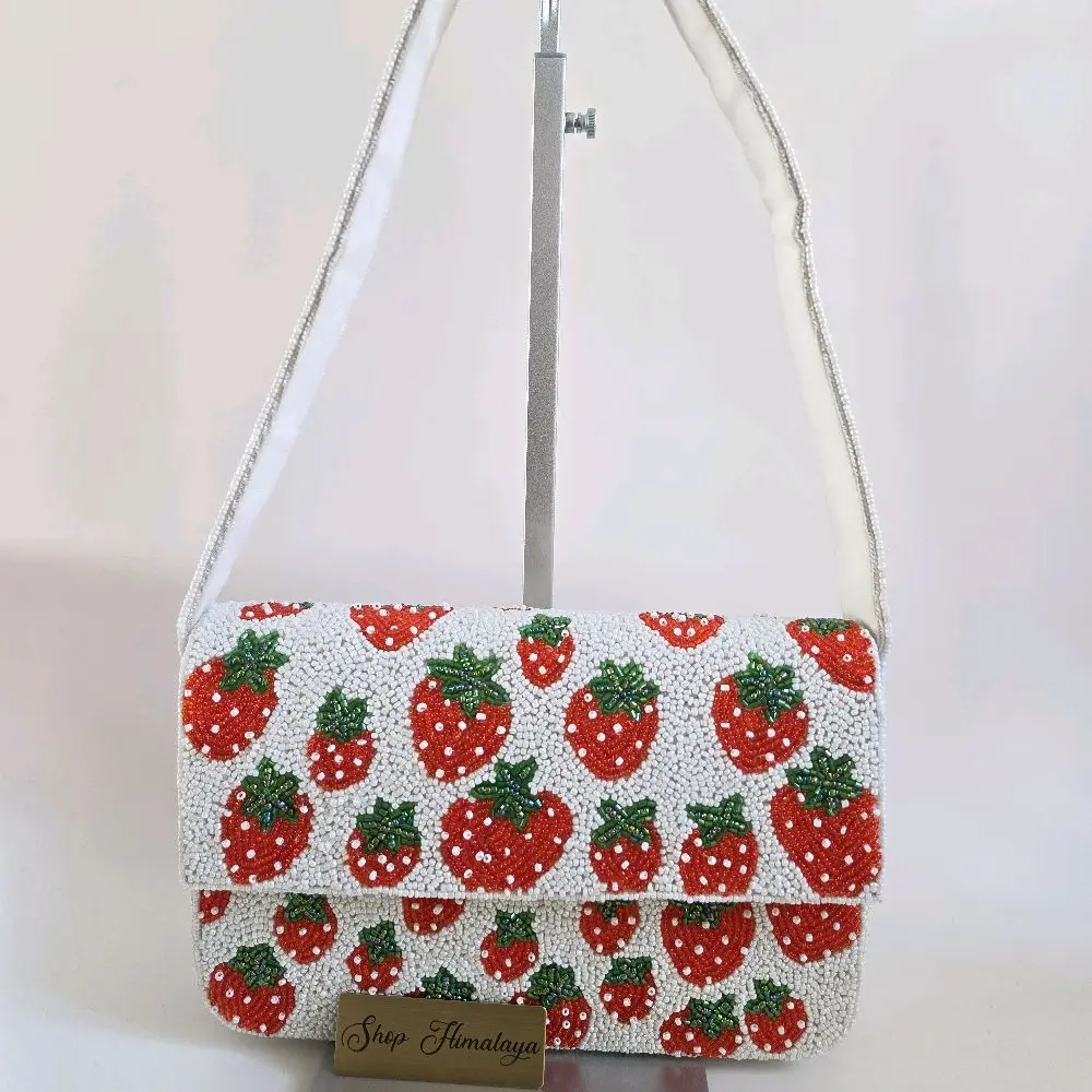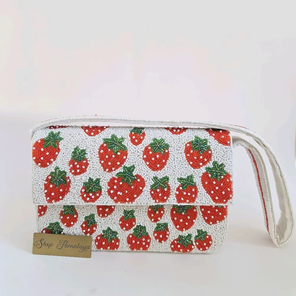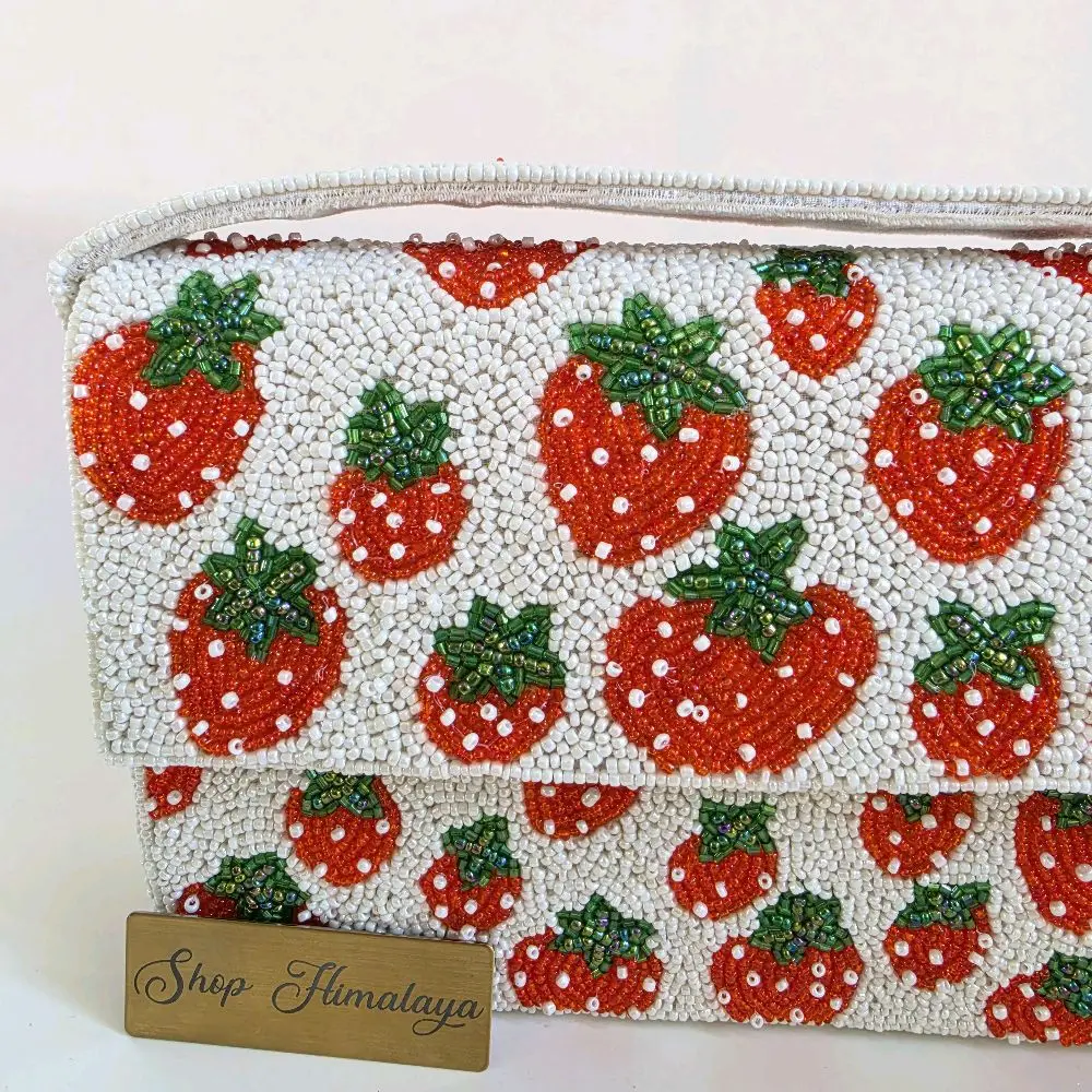 Intricate Artistry: Fully hand-beaded with a whimsical strawberry motif that pops against a crisp white background.