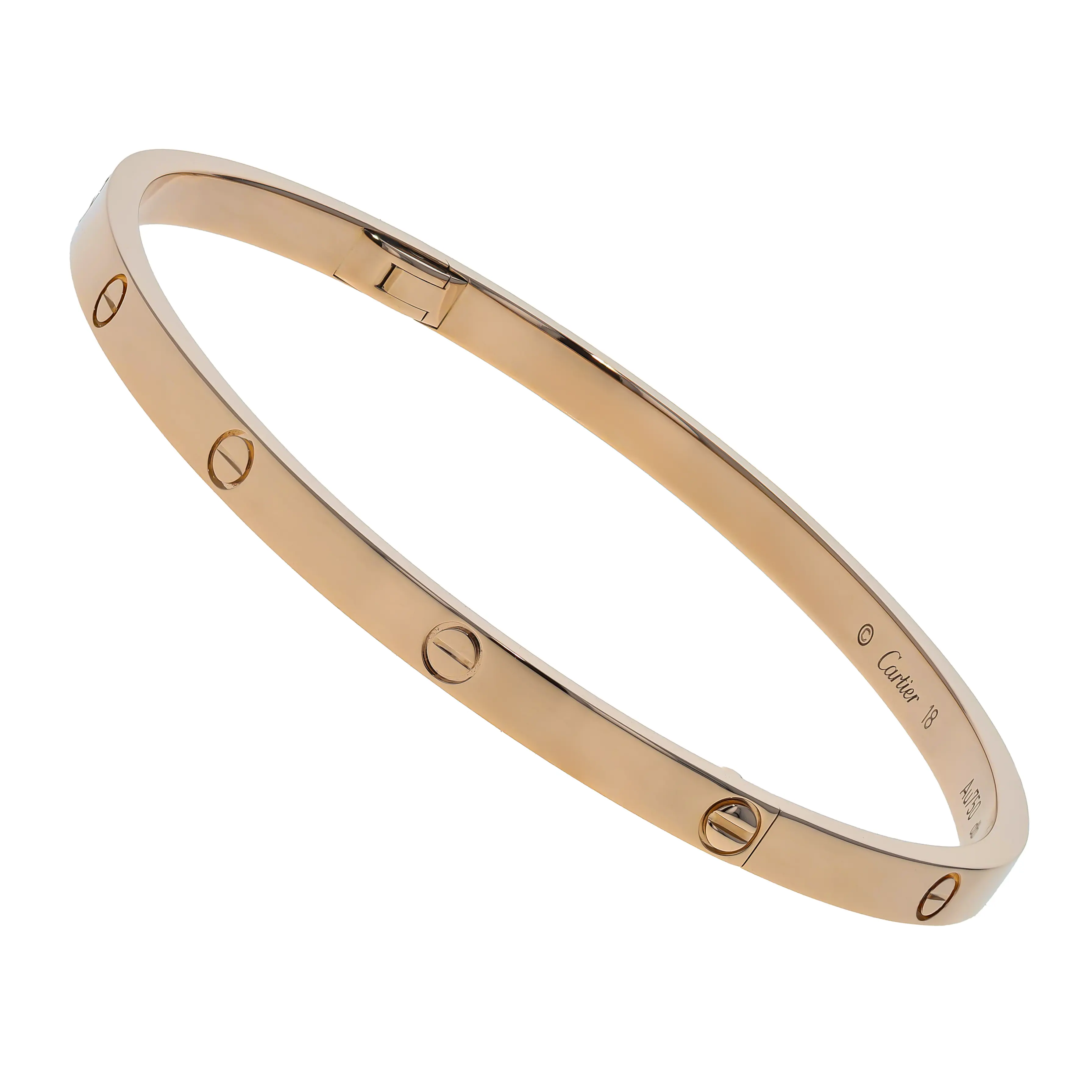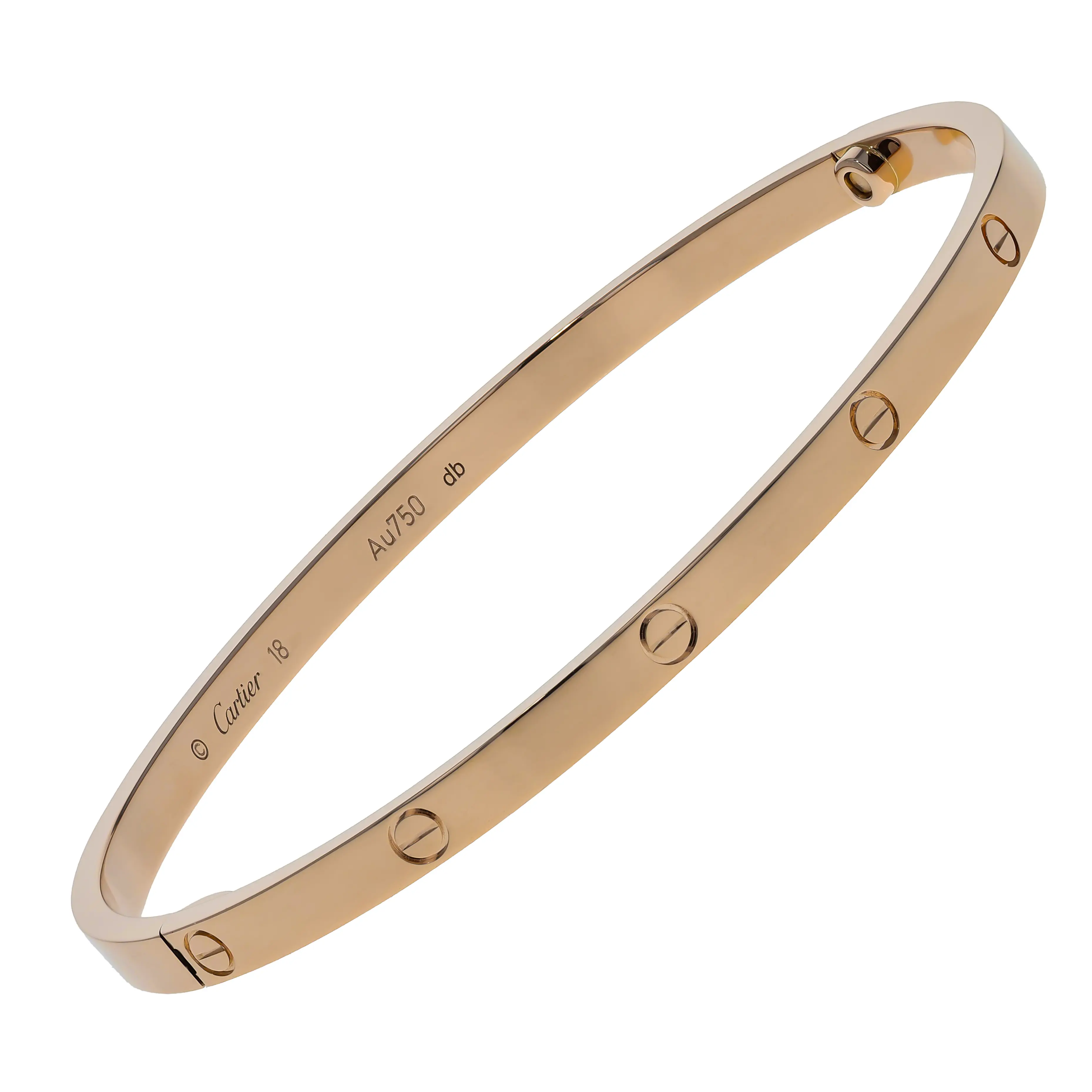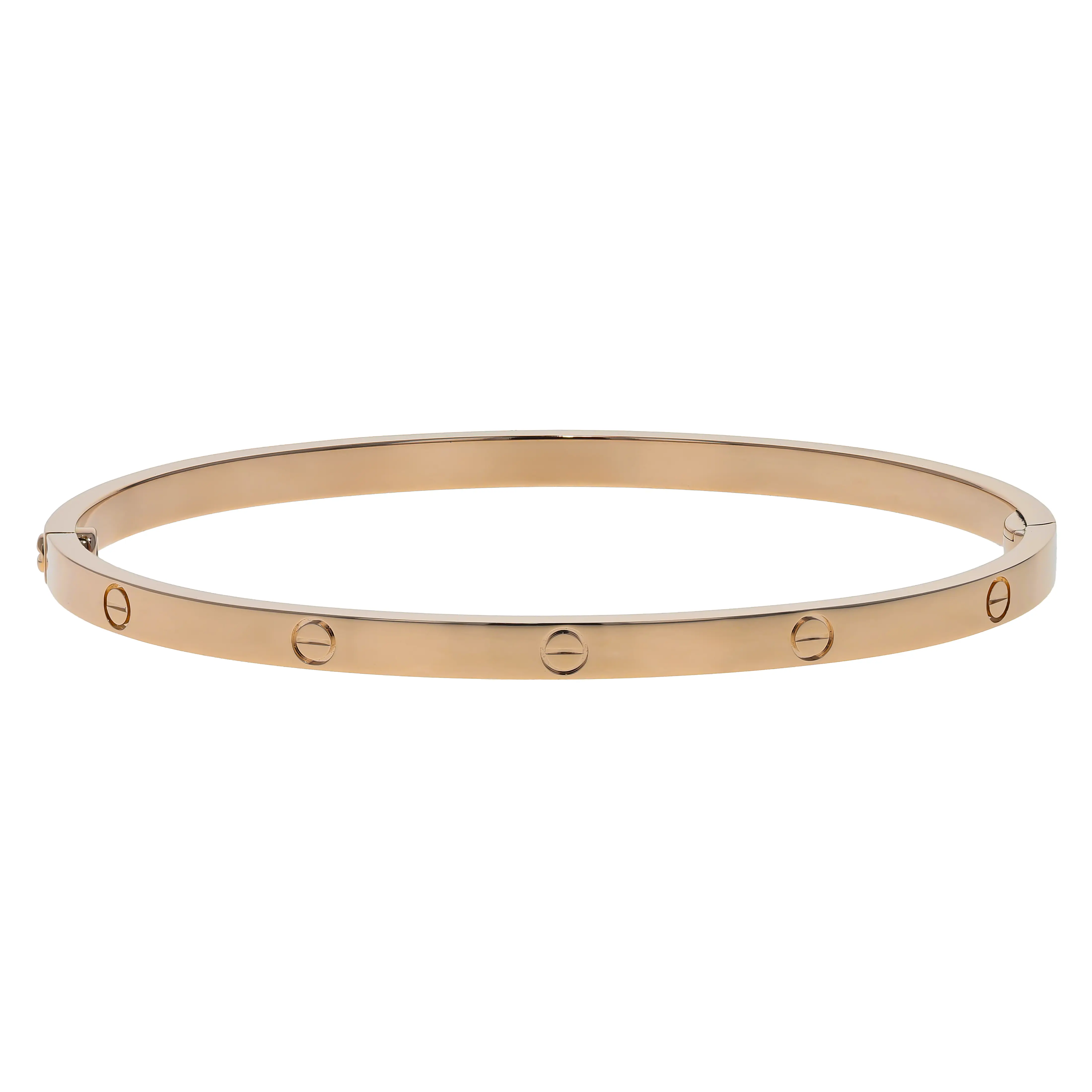 Pre-owned Cartier 18k rose gold bangle bracelet from the Love collection. The bracelet features the signature screw design evenly spaced around the outside of the bangle. This piece is the small model and is in a size 18.