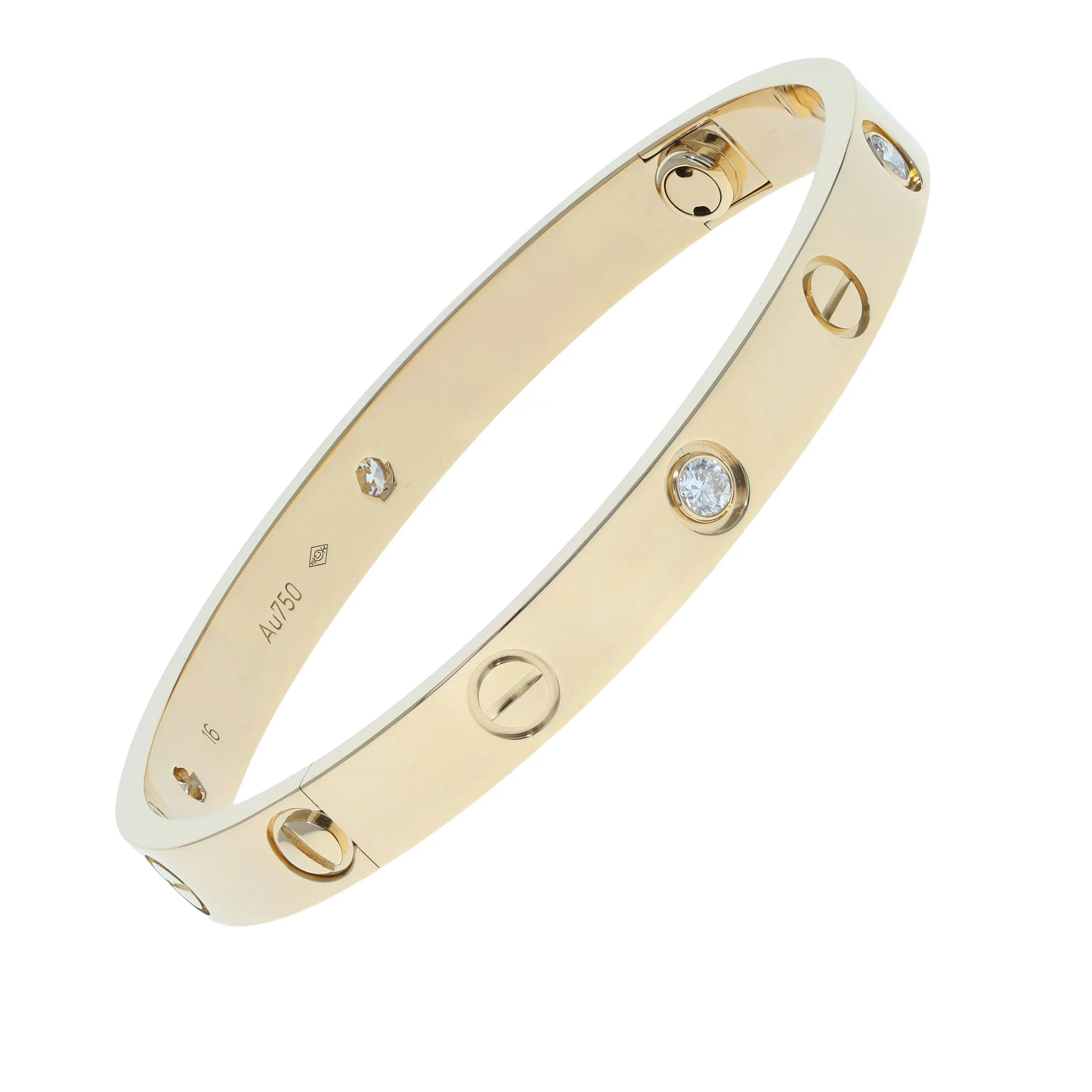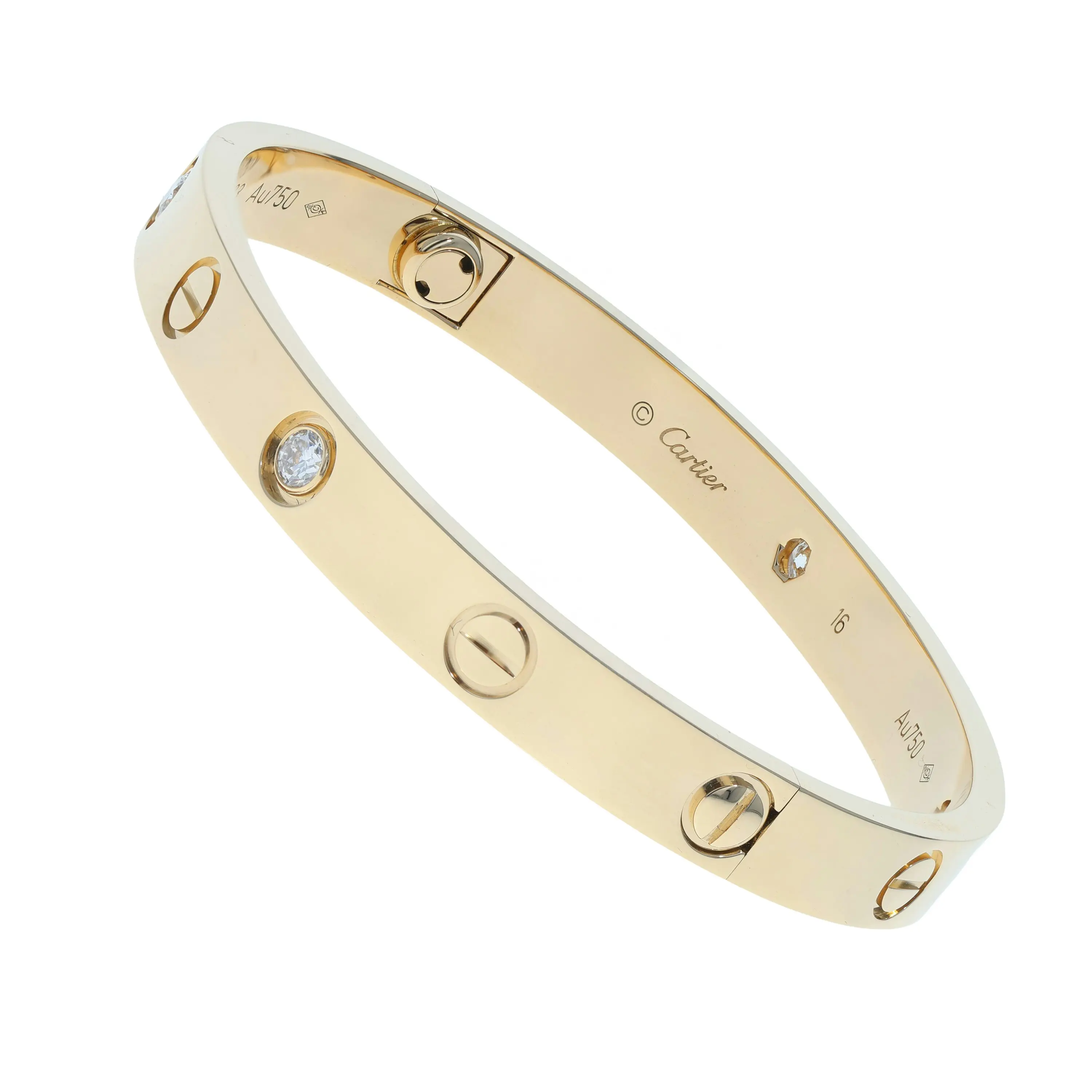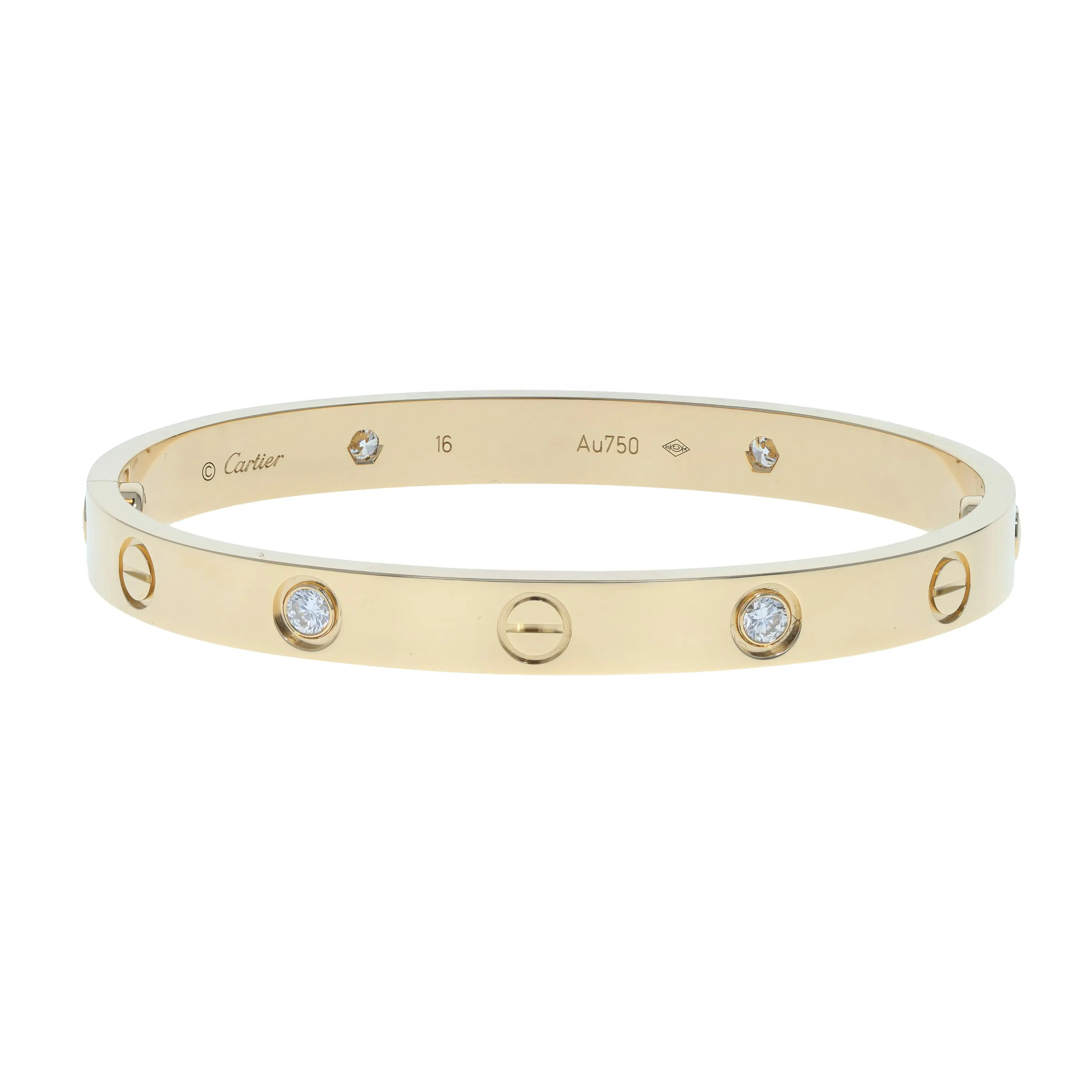 Pre-owned Cartier 18k yellow gold and diamond bangle bracelet from the Love collection. The bracelet features the signature screw design and four bezel-set round brilliant diamonds in an alternating pattern evenly spaced around the outside of the bangle. This piece is a size 16 and comes with the original papers.