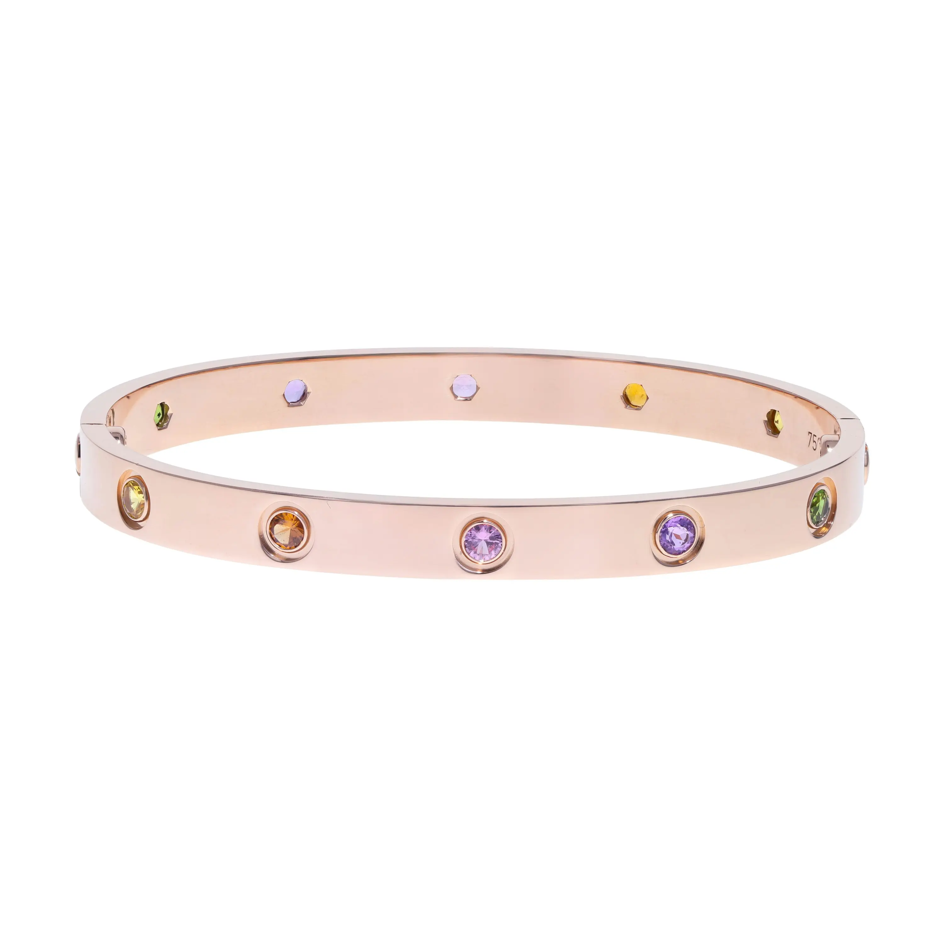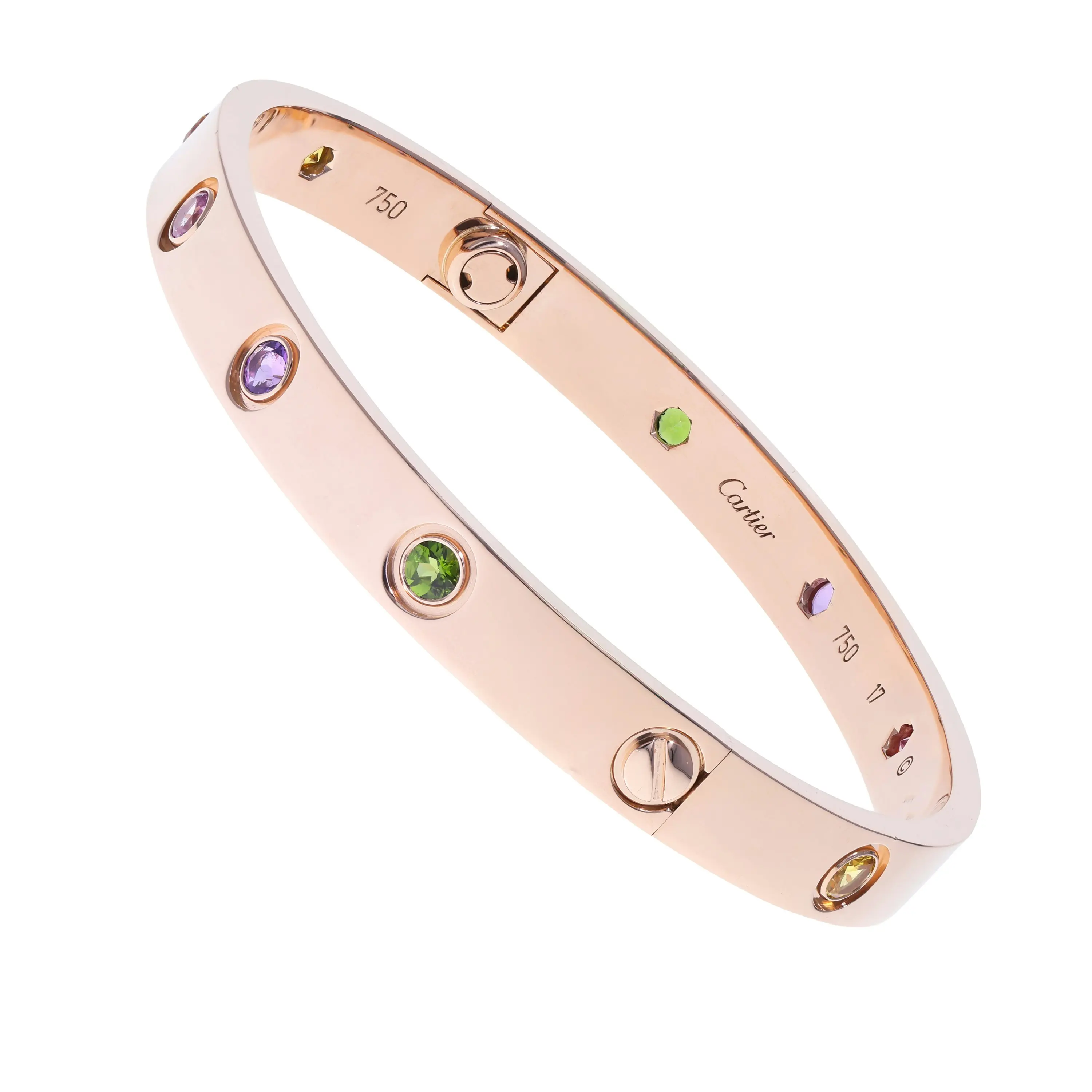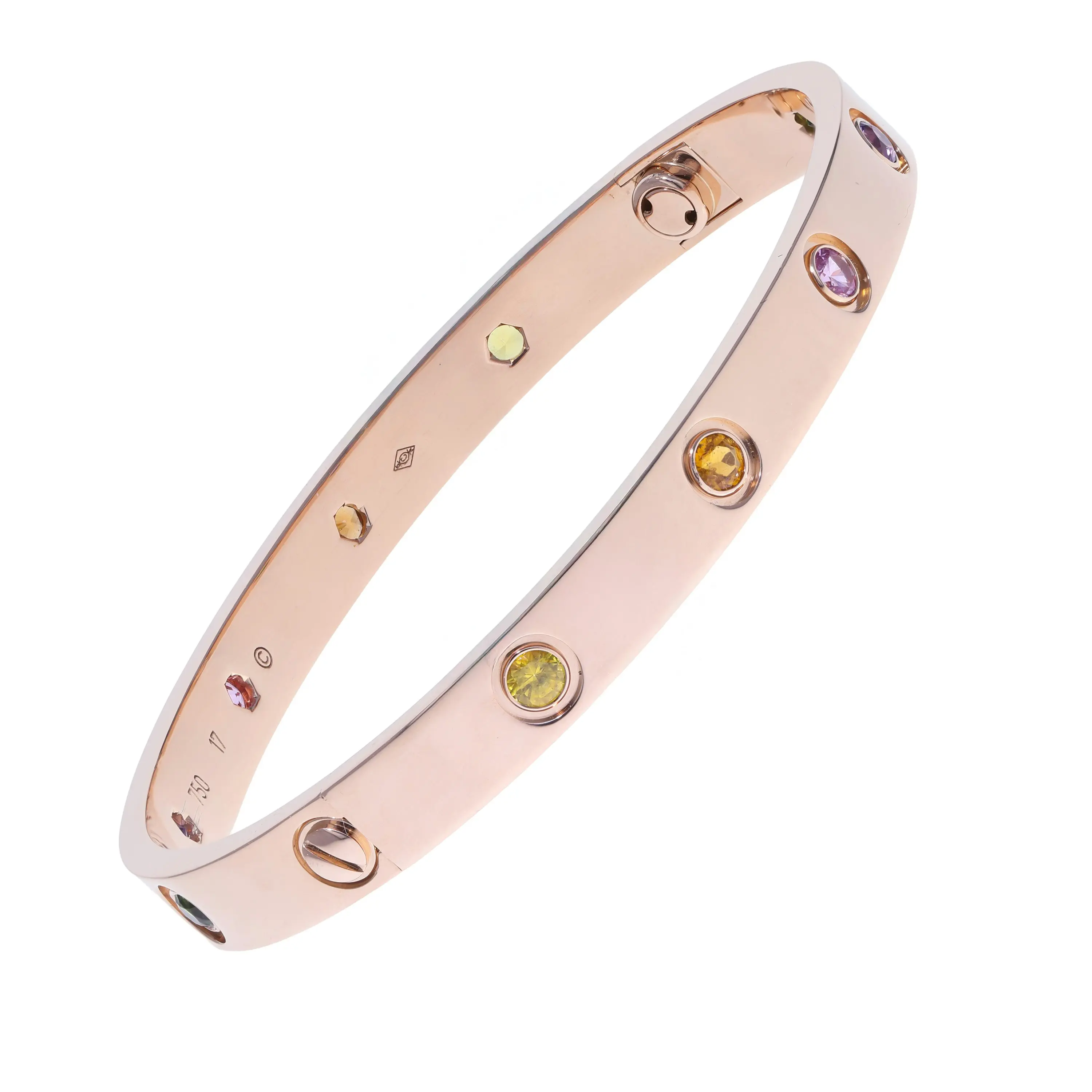 Pre-owned Cartier 18k rose gold and gemstone bangle bracelet from the Love collection. The bracelet features 10 bezel-set round multi-colored gemstones evenly spaced around the outside of the bangle. This piece is in a size 17.
