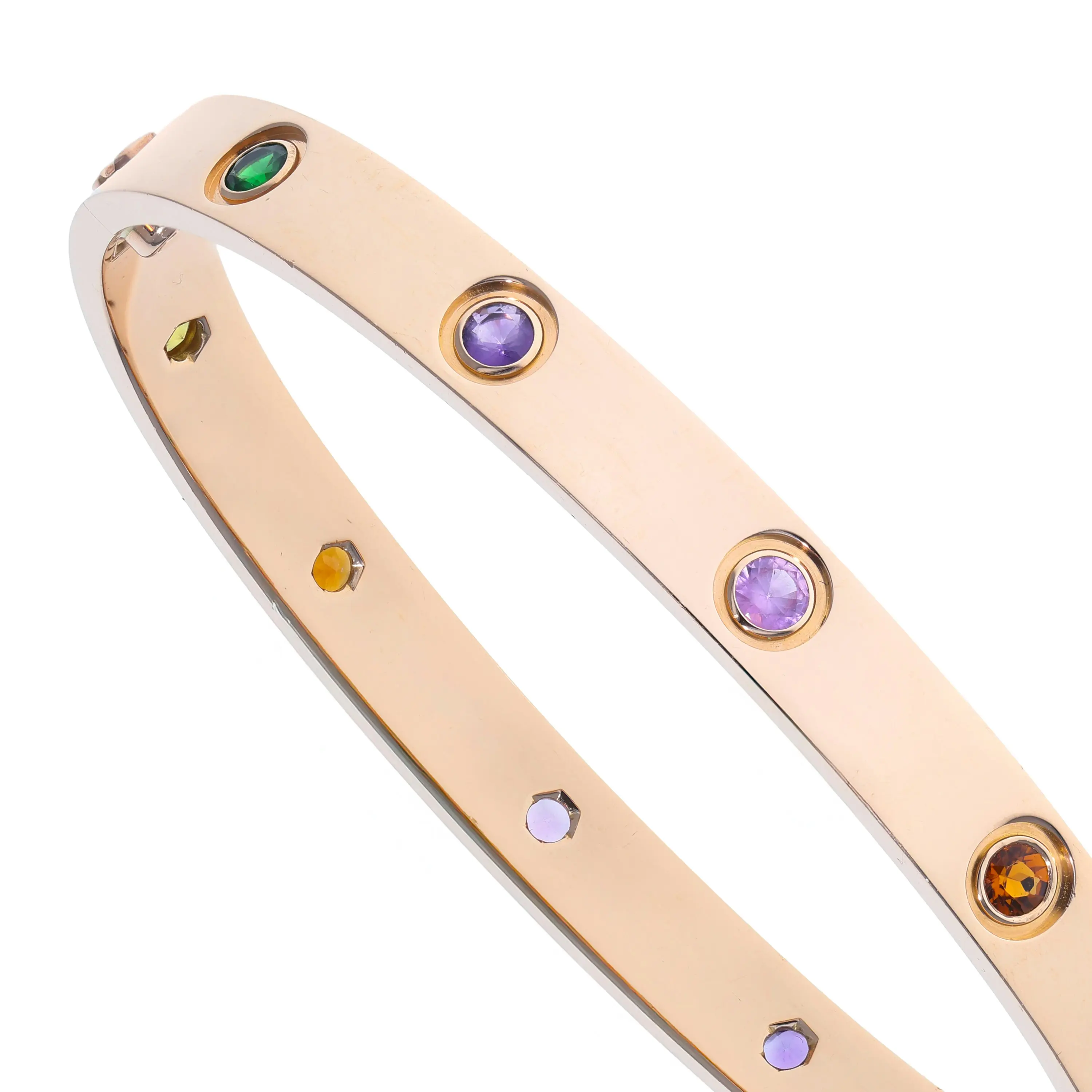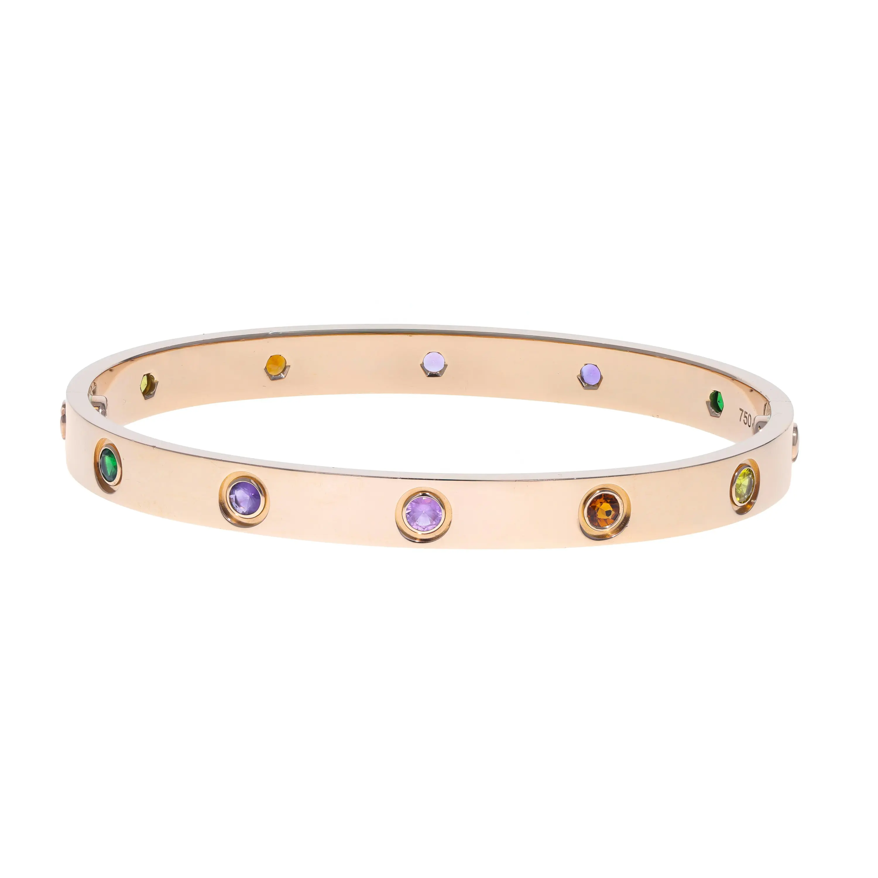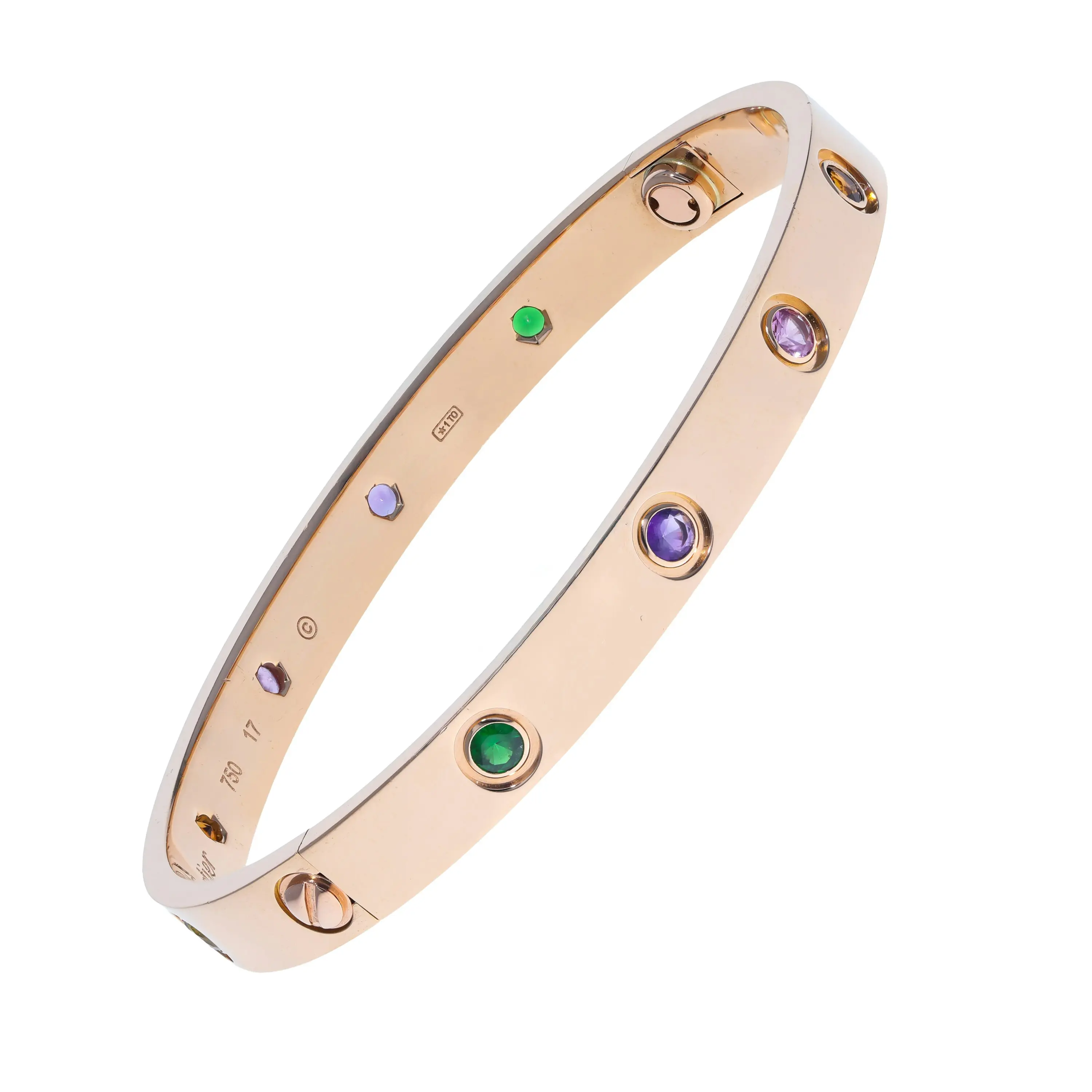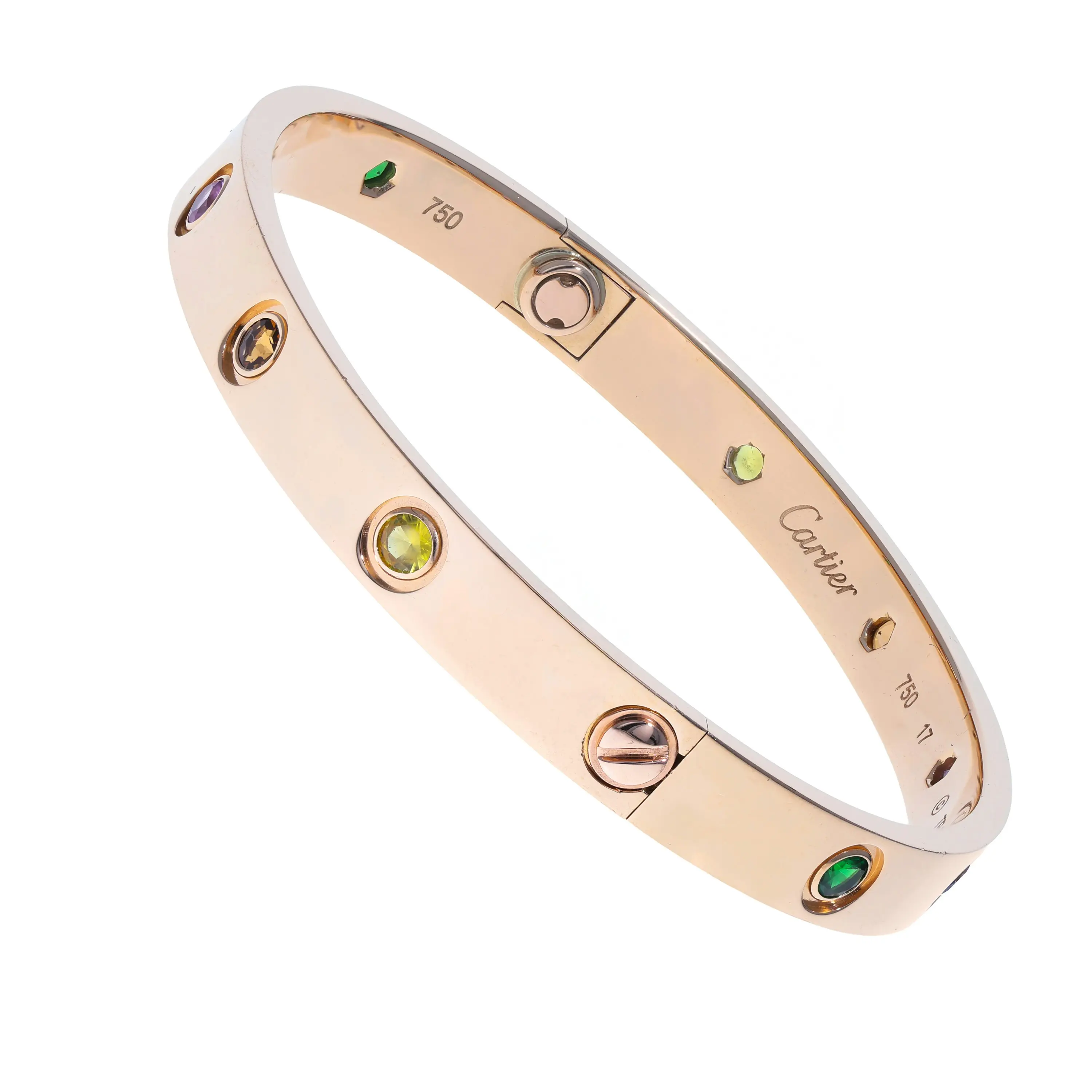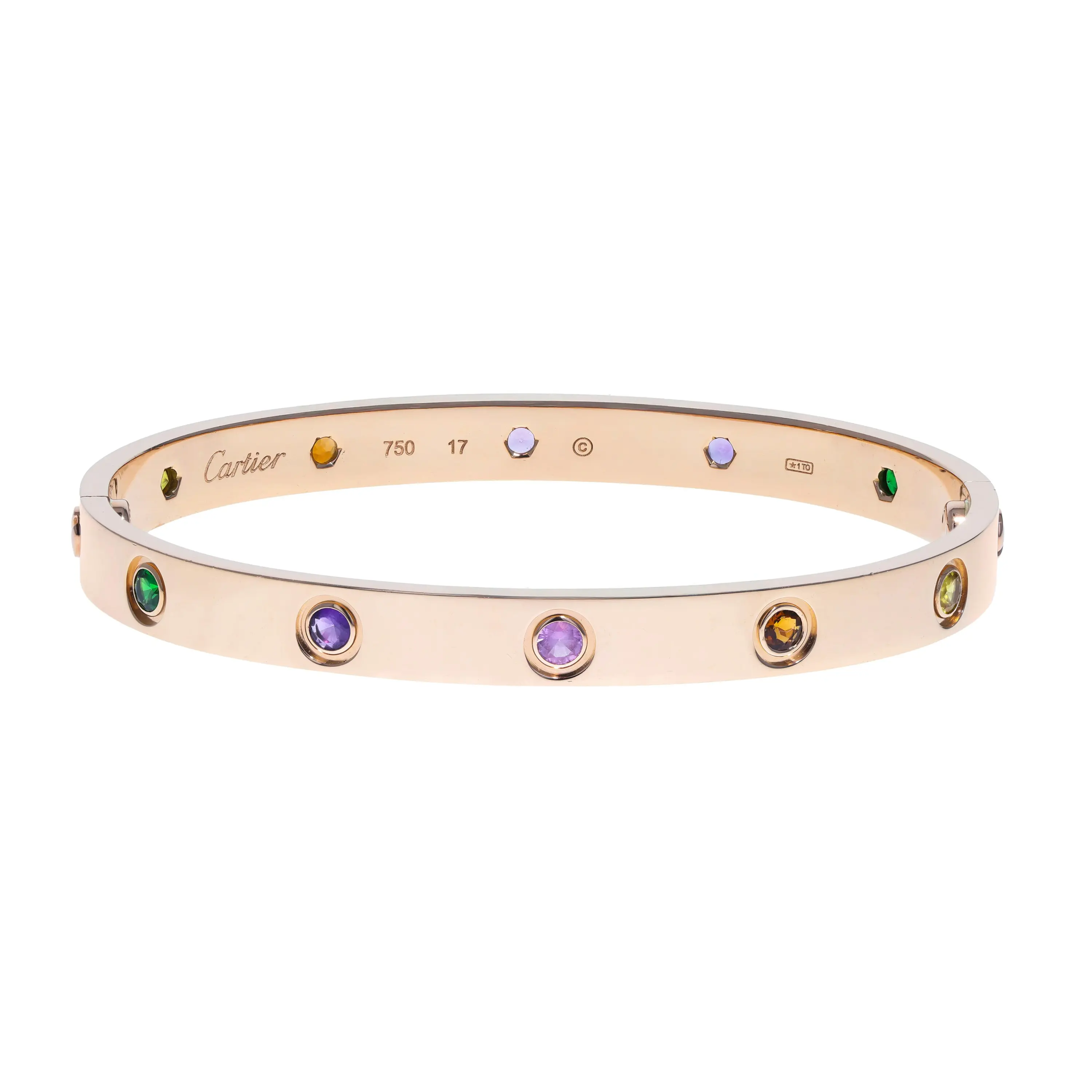 Pre-owned Cartier 18k rose gold and gemstone bangle bracelet from the Love collection. The bracelet features 10 bezel-set round multi-colored gemstones evenly spaced around the outside of the bangle. This piece is in a size 17 and comes with the original papers.