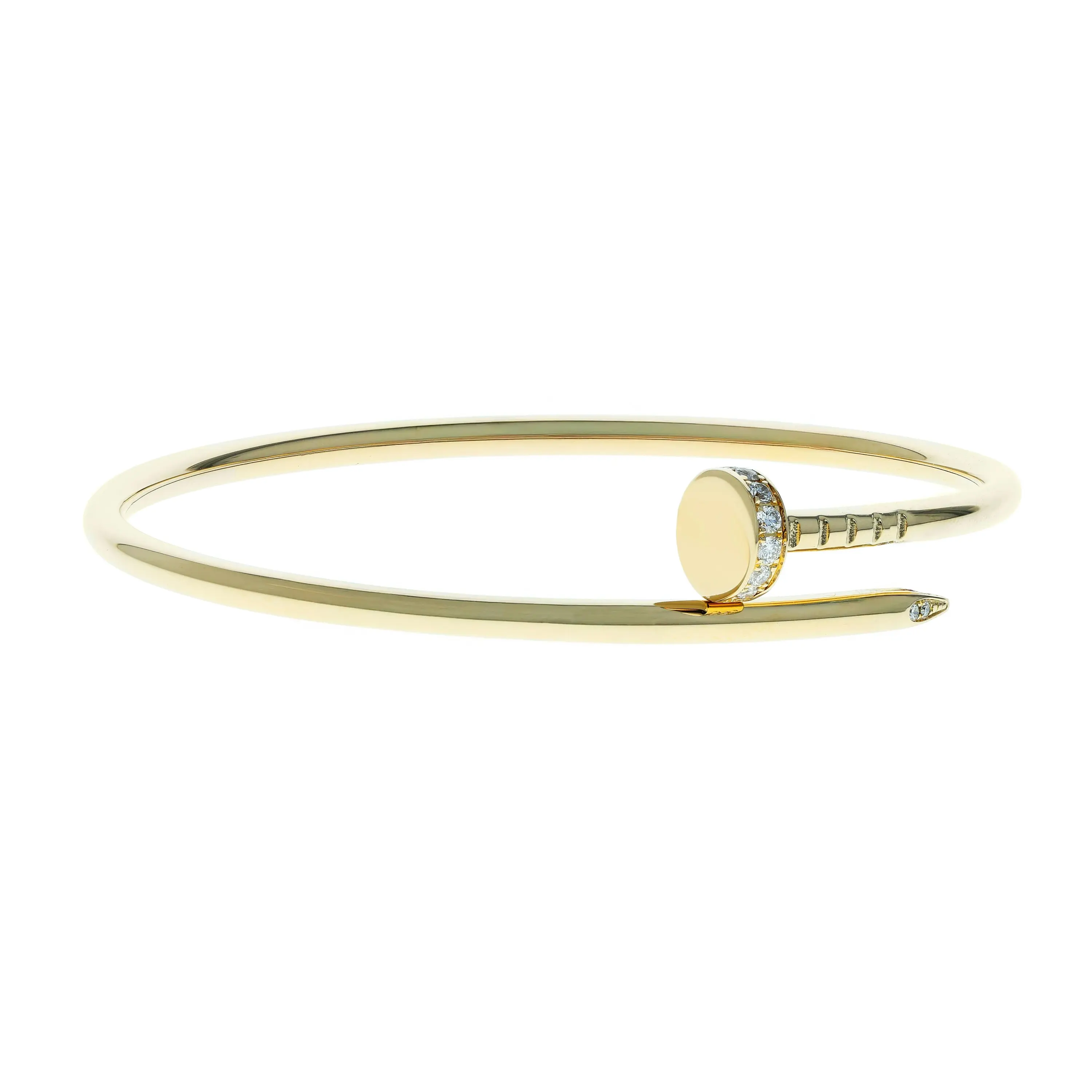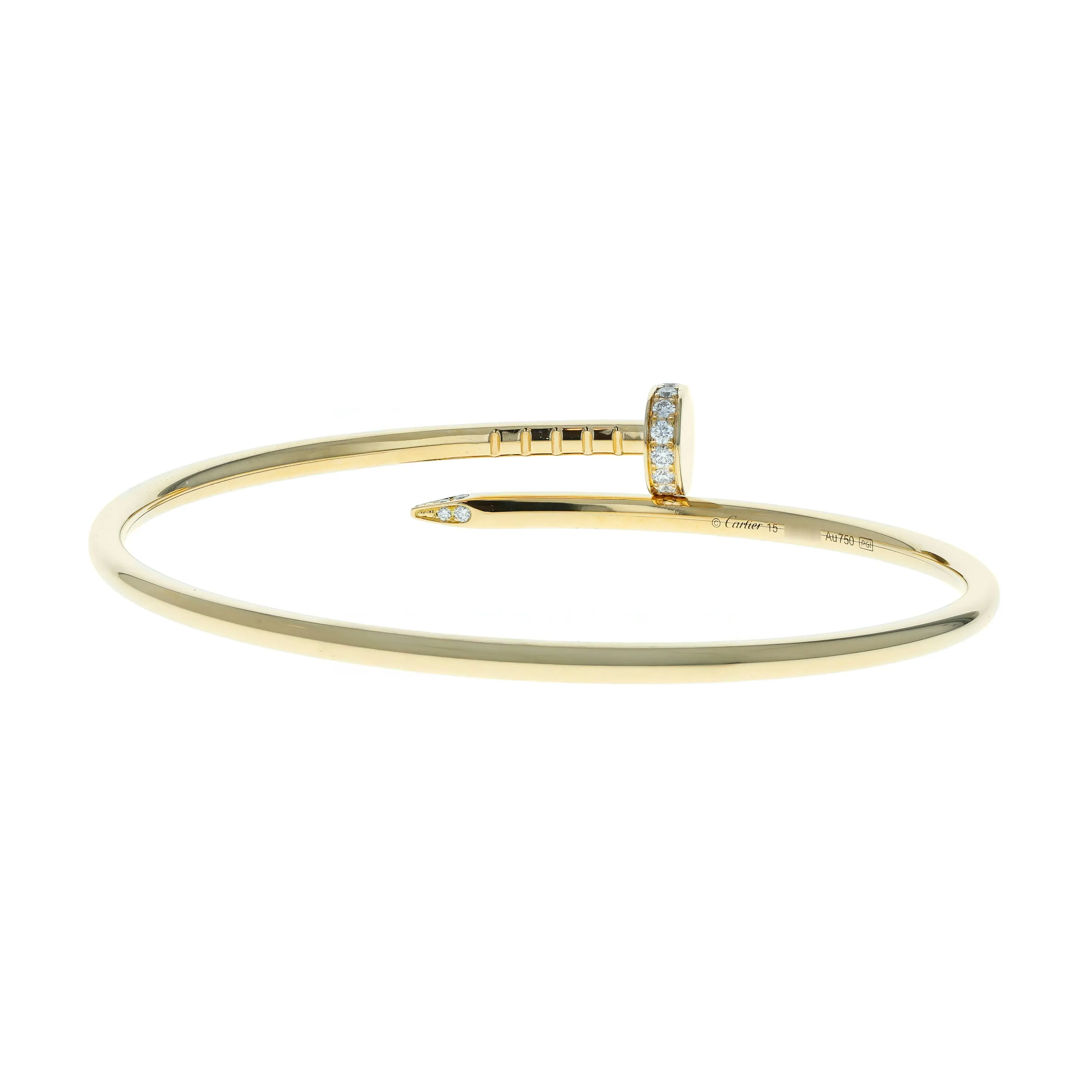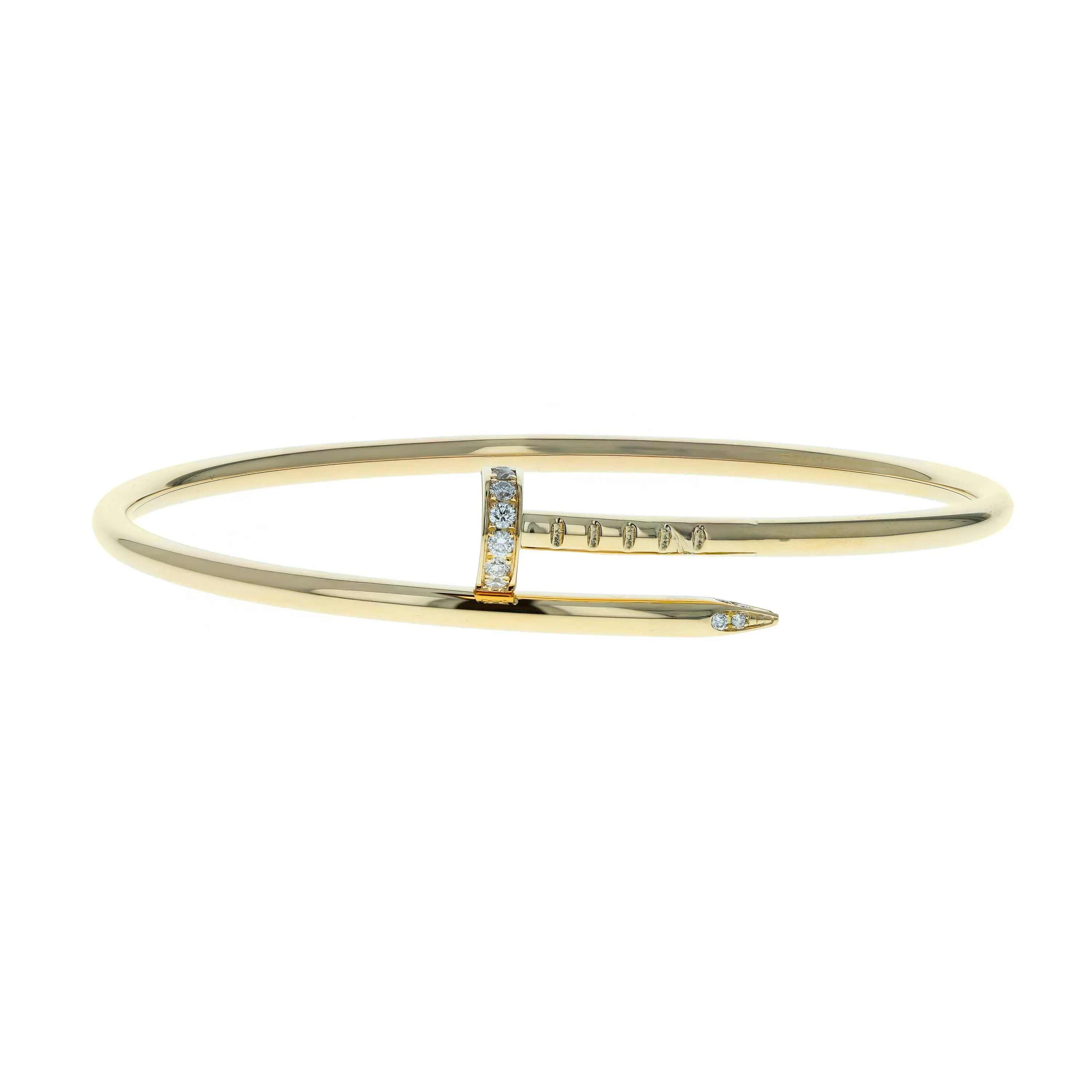 Pre-owned Cartier 18k yellow gold and diamond bangle bracelet from the Juste Un Clou collection. This small model bracelet features the signature nail design with a flexible tube that wraps once around the wrist. Both ends of the bangle are accented with round brilliant diamonds. This piece is in a size 15 and comes with the original papers.