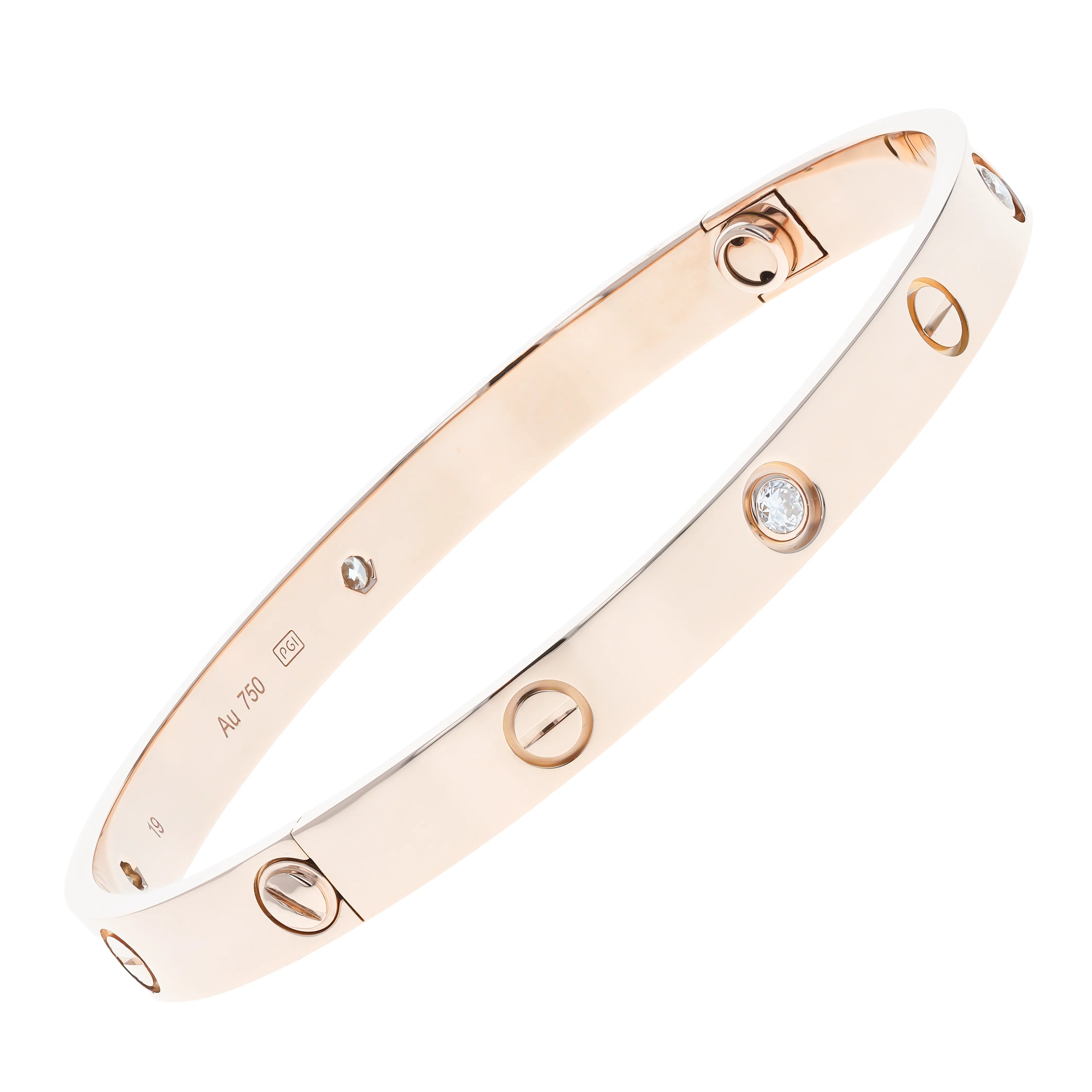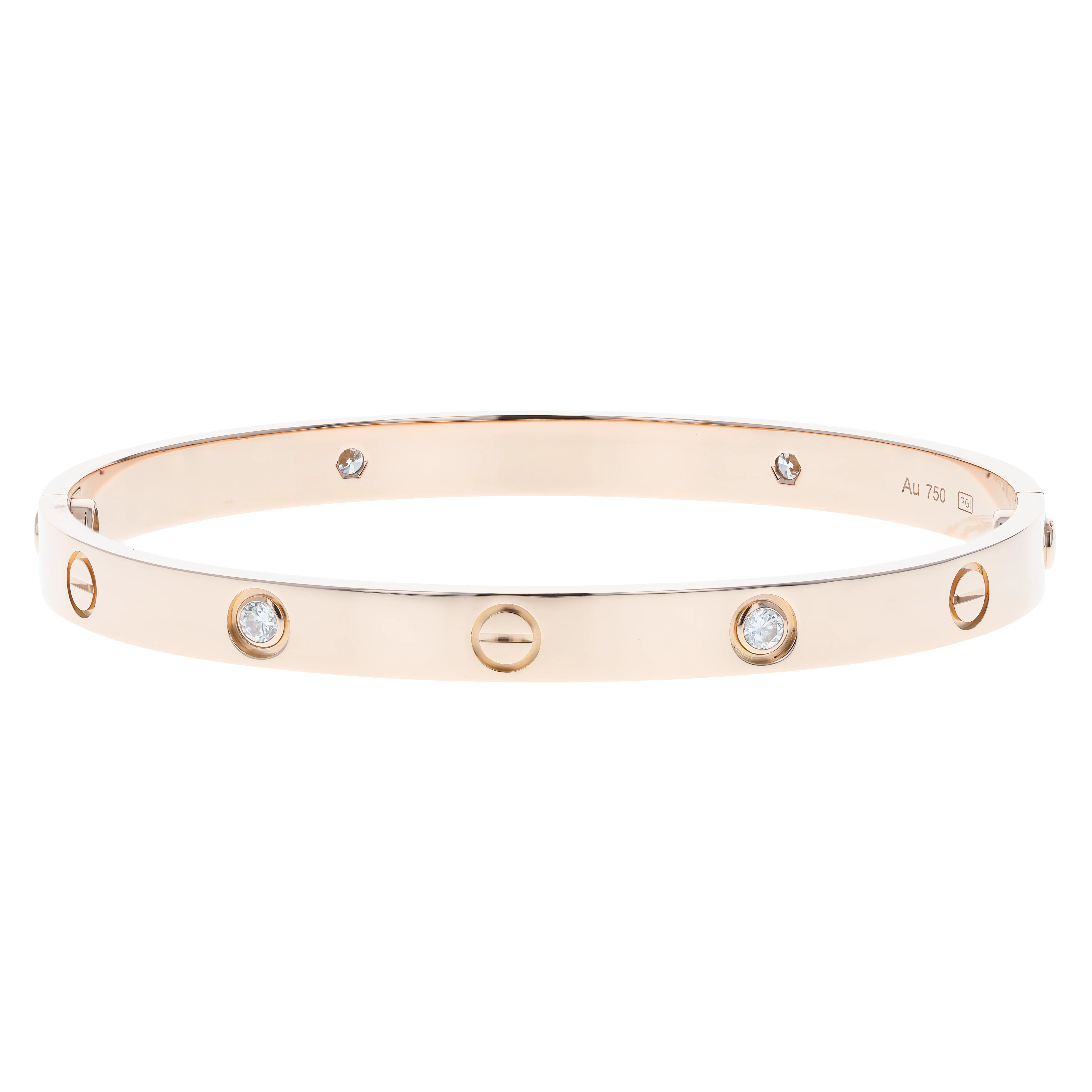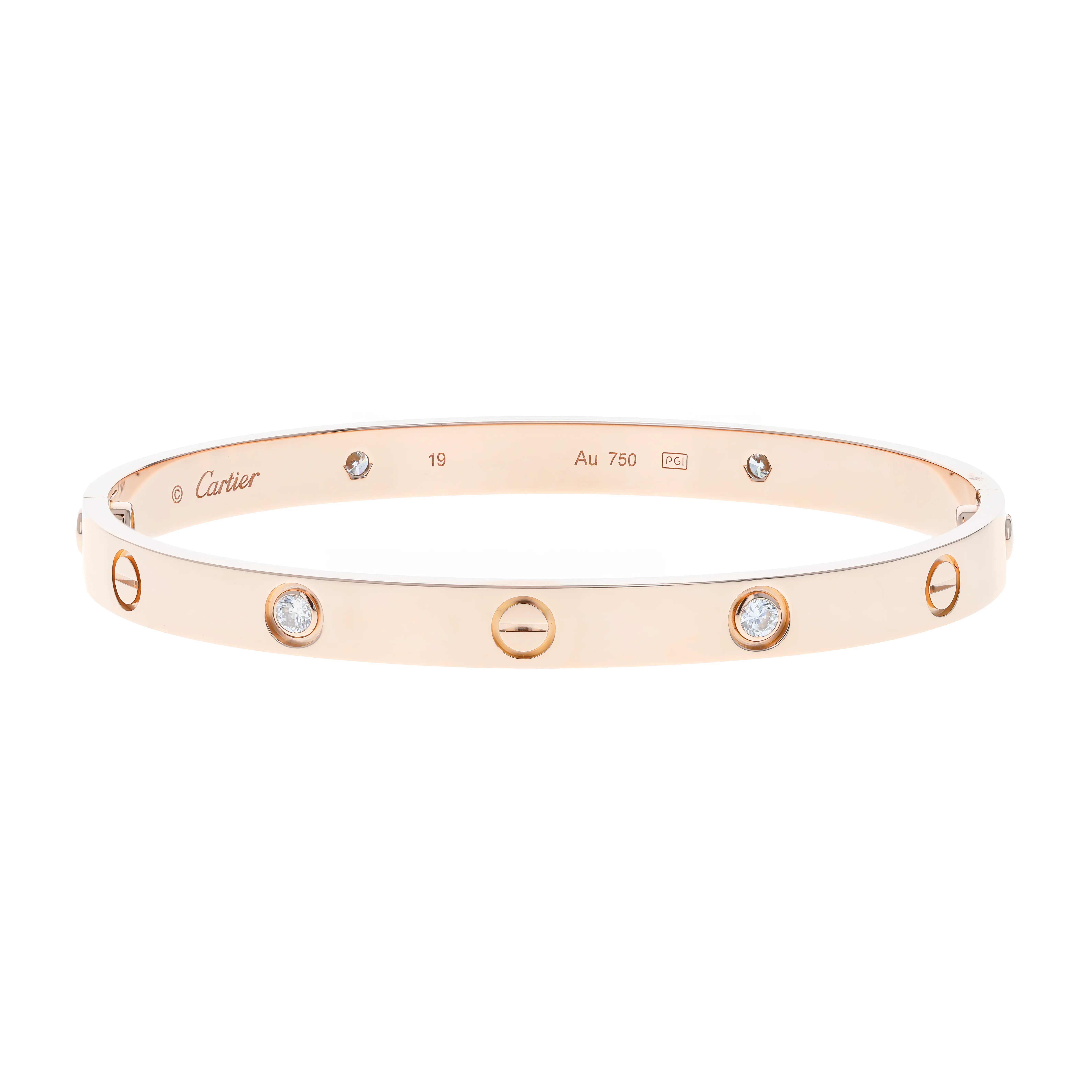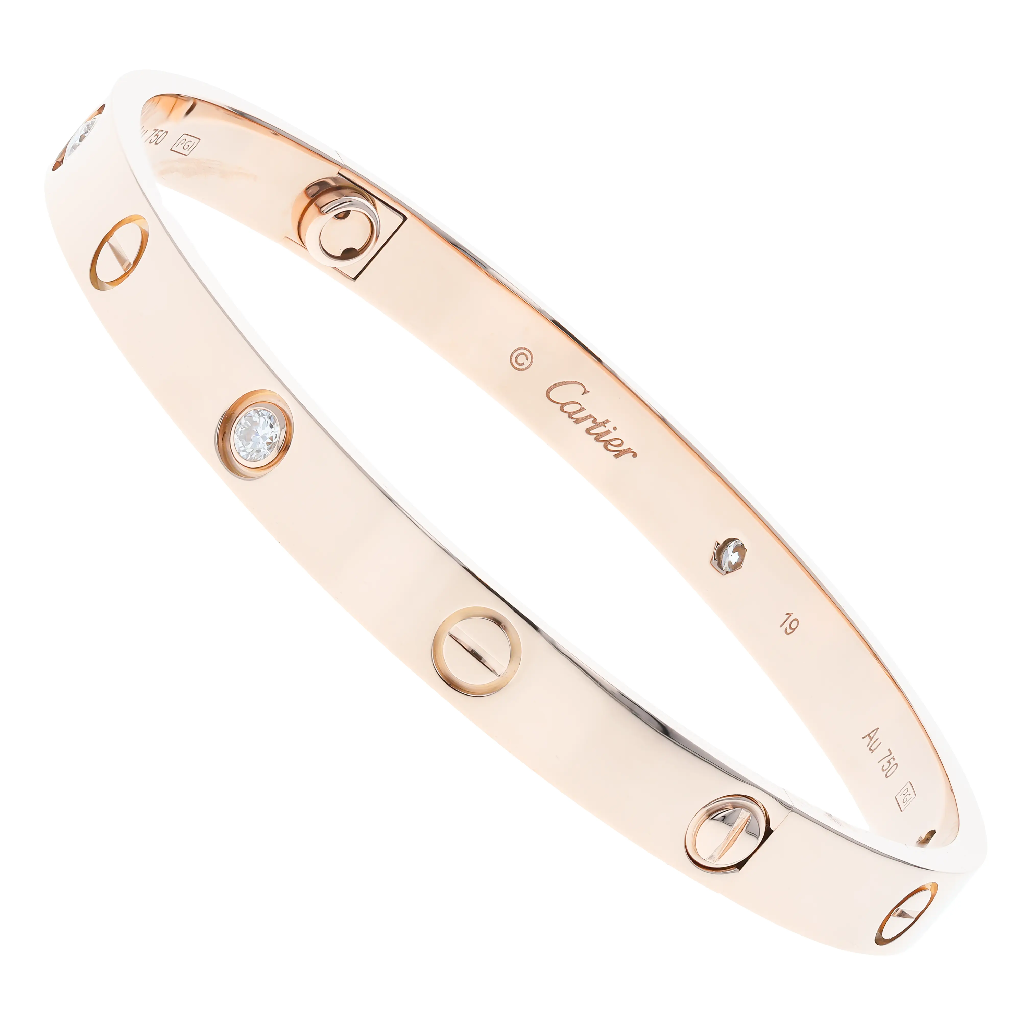 Pre-owned Cartier 18k rose gold and diamond bangle bracelet from the Love collection. The bracelet features four bezel-set round brilliant diamonds alternating with the signature screw design, evenly spaced around the outside of the bangle. This piece is in a size 19 and comes with the original box and papers.
