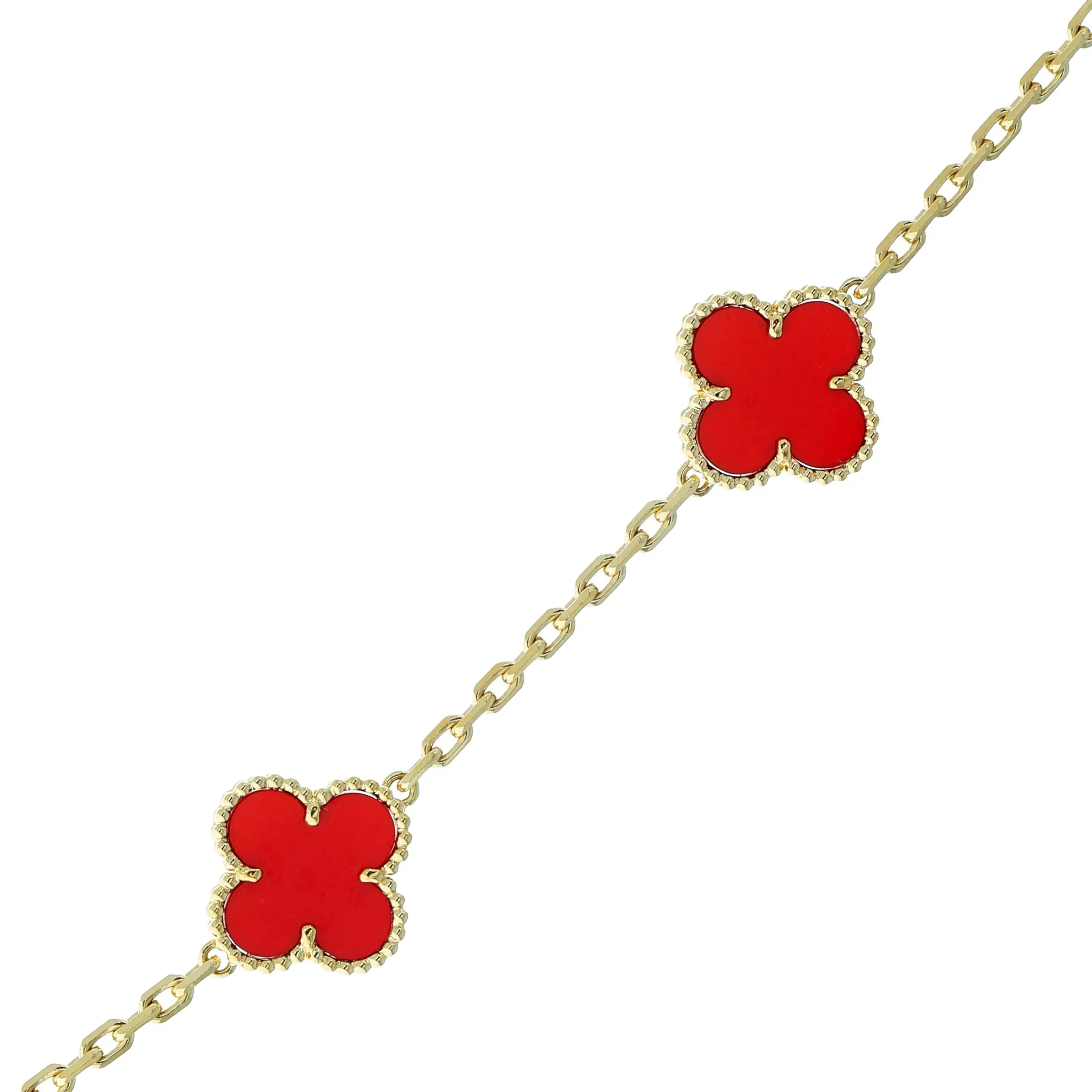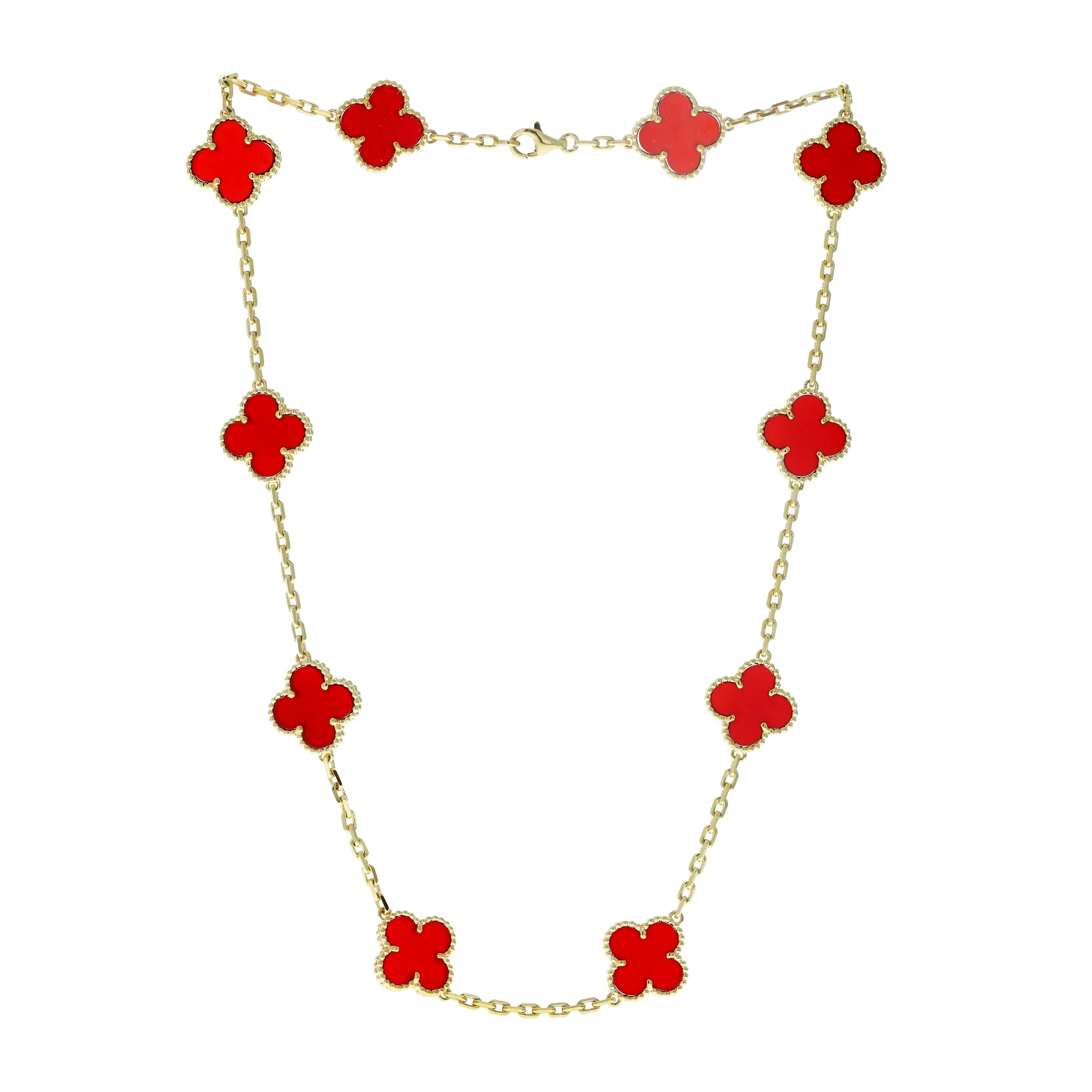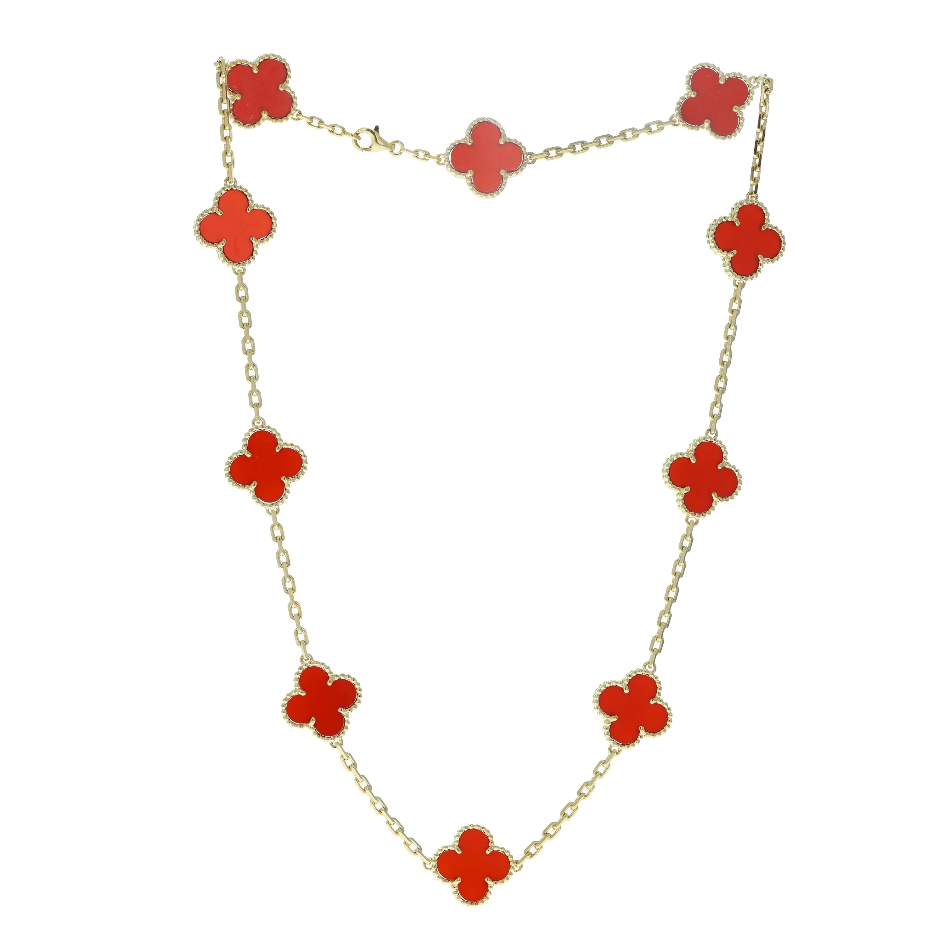 Pre-owned Van Cleef & Arpels 18k yellow gold and carnelian necklace from the Vintage Alhambra collection. The necklace features ten signature four petal motifs each set with a carnelian stone. The motifs are evenly spaced along an 18k yellow gold cable-link chain that measures 17 inches in length and is secured with a lobster clasp.