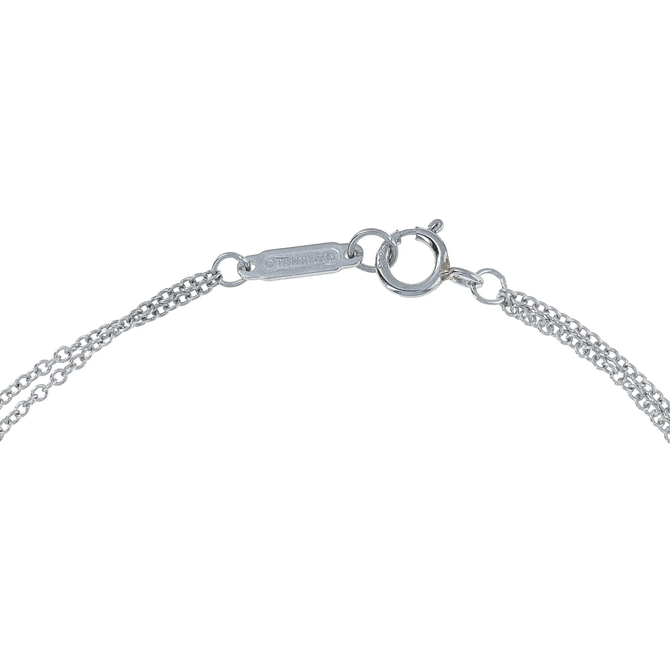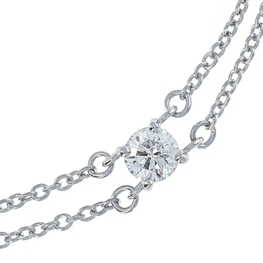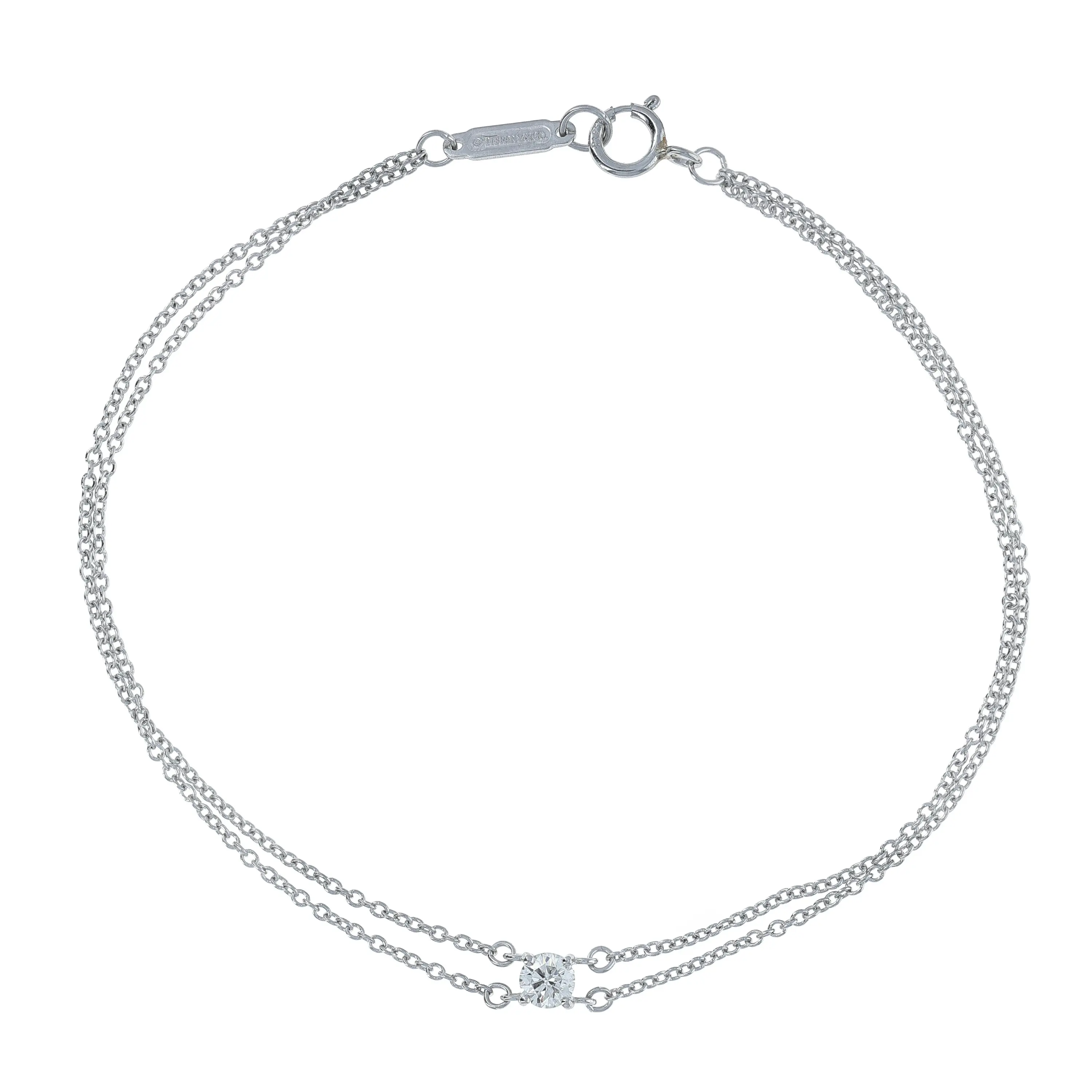 Pre-owned Tiffany & Co. platinum and diamond bracelet from the Tiffany Solitaire collection. The bracelet features a single round brilliant diamond that is secured in a four prong setting. The diamond is stationed at the center of a platinum double row cable-link chain that measures 7 inches in length and is secured with a spring ring clasp. This piece comes with the original box.