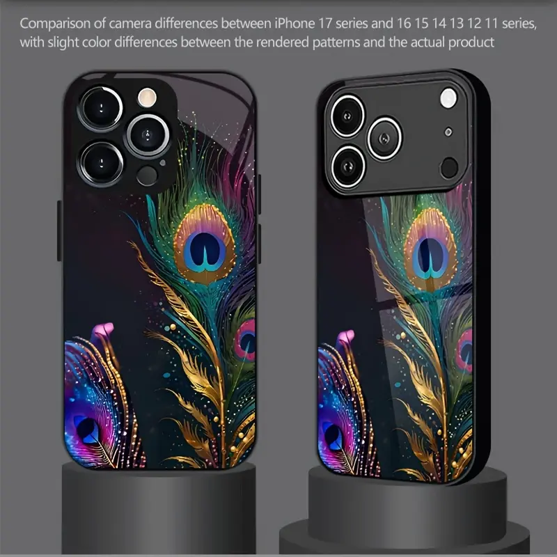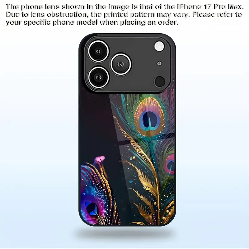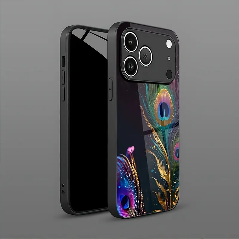Phone case: Peacock Feather Colorful Shimmering Print Pattern Elegant Style Tempered Glass Phone Case with Minimalist Design, Compatible for iphone17 17Air 16 Pro 15 Promax 14 Plus 13 12 11