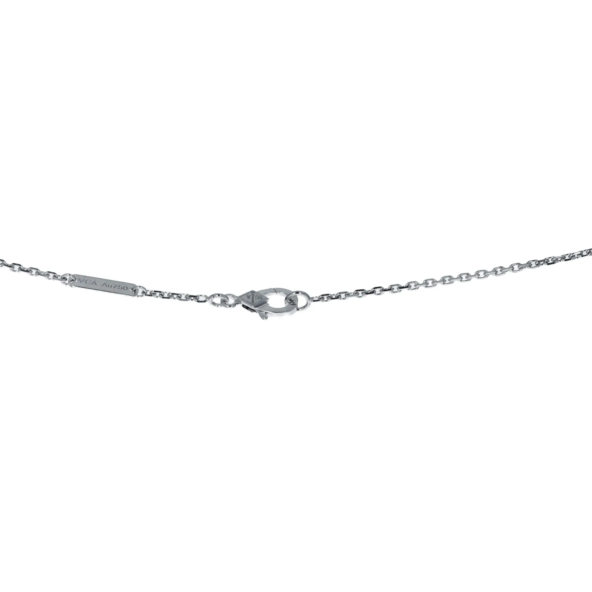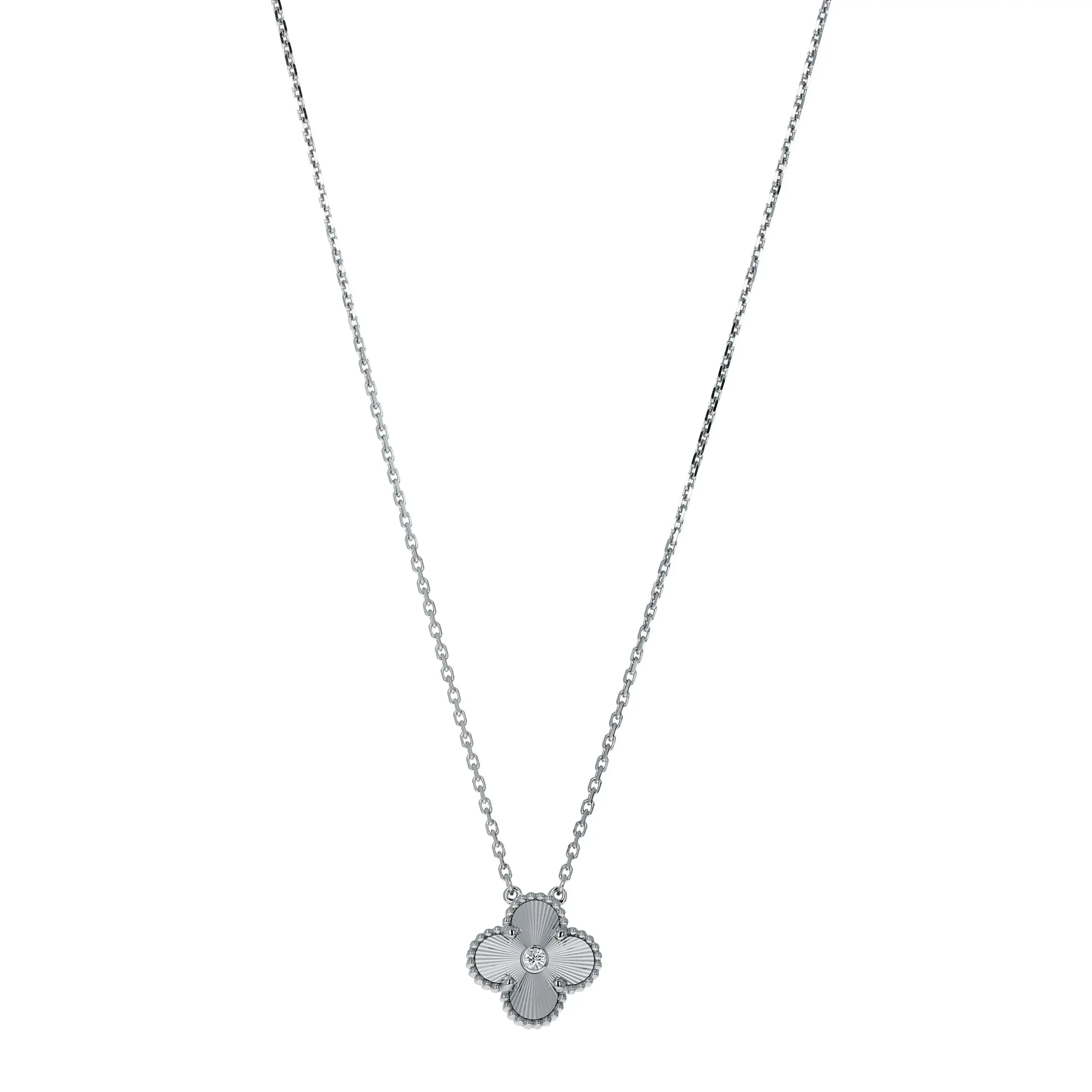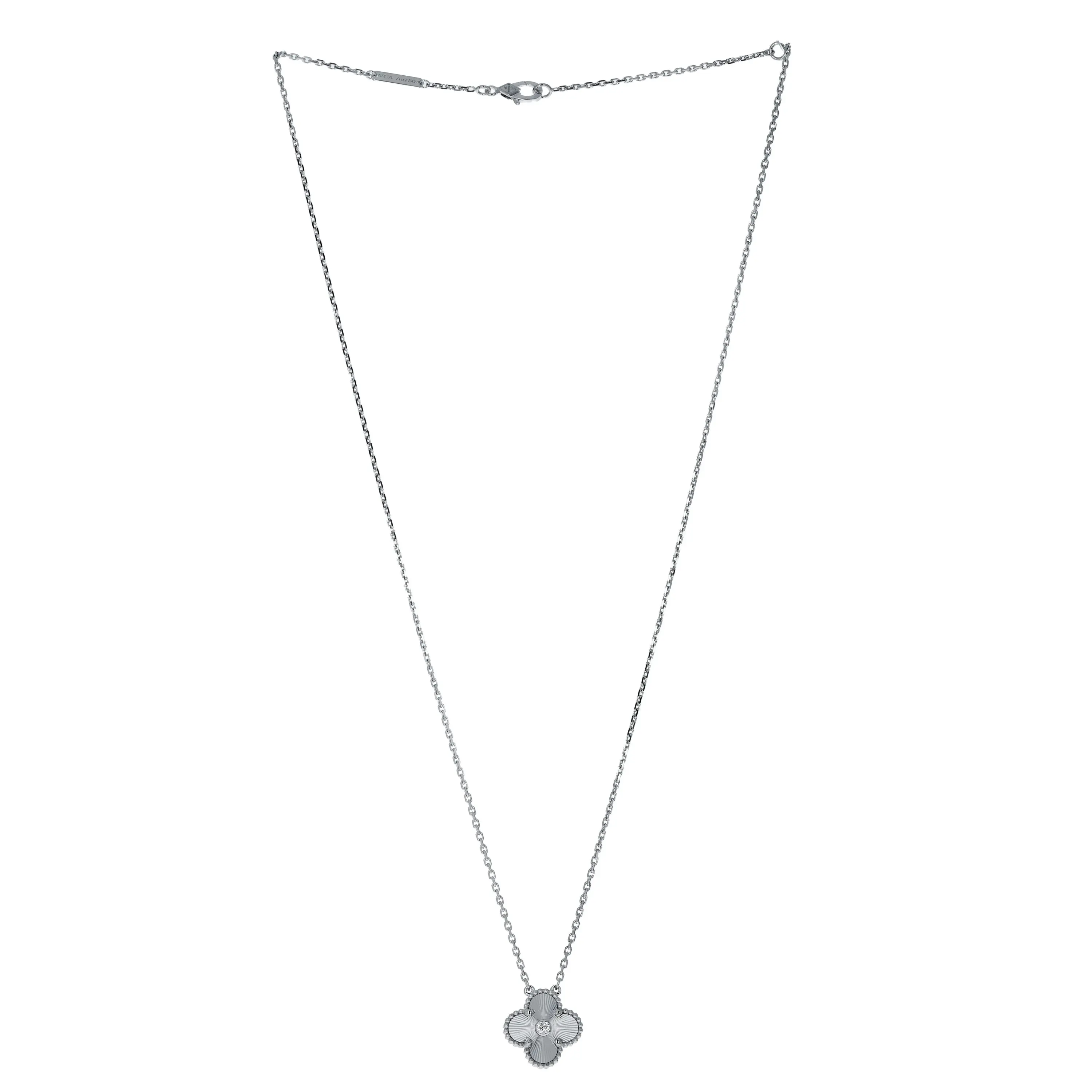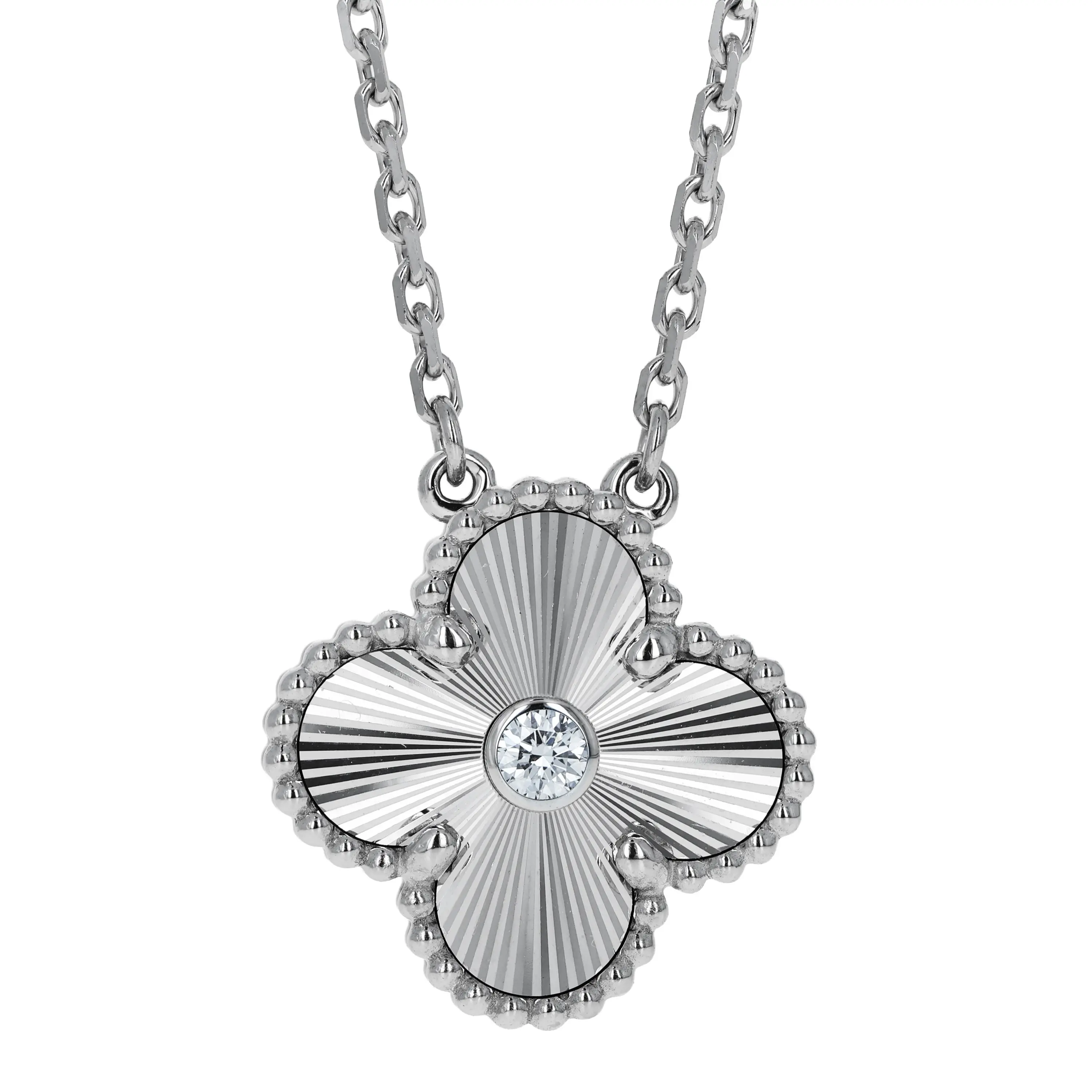 Pre-owned Van Cleef & Arpels 18k white gold and diamond pendant necklace from the Holiday 2020 Vintage Alhambra collection. The necklace features a single signature four petal motif pendant that is set with a guilloche design pattern and one bezel-set round brilliant diamond in the center. The pendant is stationed at the center of an 18k white gold cable-link chain that measures 18.25 inches in length an is secured with a lobster clasp. This piece comes with the original papers.